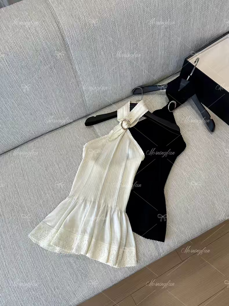천 골드 센스 허리 수축 나비 매듭 디자인 센스 드레스 여름 새로운 허리 수축 슬림해 보이는 검정색 멜빵 스커트