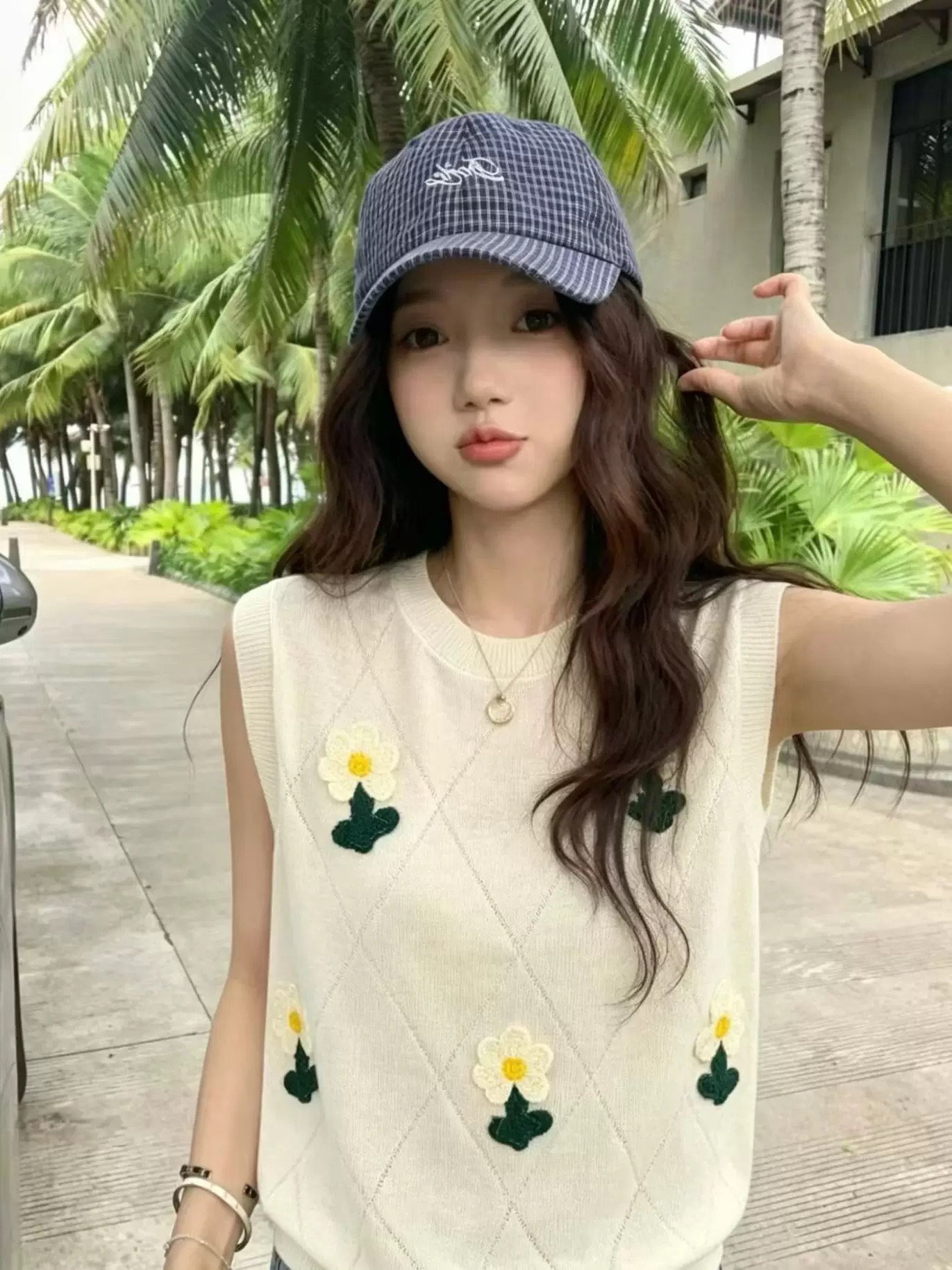 3 차원 꽃 홀로우 아웃 링 체크무늬 니트 조끼 2026 여름 새로운 여성 프랑스식 부드러운 연령 감소 다용도 맨위