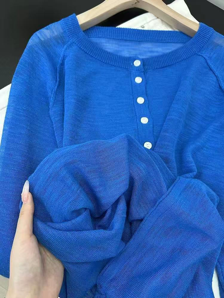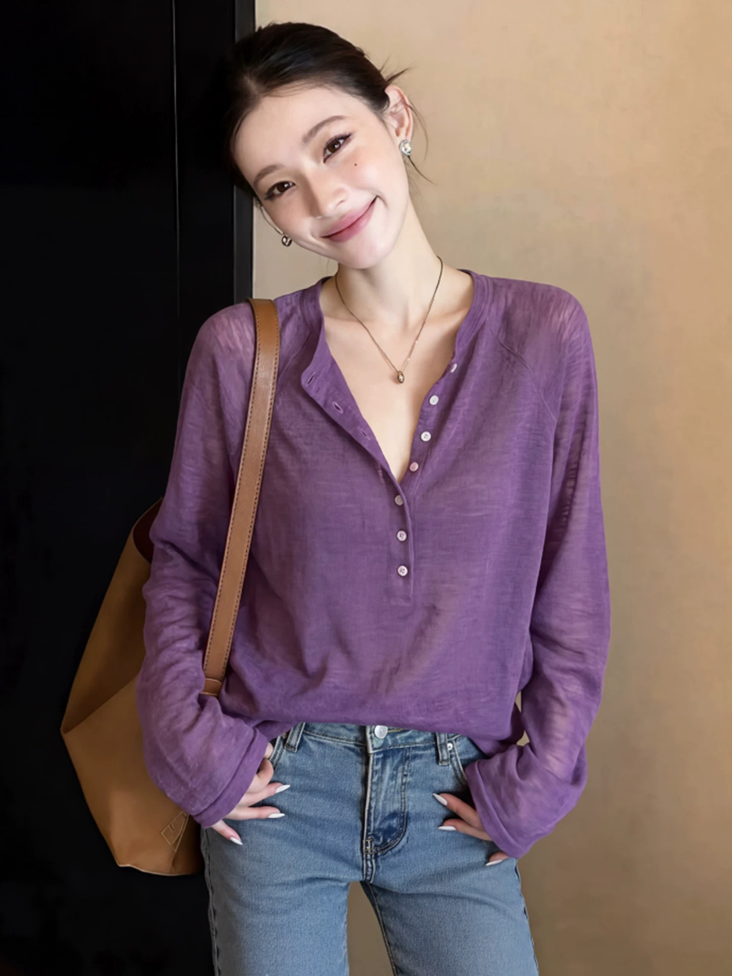 작은 키 보라색 헨리 칼라 긴팔 니트 블라우스 여성 여름 Tulle 외부 가져 가라. 느긋한 바람 루즈핏 자외선 차단 맨위