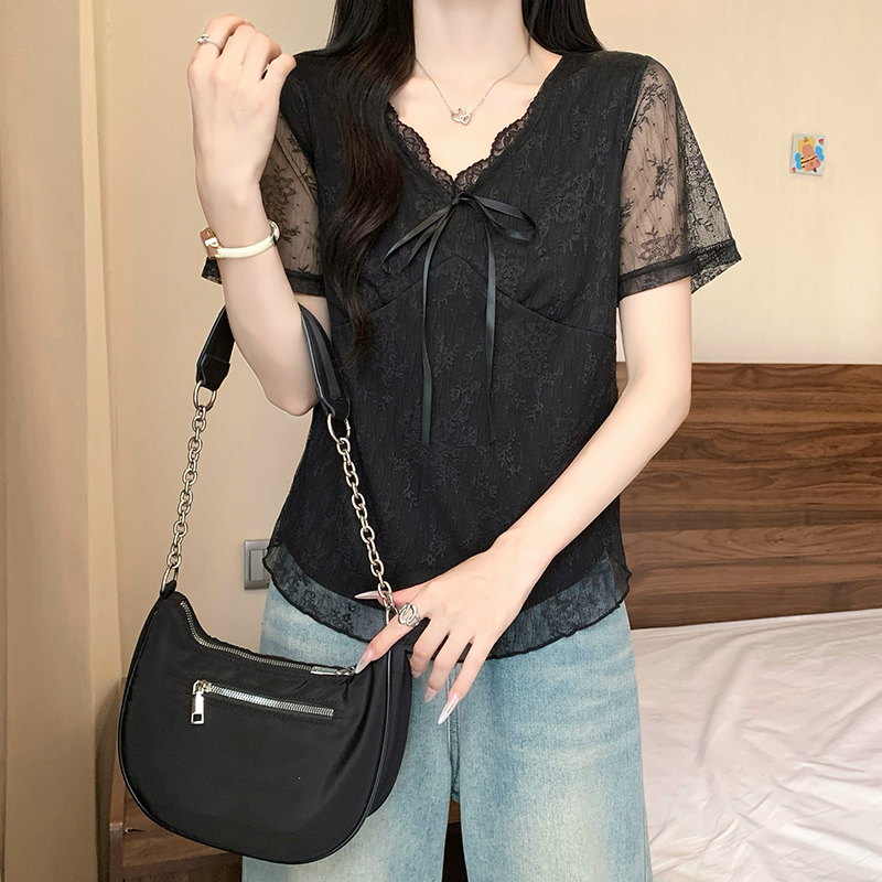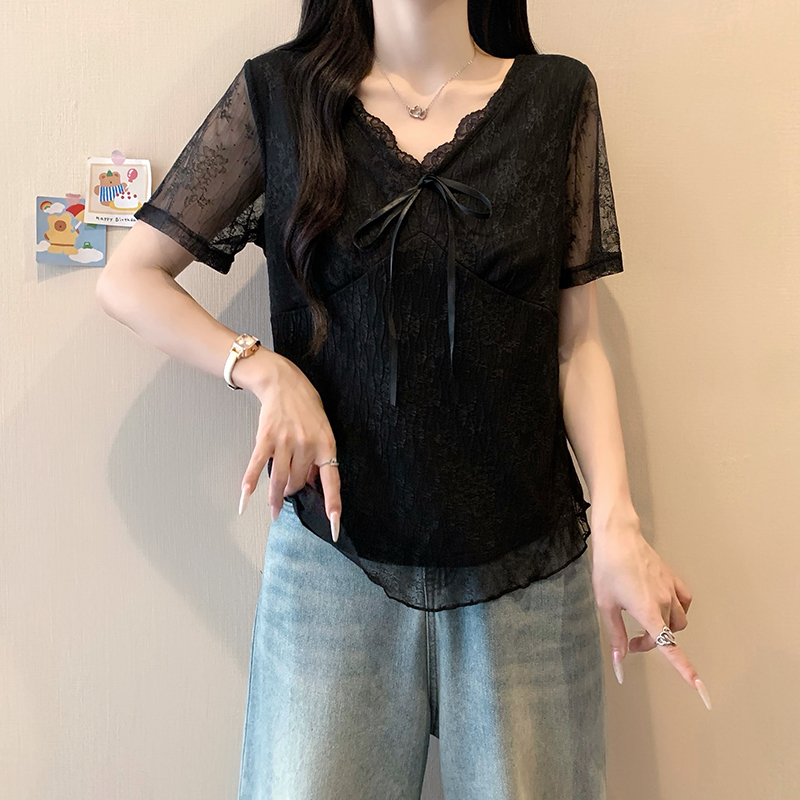 실사 정가 여름 새로운 빅 사이즈 긍정적 인 어깨 슬림해 보이는 페이크 레이어드 나비 매듭 디자인 센스 반팔 티셔츠 여성