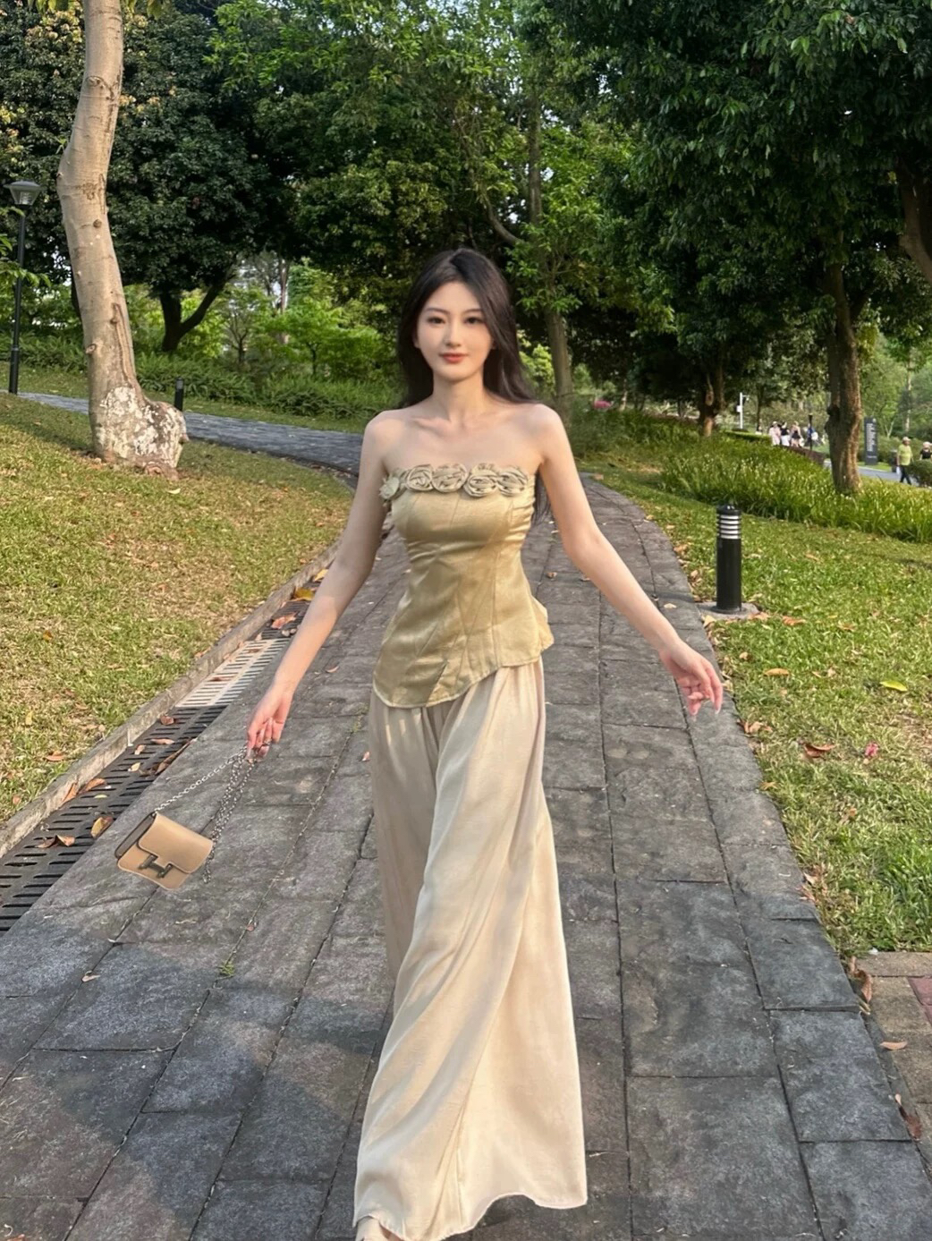 beloved 천 골드 골드 순수한 욕망 3 차원 꽃 불규칙 새로운 중식 자카드 트임 오프숄더 민소매 맨위 여성