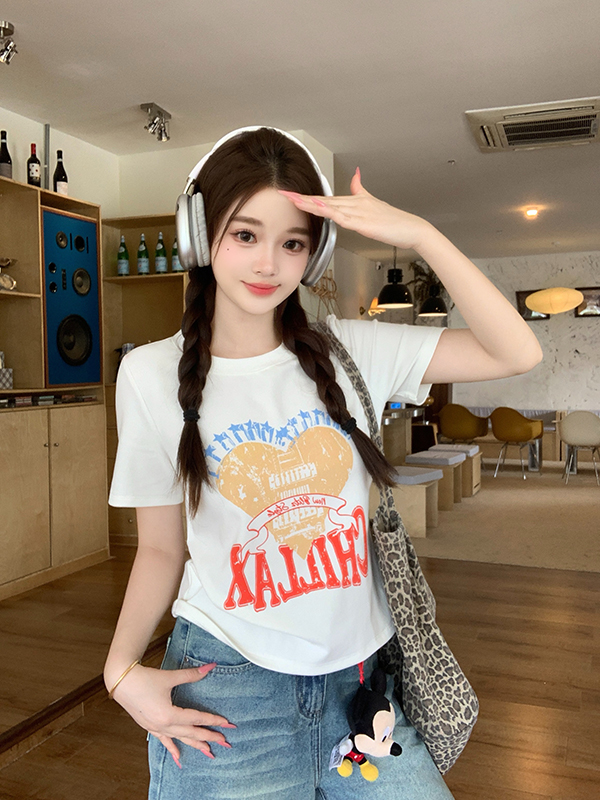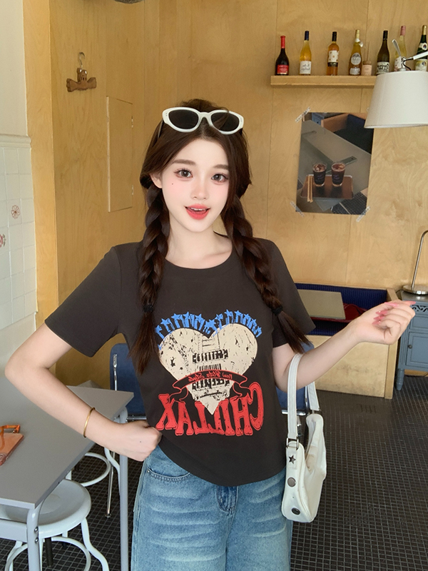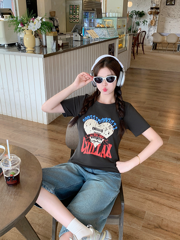 실사 정가 2026 년 빅 사이즈 여성 의류 여름 새로운 라운드 넥 하트 알파벳 프린트 반팔 티셔츠 맨위