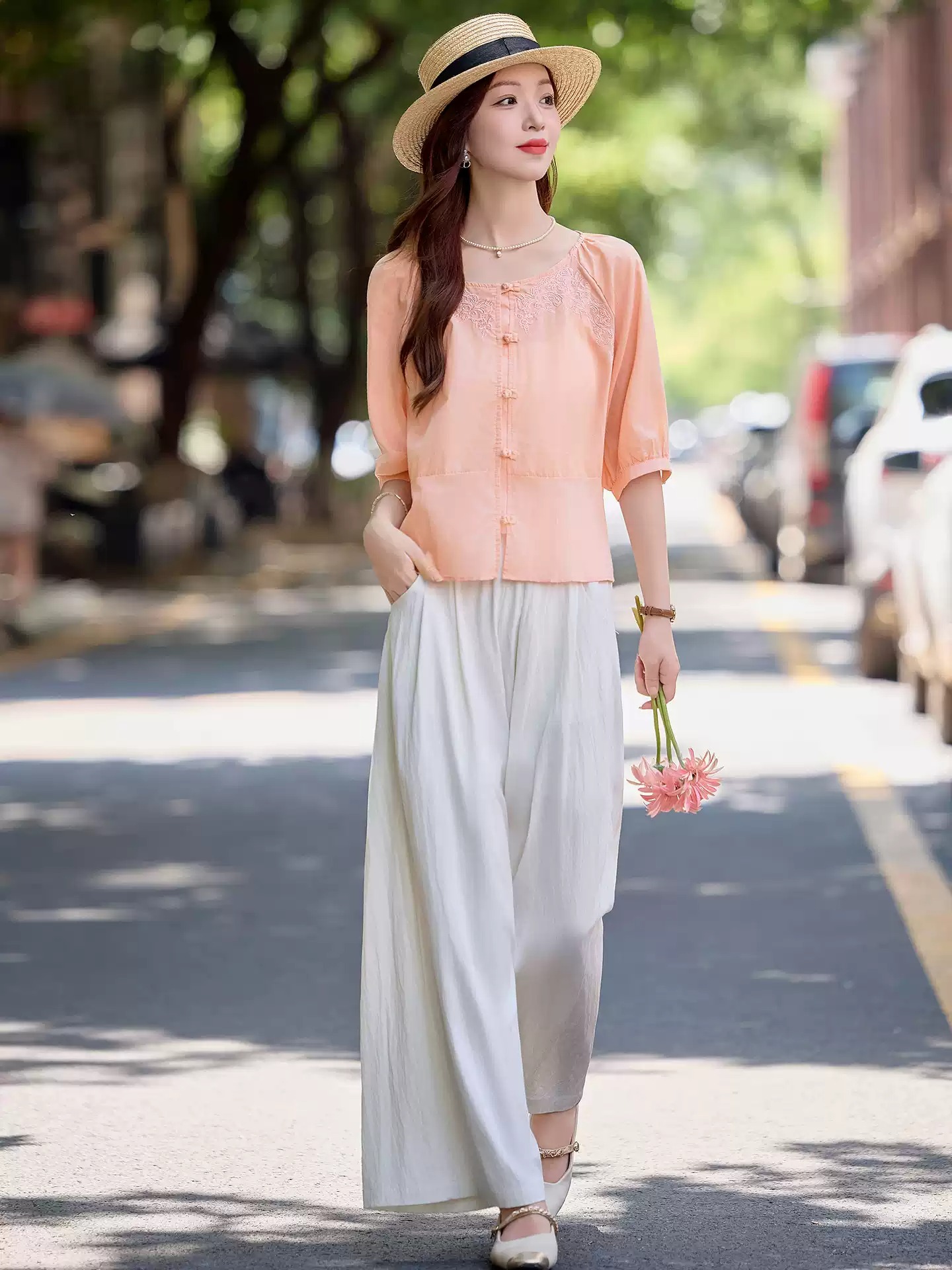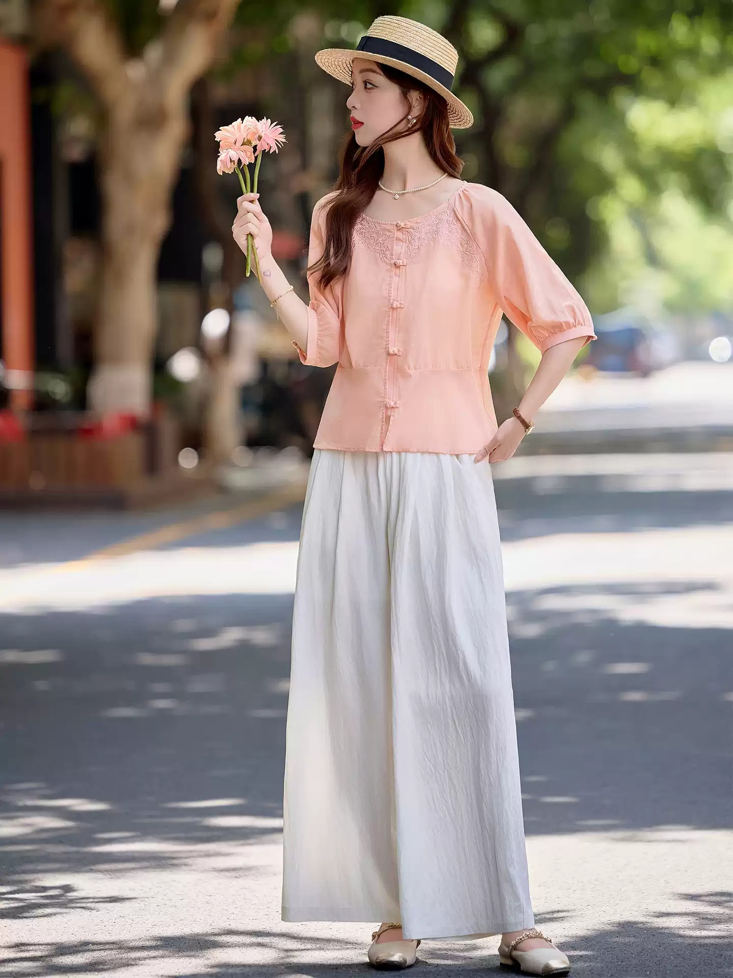 새로운 중식 면 린넨 세트 여성 여름 2026 새로운 패션 레트로 단추 자수 와이드 레그 팬츠 중년 엄마 세트