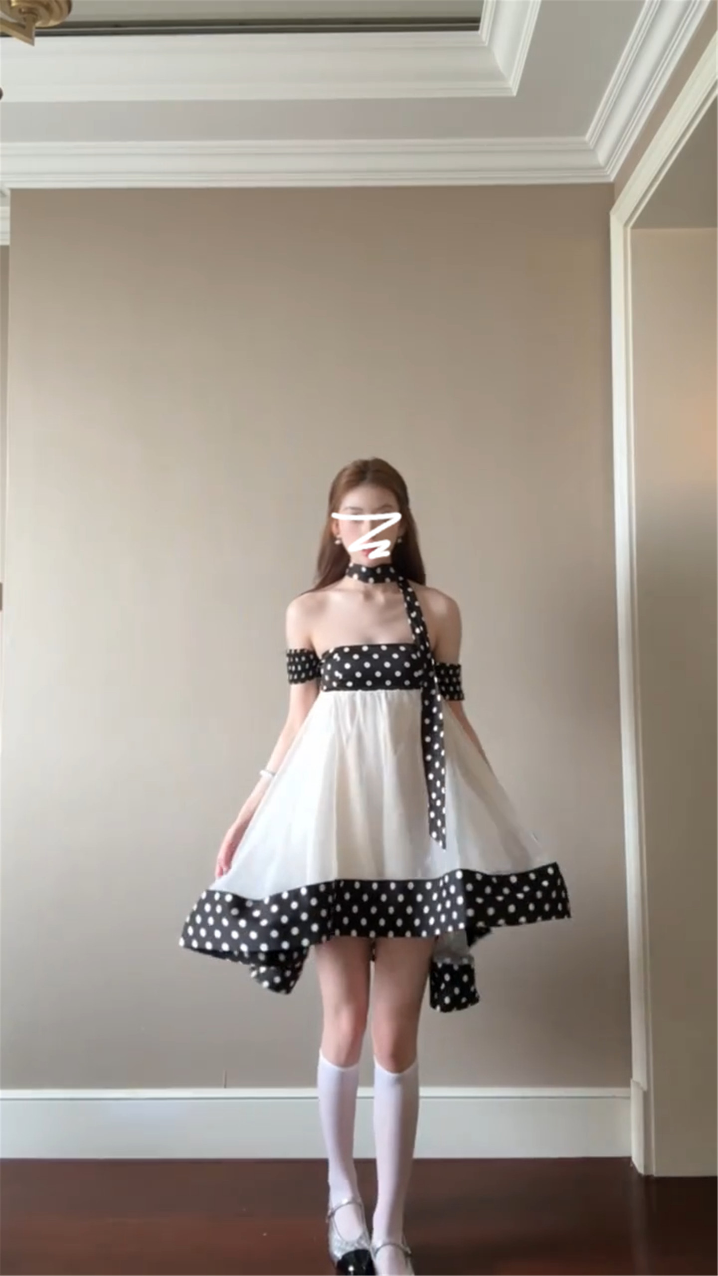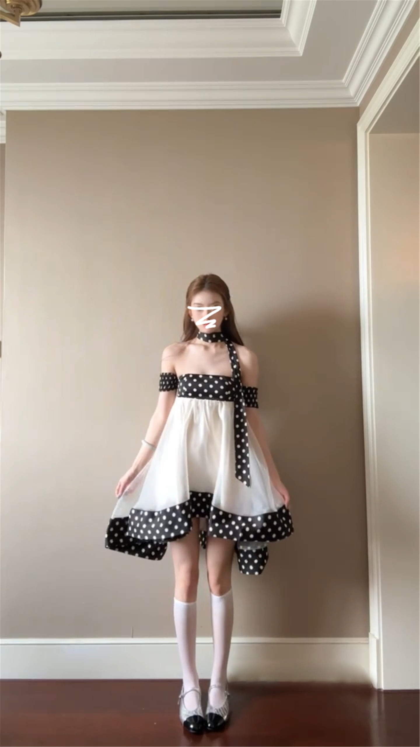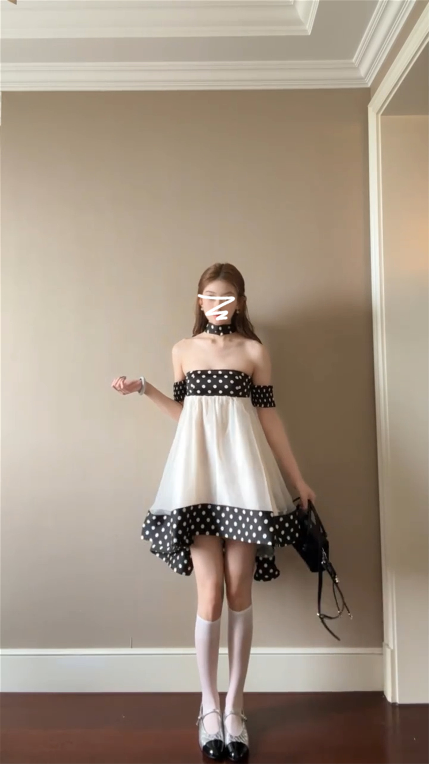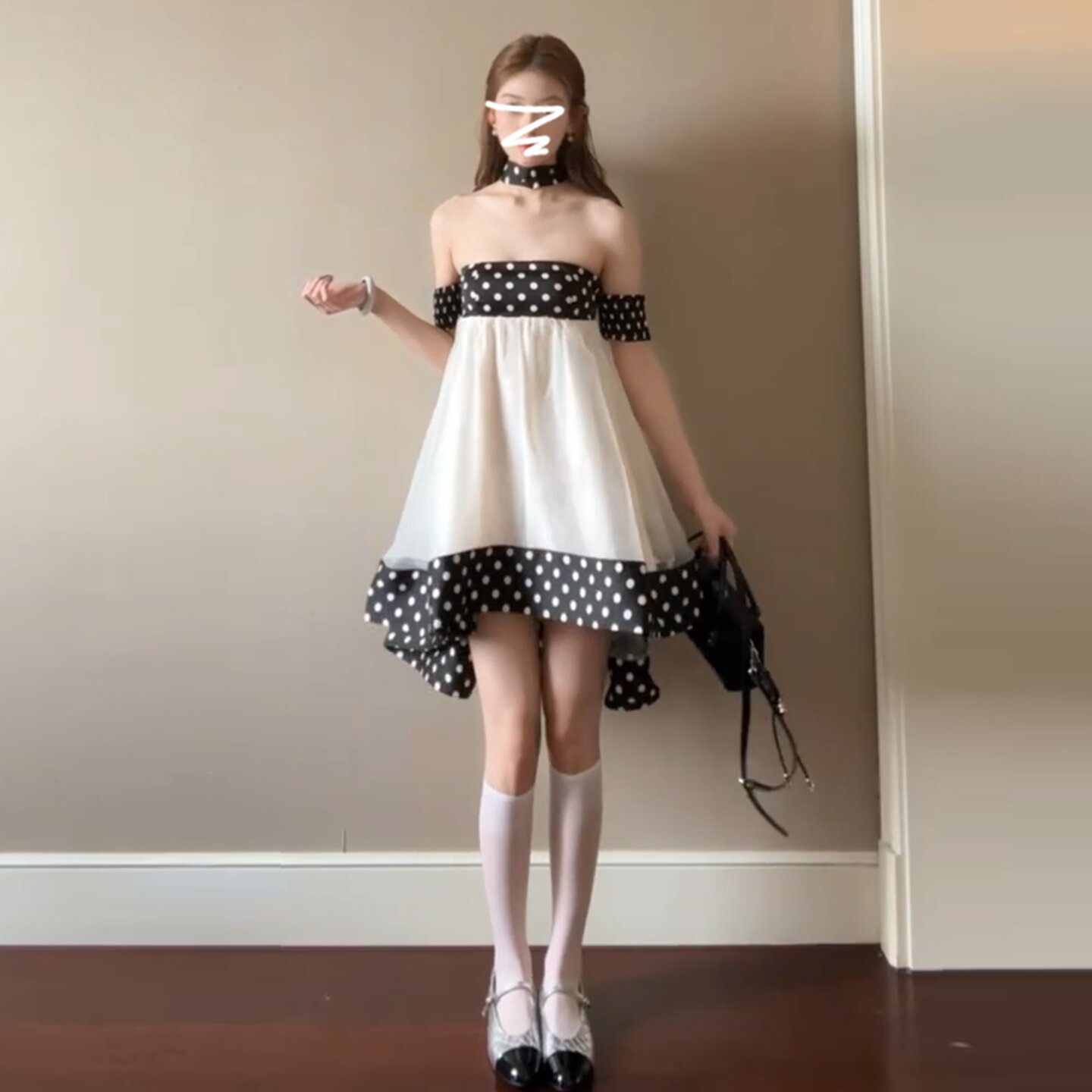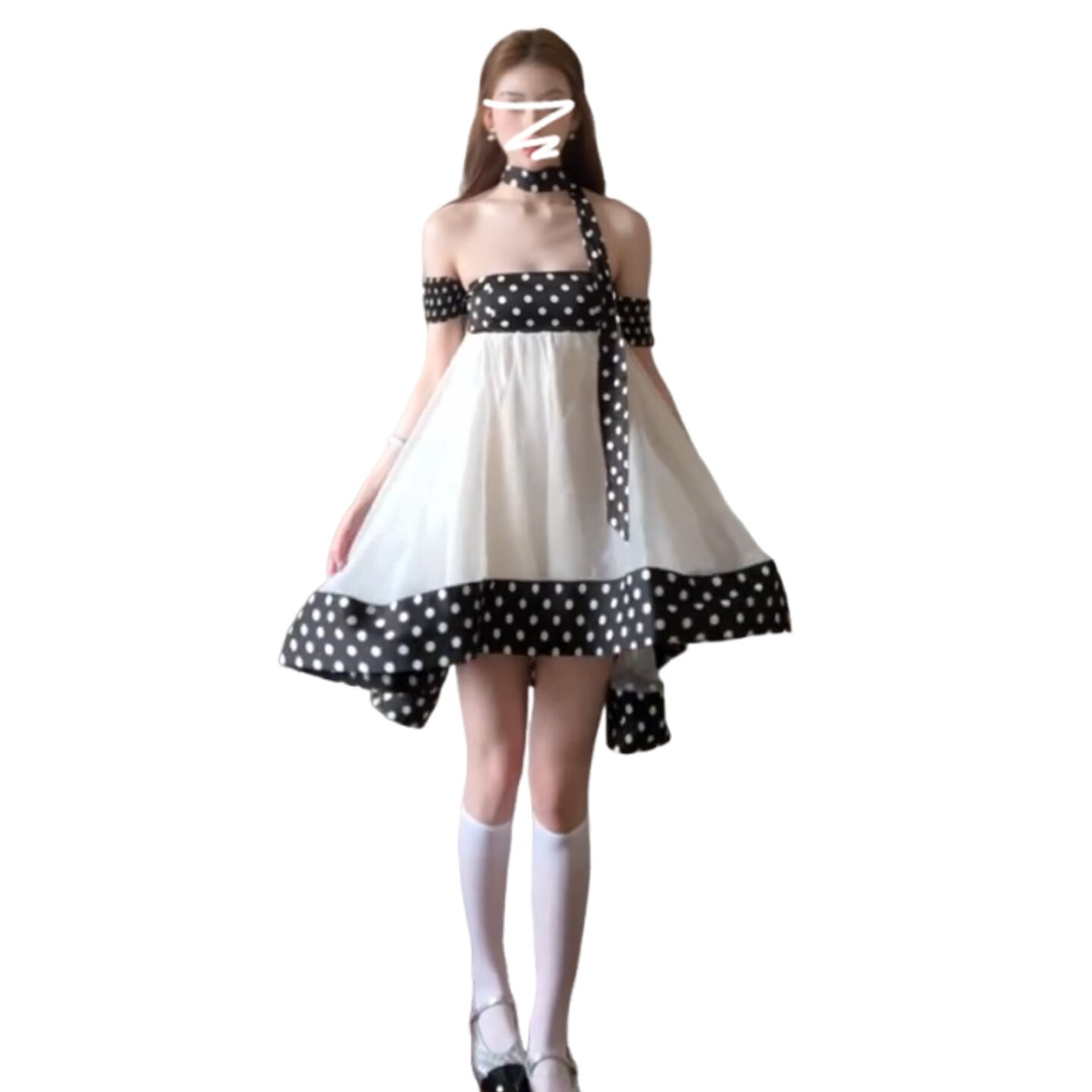 달콤함 도트 무늬 행침 목 오프숄더 여성 드레스 봄 2026 새로운 부드러운 연령 감소 인형 치마 프릴 미니 스커트
