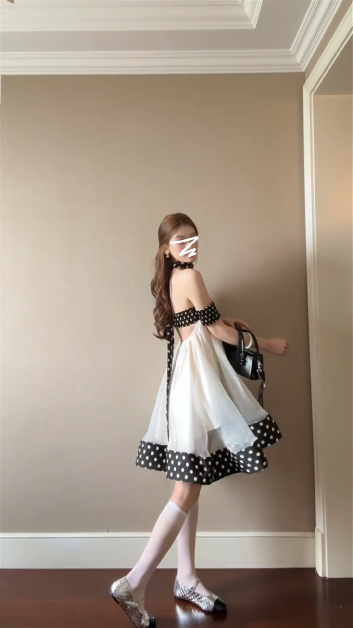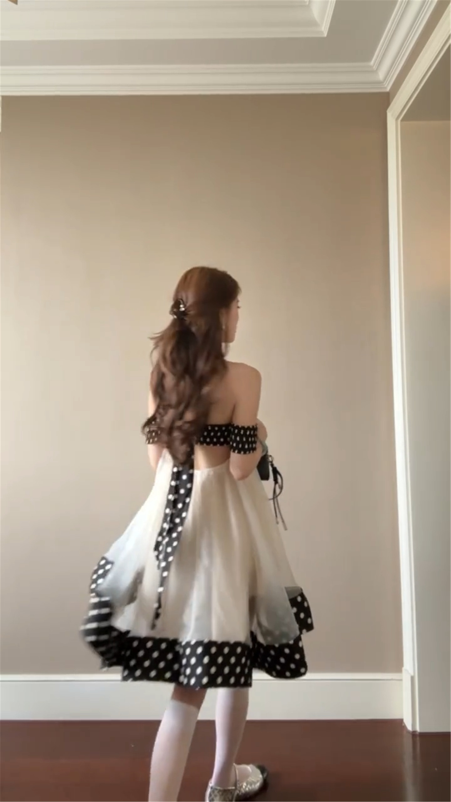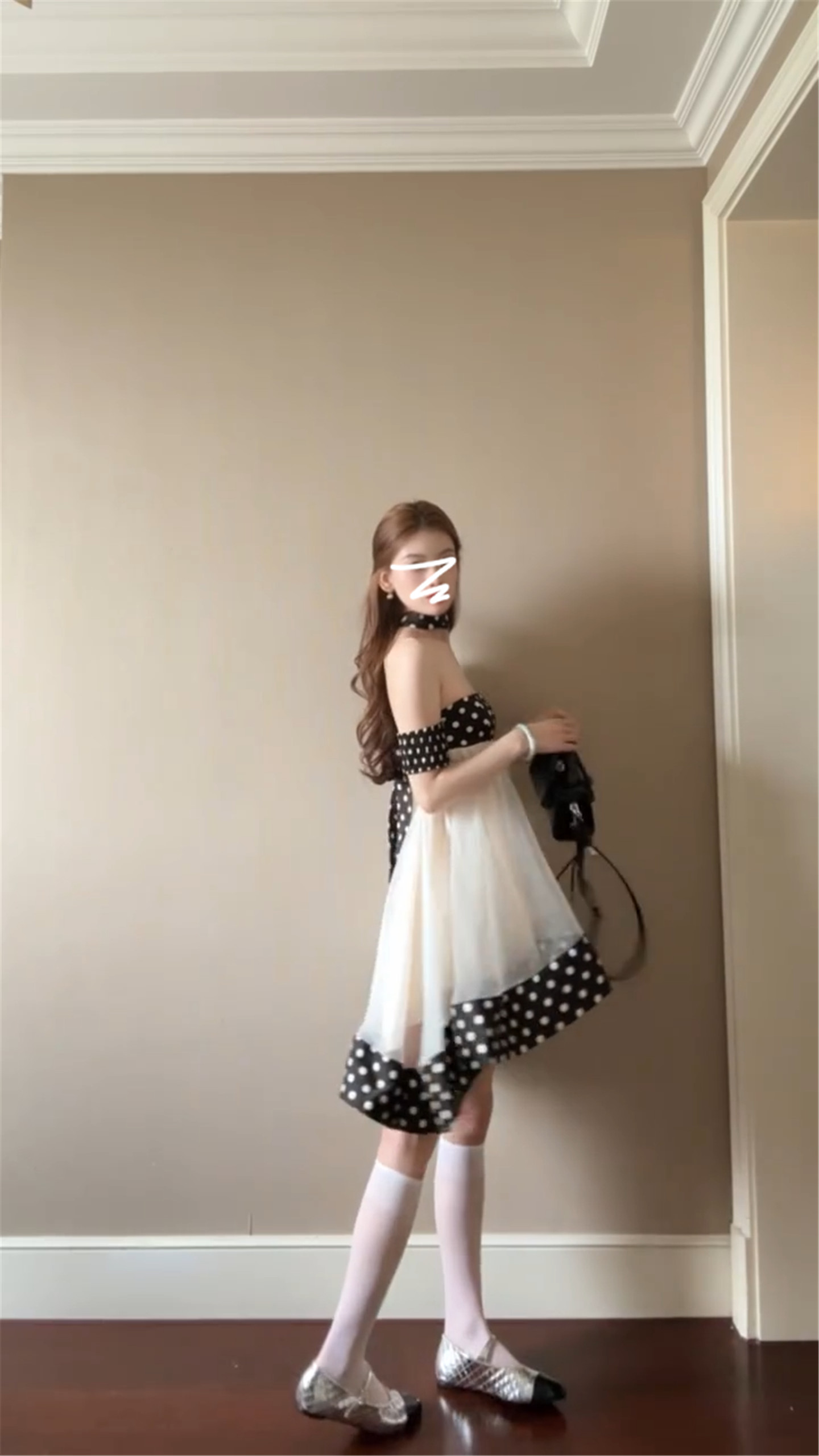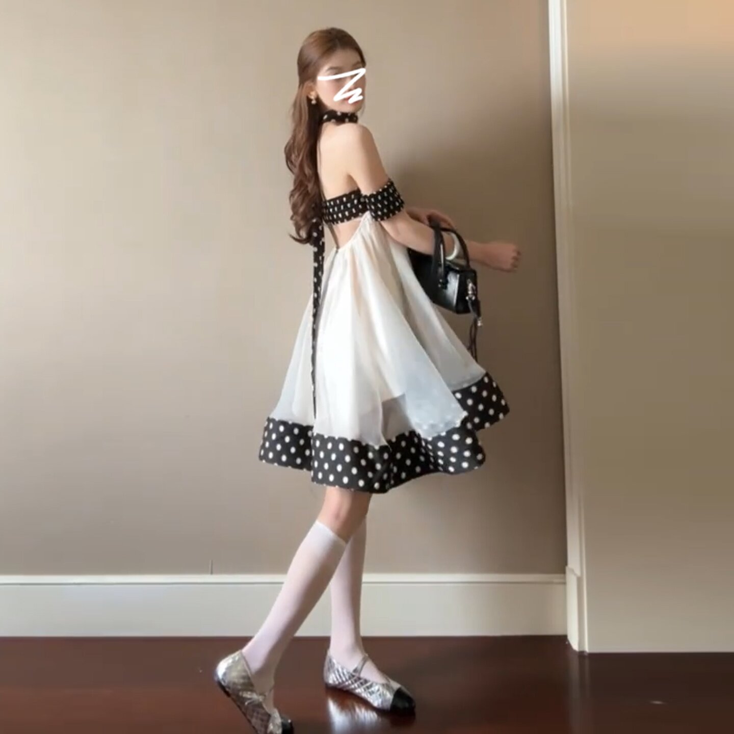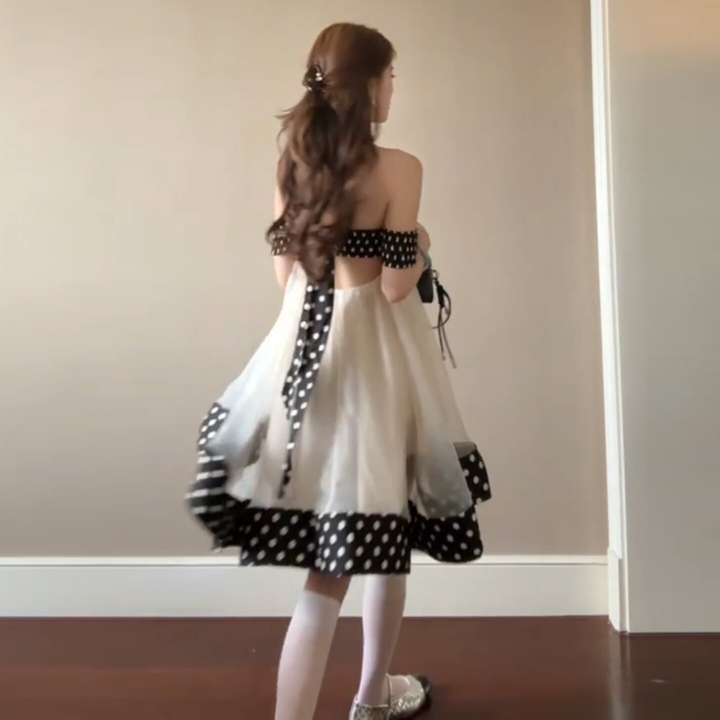 달콤함 도트 무늬 행침 목 오프숄더 여성 드레스 봄 2026 새로운 부드러운 연령 감소 인형 치마 프릴 미니 스커트