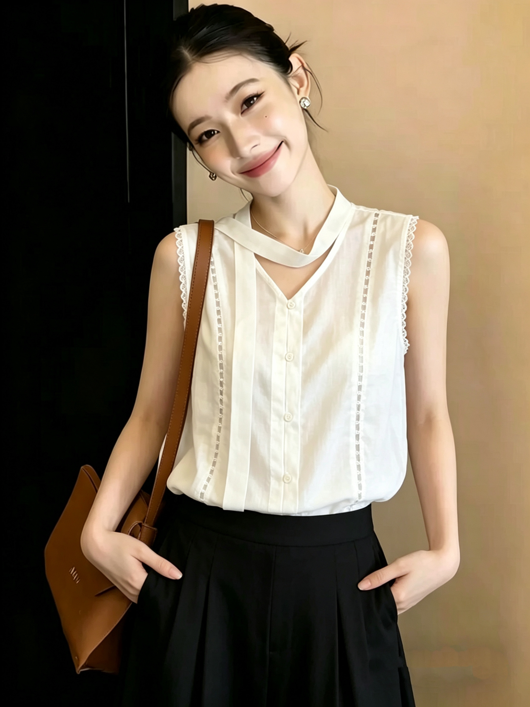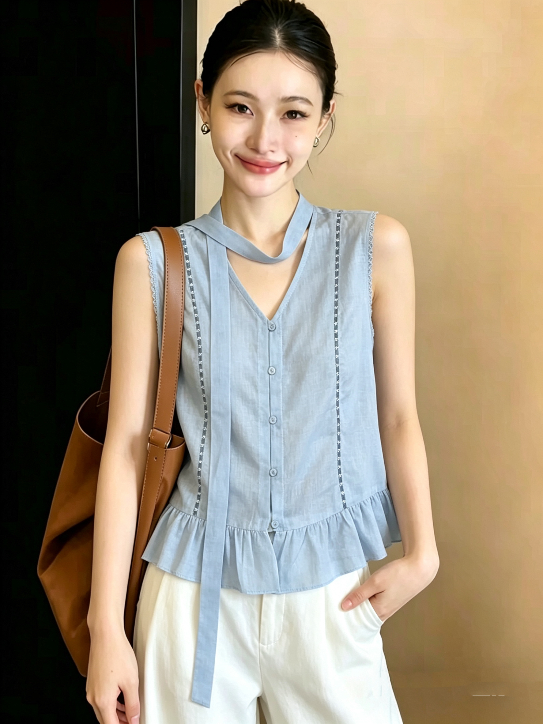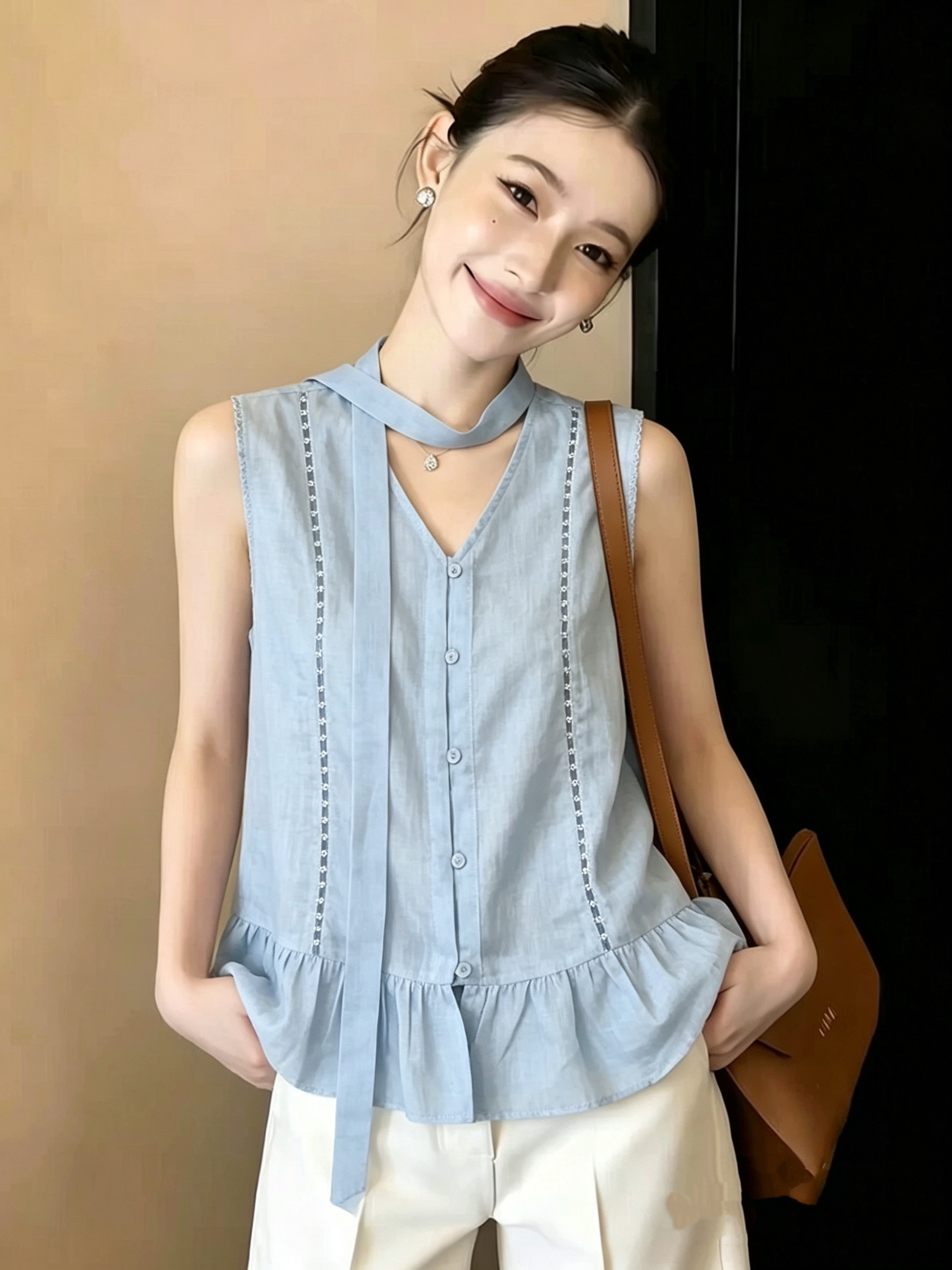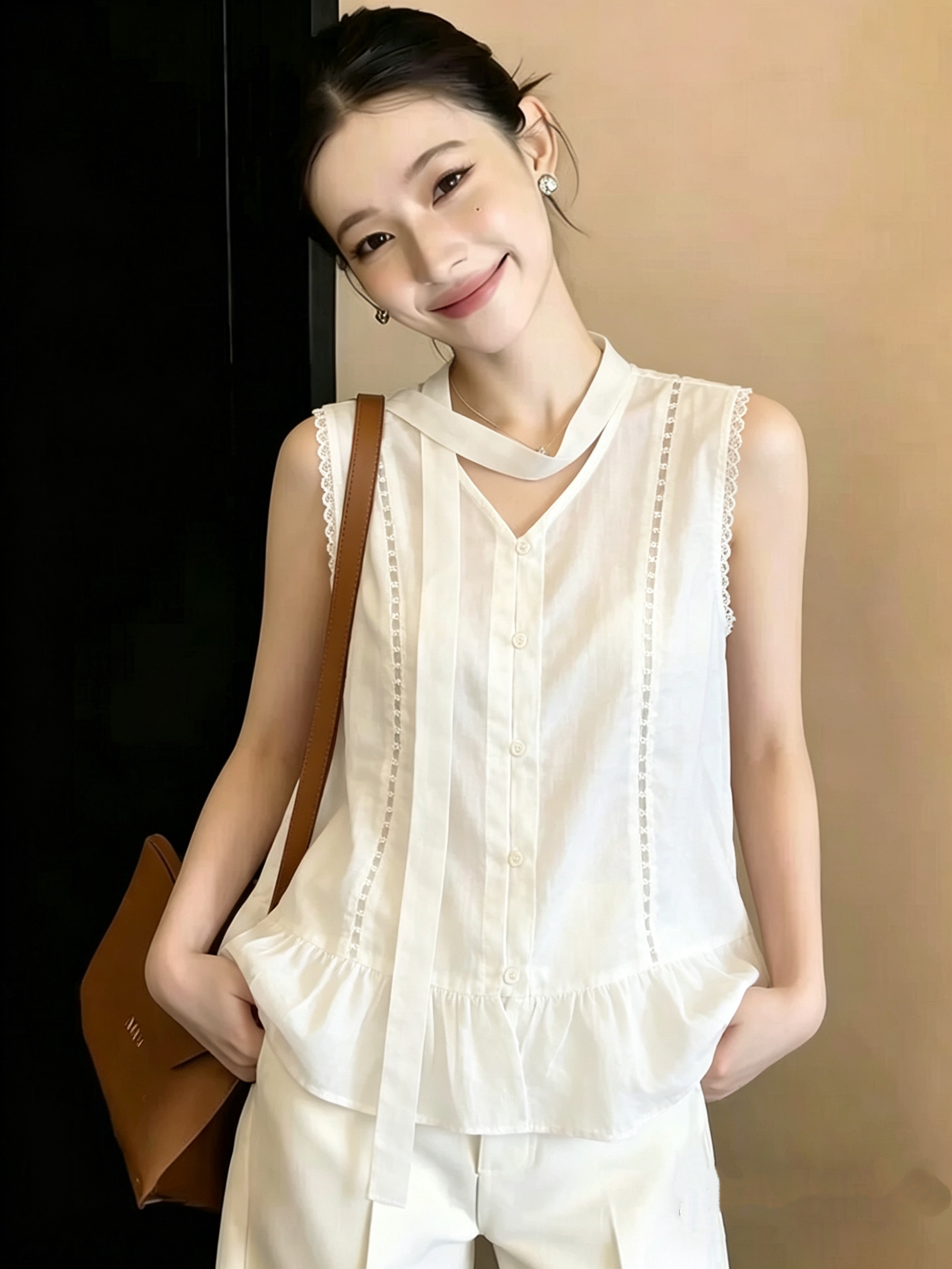 재고 있음 2026 여름 새로운 달콤한 스타일 리본 V넥 스택 착용 조끼 작은 청신 셔츠