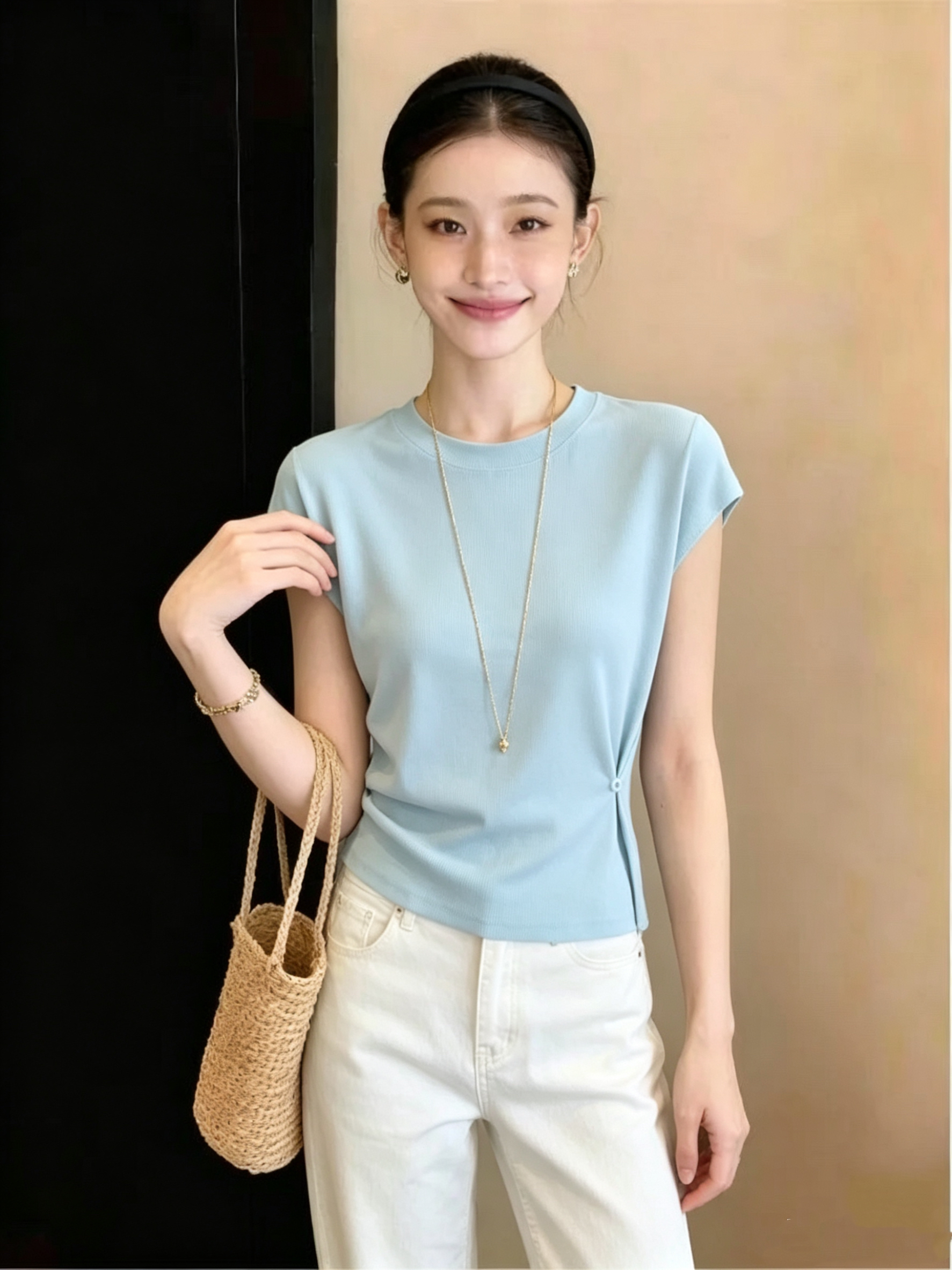 재고 있음 2026 여름 새로운 반팔 니트 스웨터 여성 꼬집기 허리 디자인 맨위