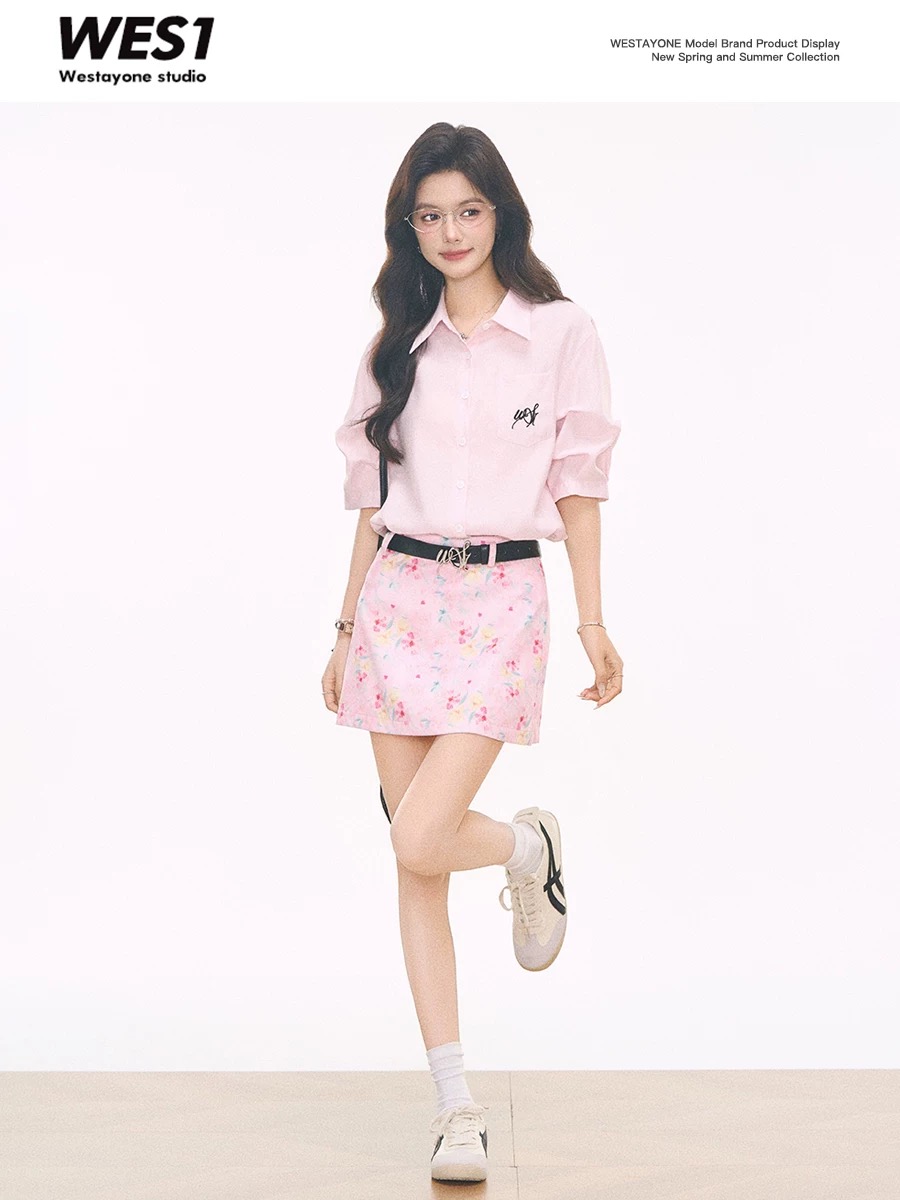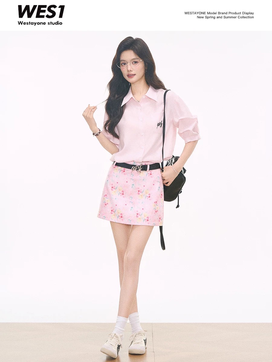4.3 신제품 westayone 핑크색 여성 셔츠 작은 키 셔츠 고급 센스 유화 프린트 미니 스커트