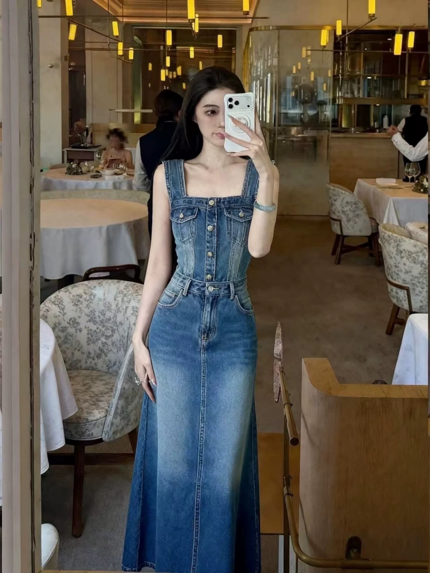 품격 파란색 데님 민소매 조끼 여성 드레스 2026 여름 특별 아름다운 꼬집기 허리 자이언트 잘 생긴 길다 치마