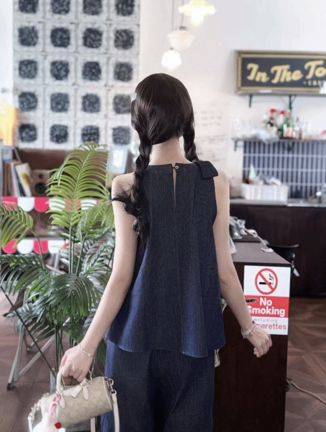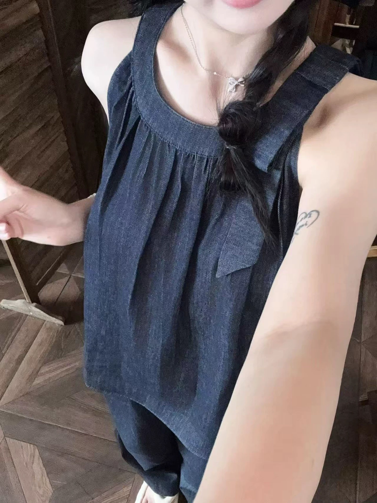 레트로 나비 매듭 행침 목 데님 조끼 캐주얼 와이드 레그 팬츠 두 조각 여성 세트 2026 여름 ootd 착용 가져 가라. 세트