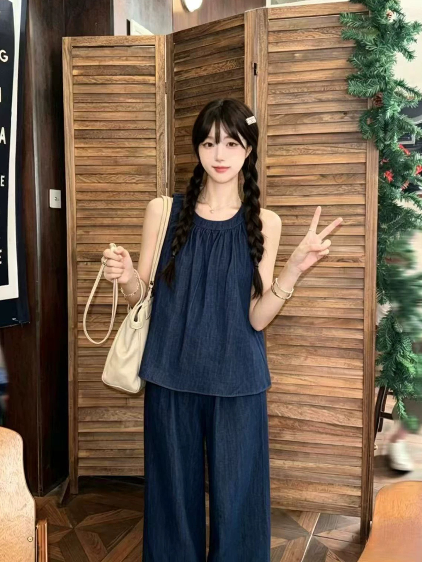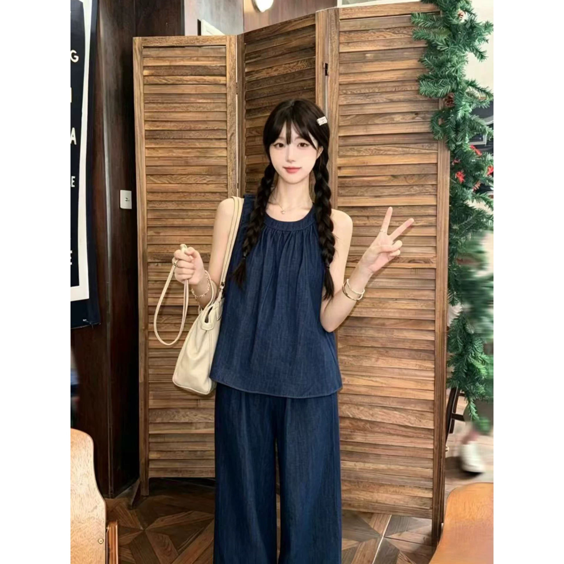파란색 와이드 팬츠 데님 세트 여성 여름 2026 새로운 고유 한 아름다운 자이언트 잘 생긴 한 부서 착용 가져 가라. 전체 집합
