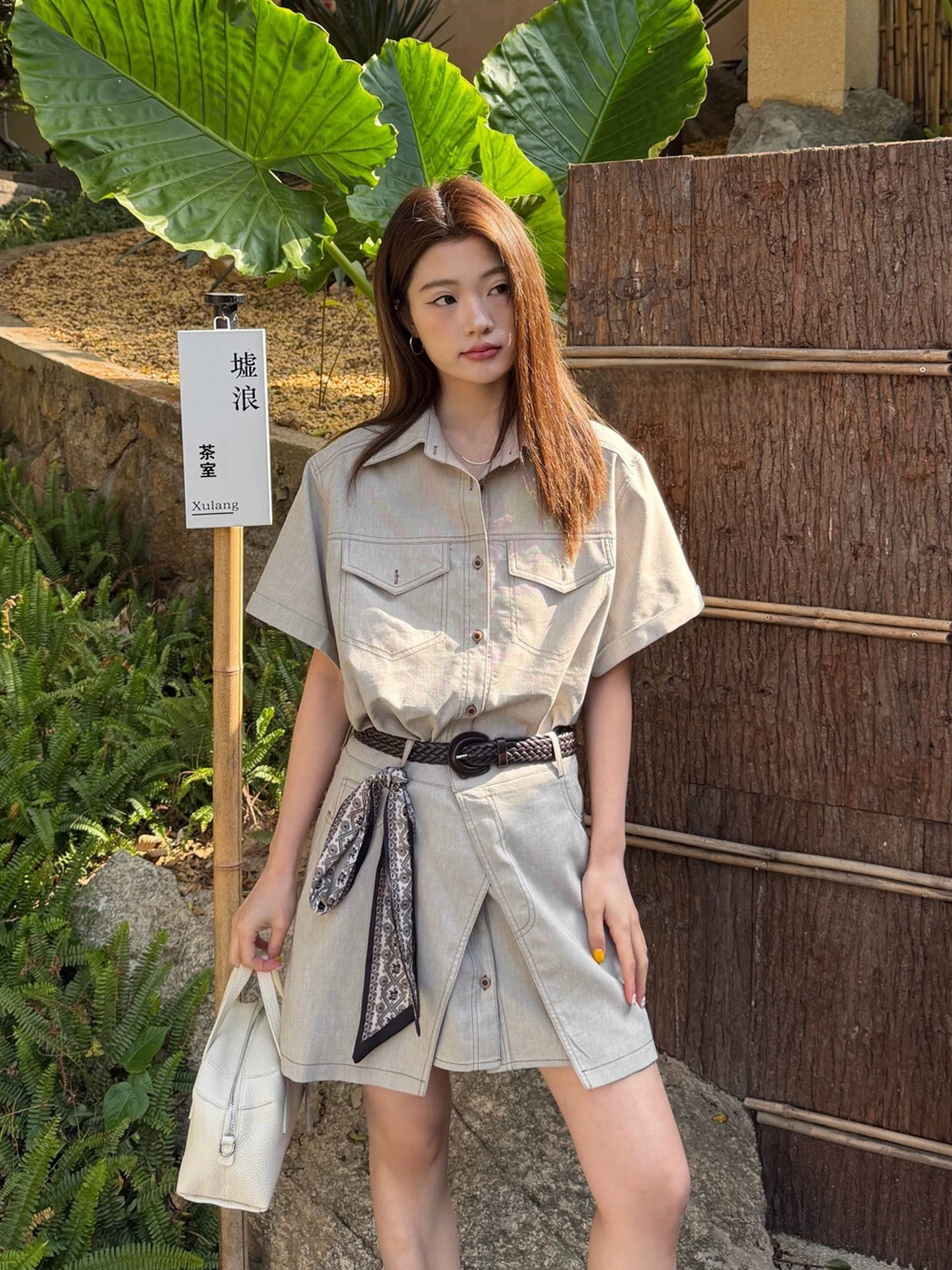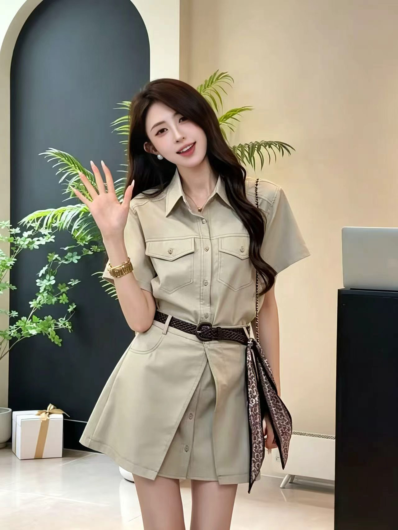 쿤룬 쿡 눈 빛 럭셔리 바람 하이웨이스트 몸매 가꾸기 종류 벨트 반팔 POLO 칼라 셔츠 반신 치마 세트 여름