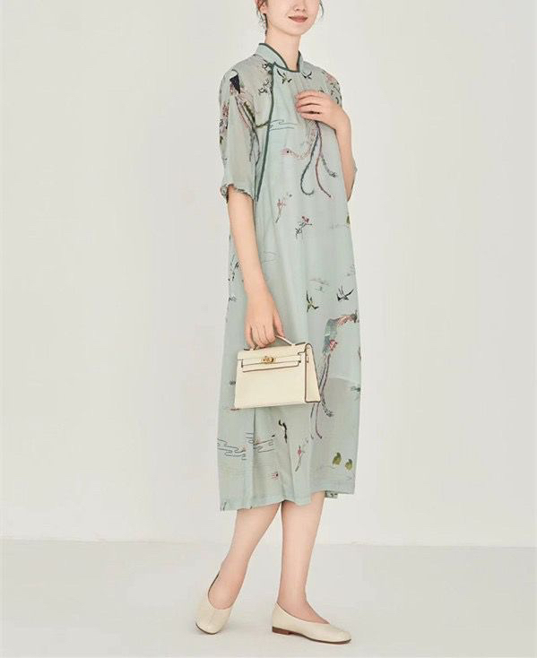 실사 개선 치파오 드레스 단추 아마 중간 길이 스커트 꽃무늬 민족 스타일 면 실크 여성 의류 드레스