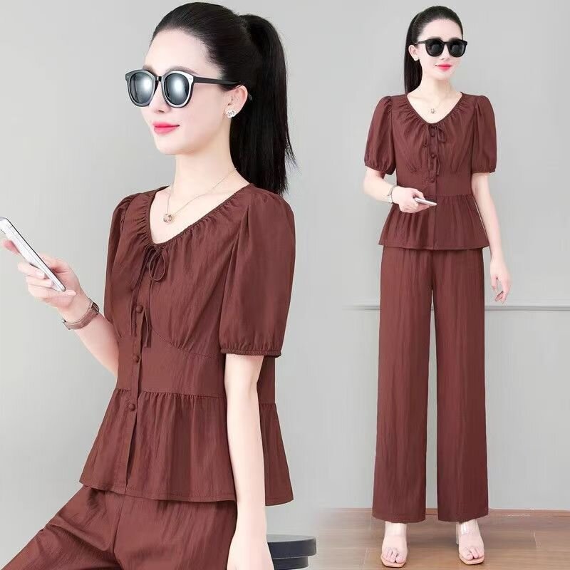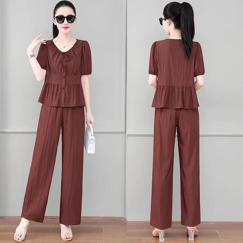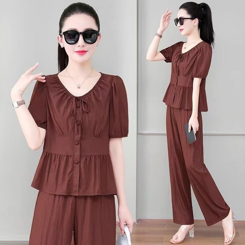 빅 사이즈 한국 스타일 패션 V넥 셔츠 허리밴드 캐주얼 긴 바지 세트 여성 여름 새로운 와이드 레그 팬츠 투피스 세트