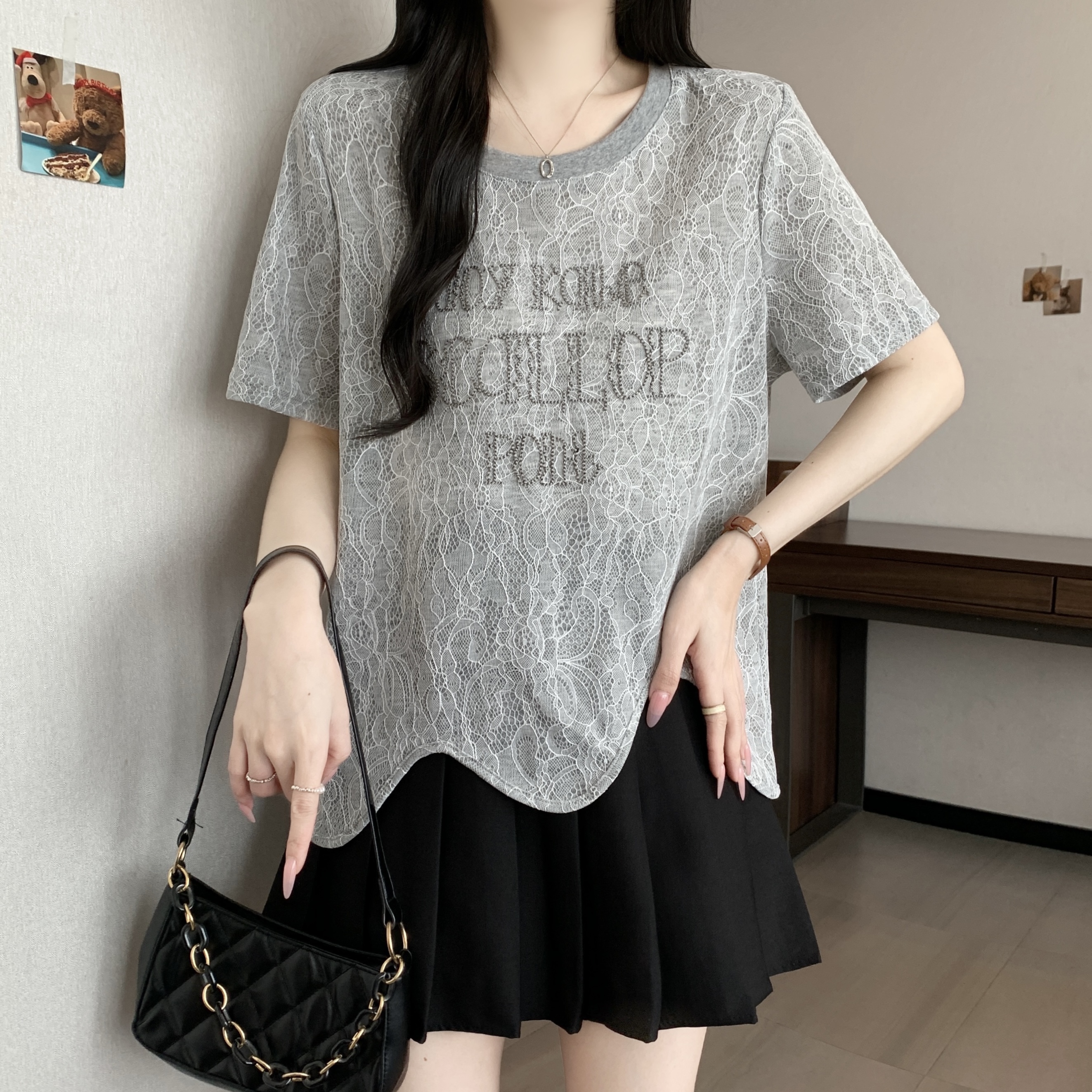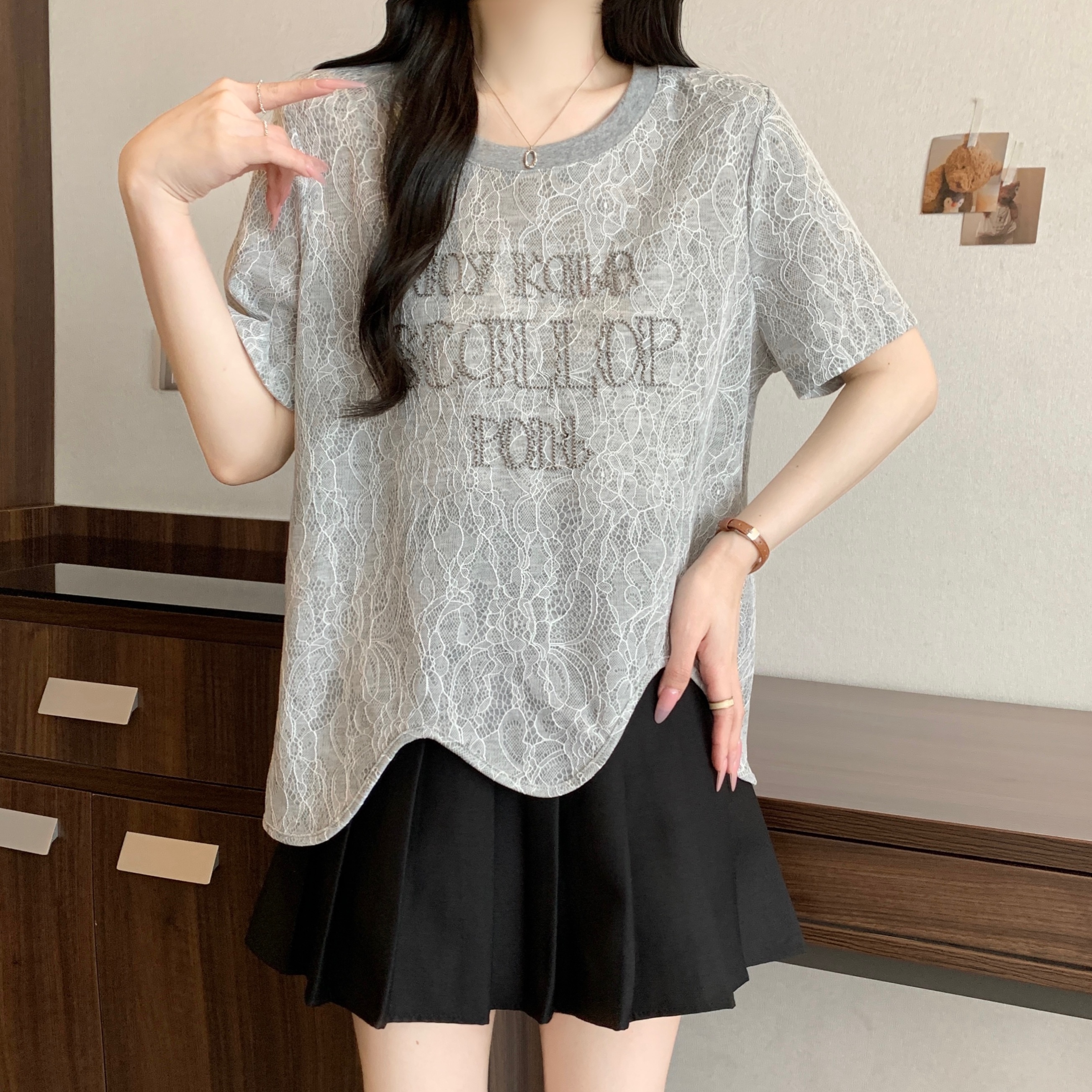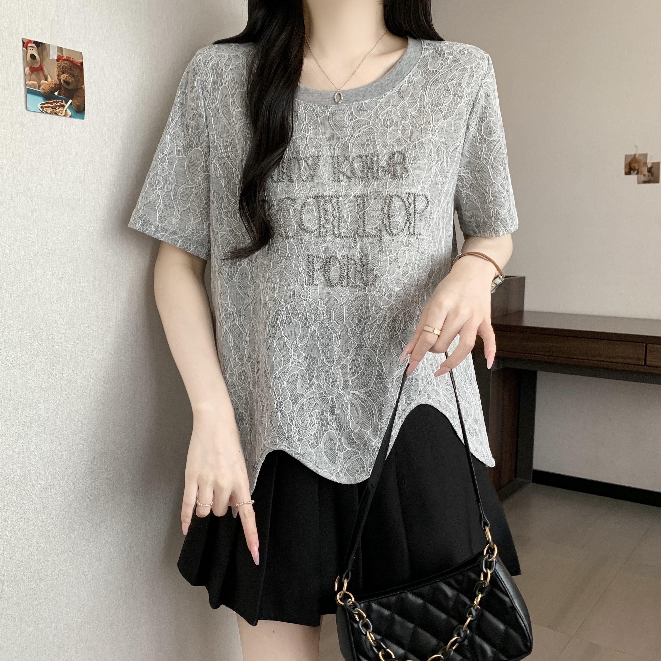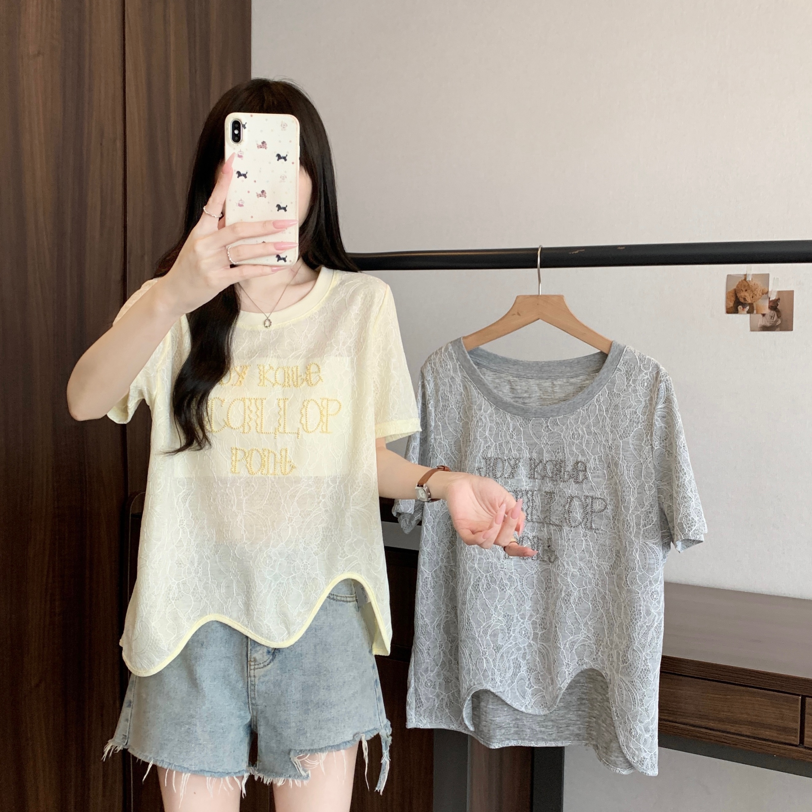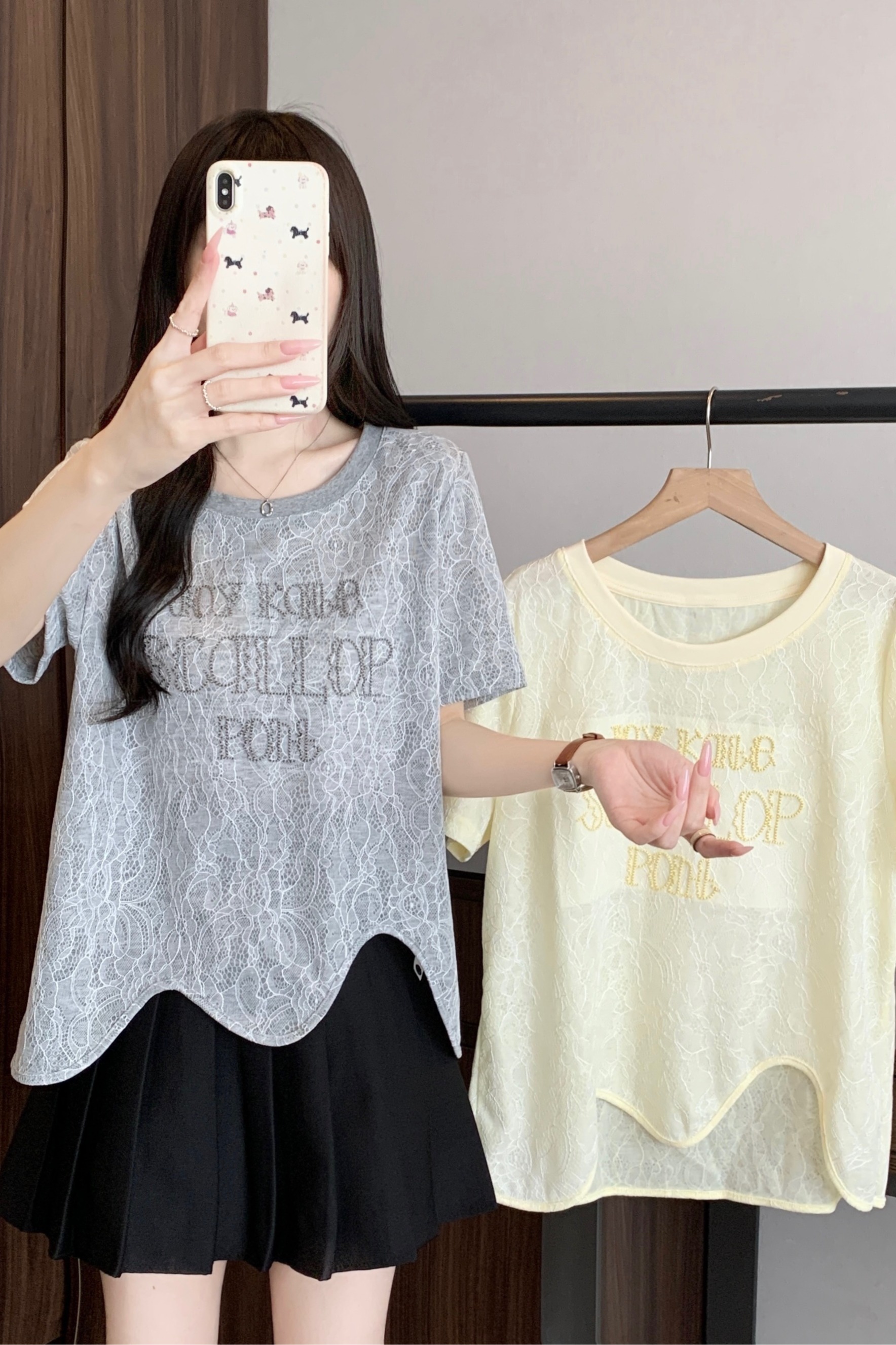 실사 2026 여름 새로운 지방 mm 빅 사이즈 달콤한 매운맛 알파벳 레이스 V넥 반팔 티셔츠 작은 키 몸매 가꾸기 맨위