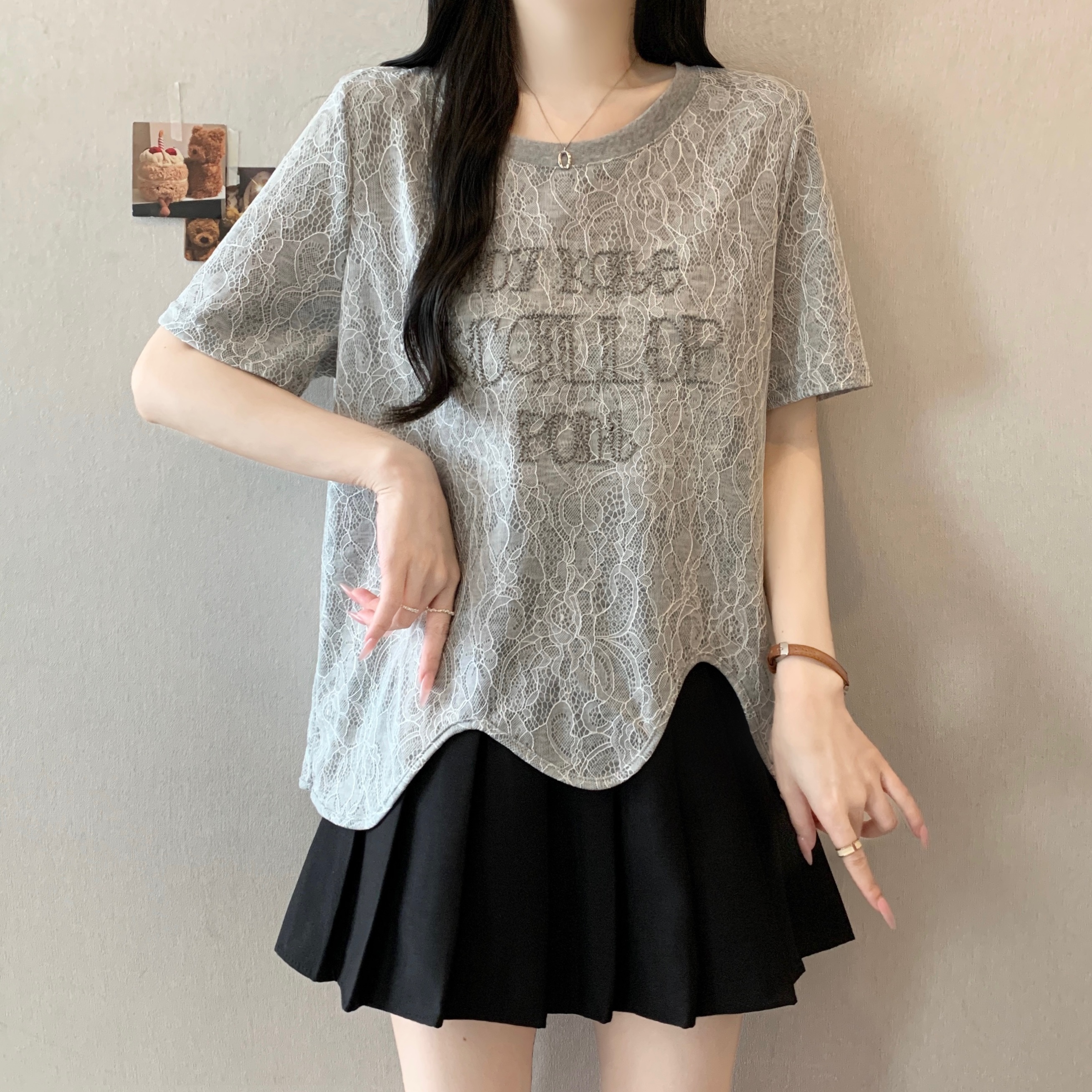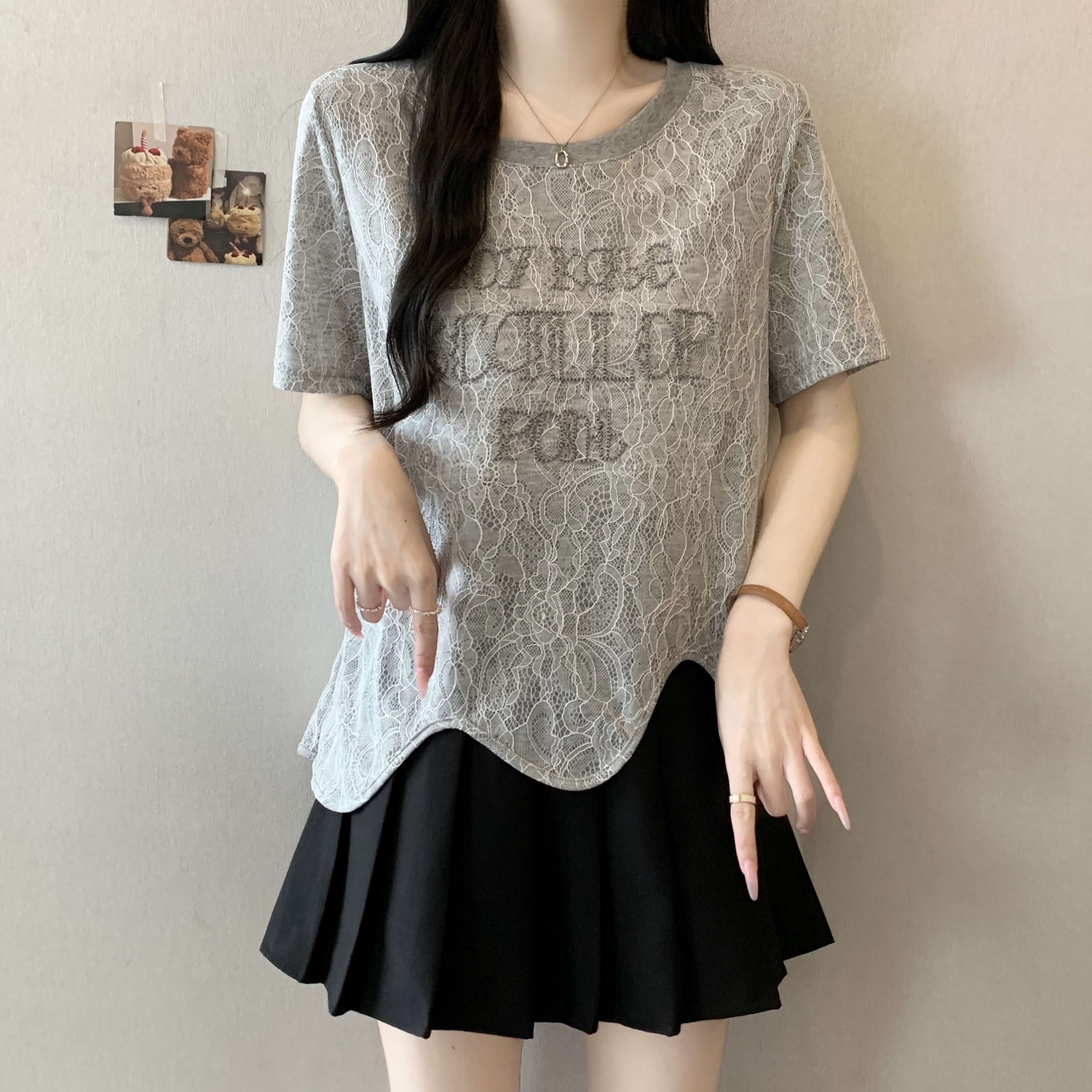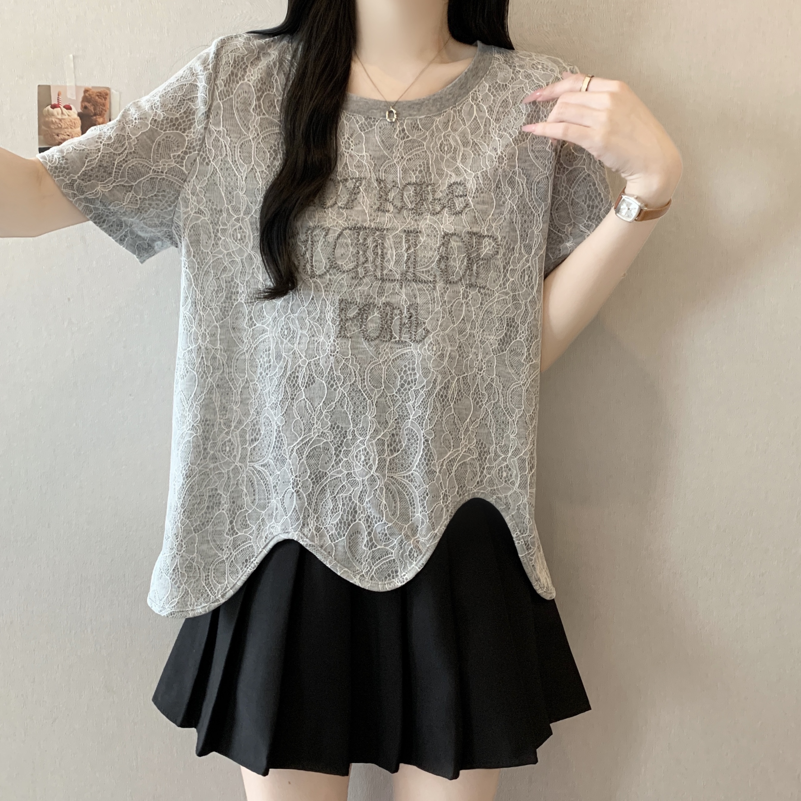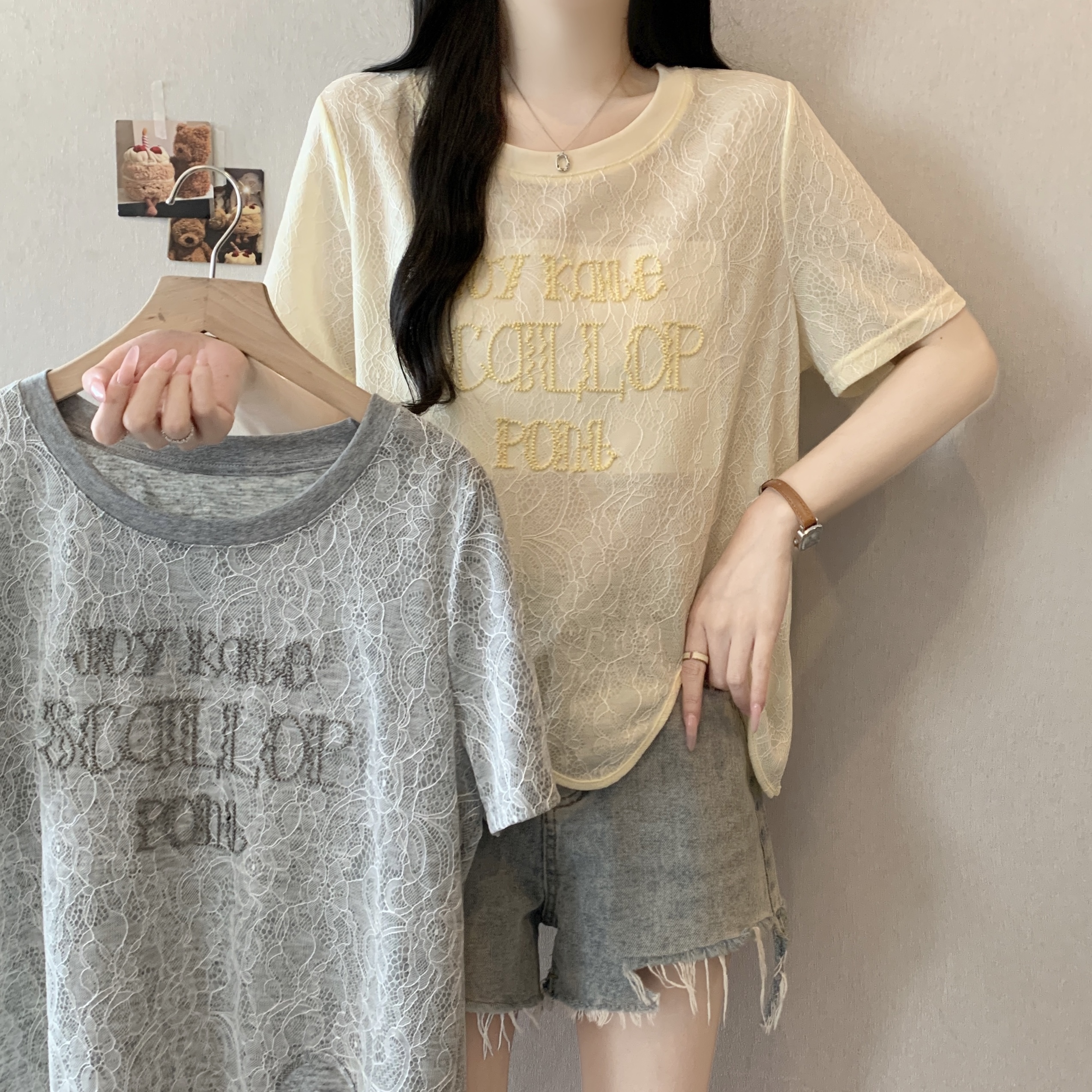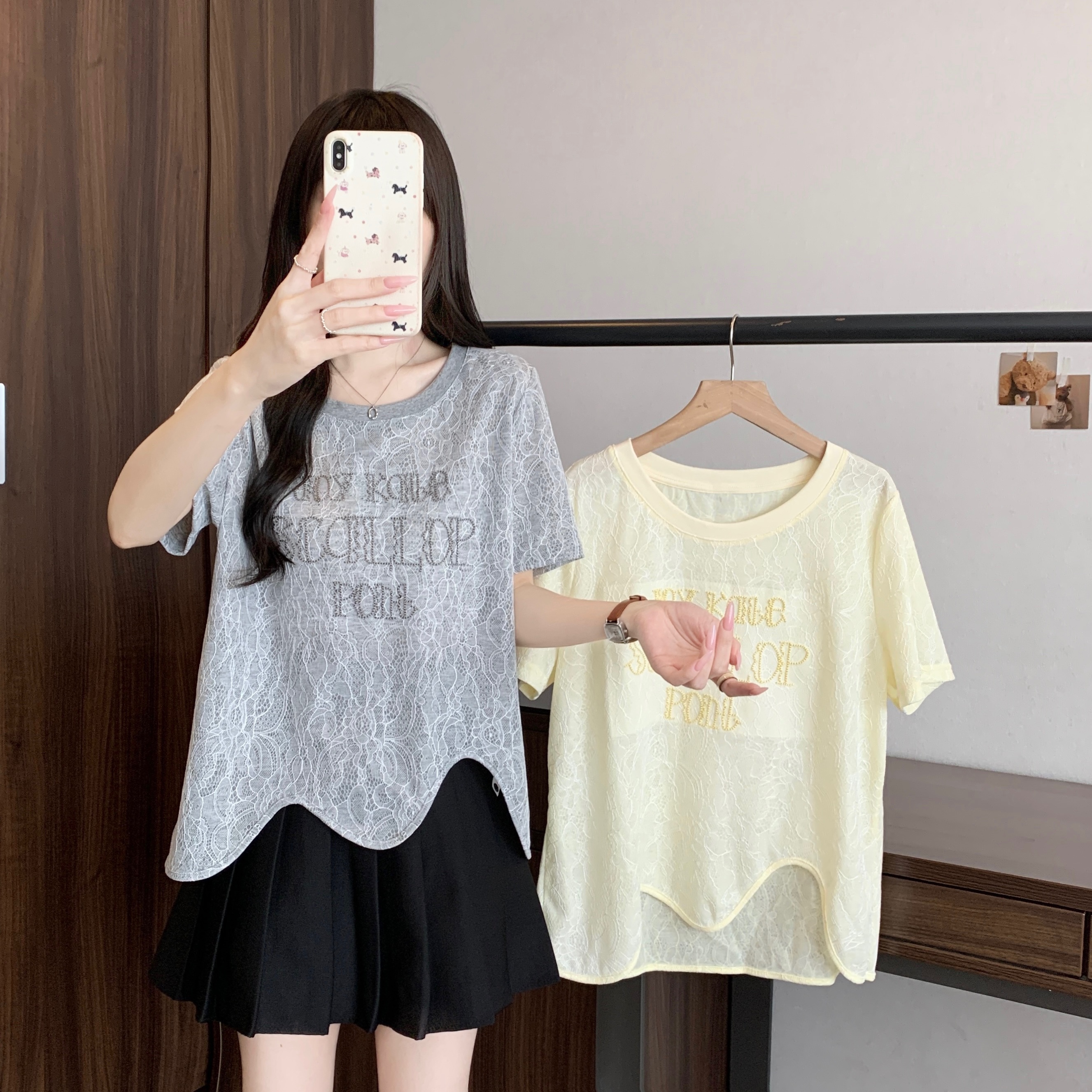 실사 2026 여름 새로운 지방 mm 빅 사이즈 달콤한 매운맛 알파벳 레이스 V넥 반팔 티셔츠 작은 키 몸매 가꾸기 맨위