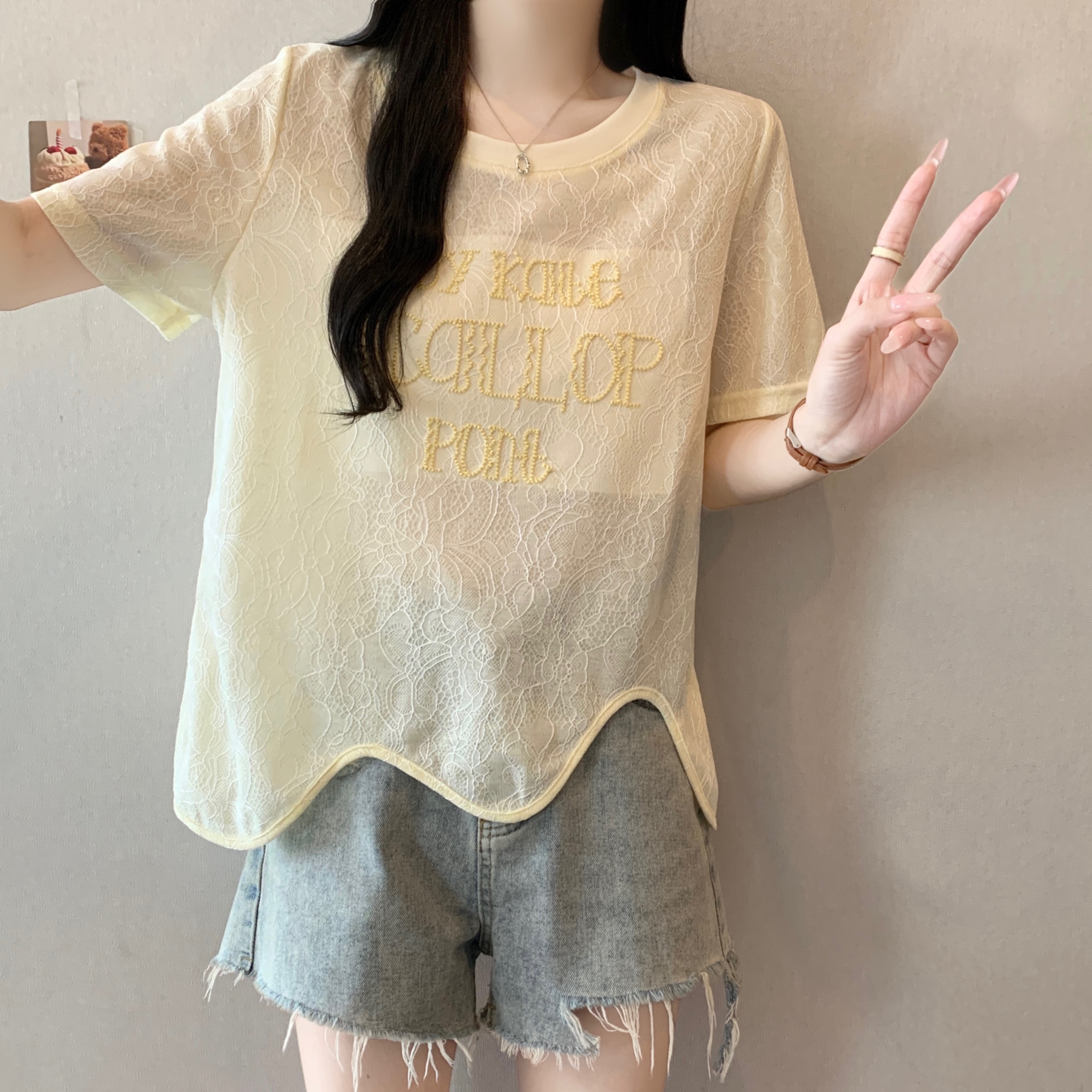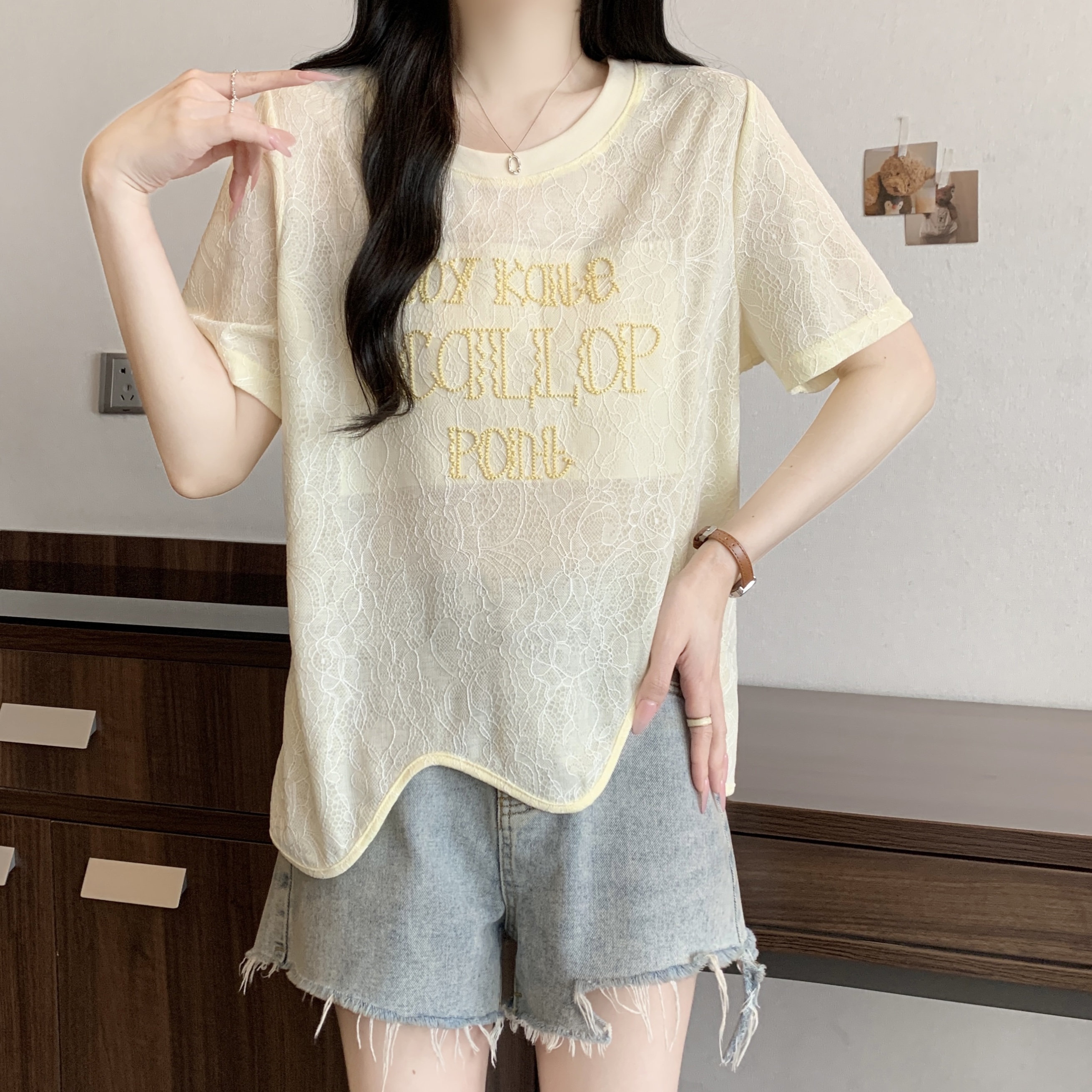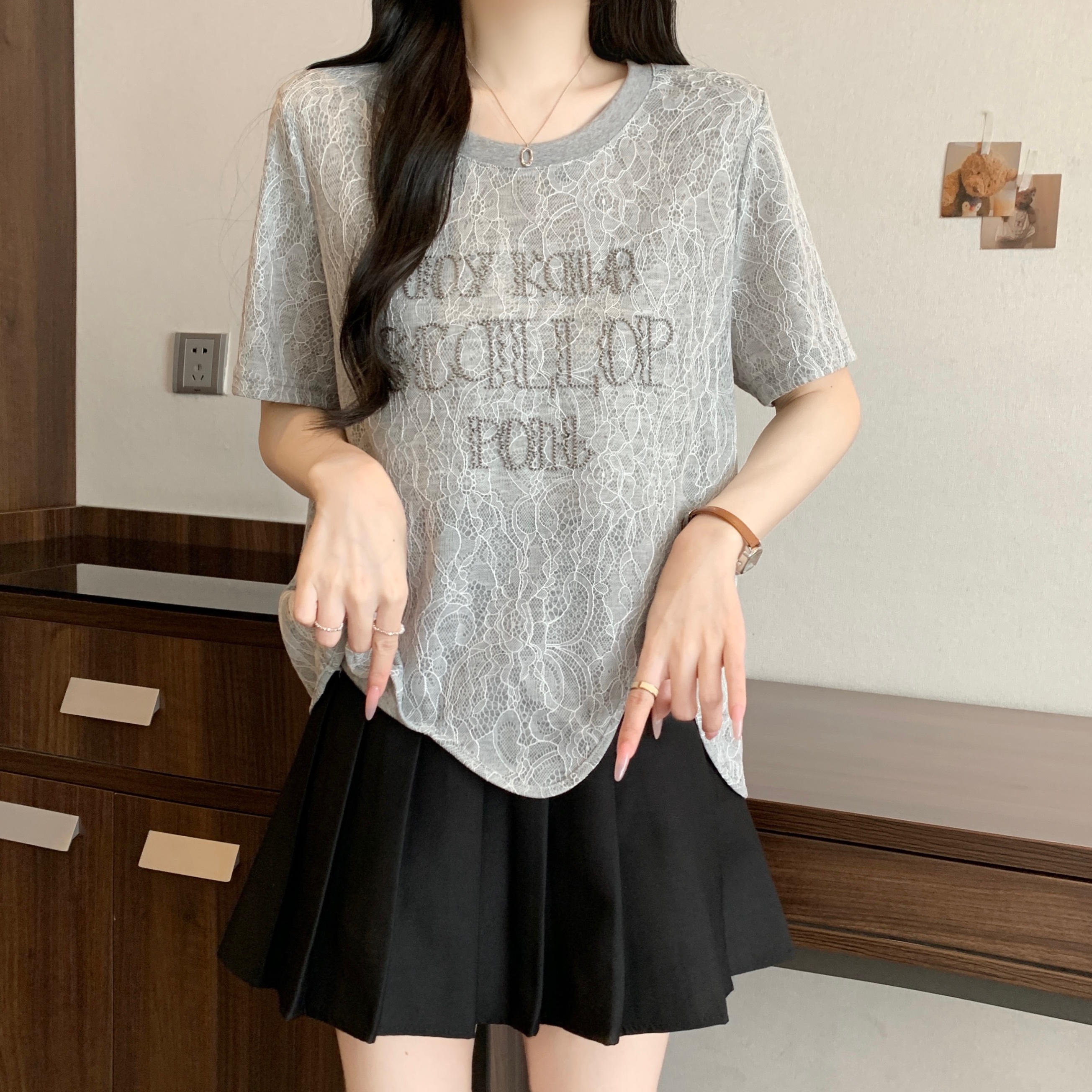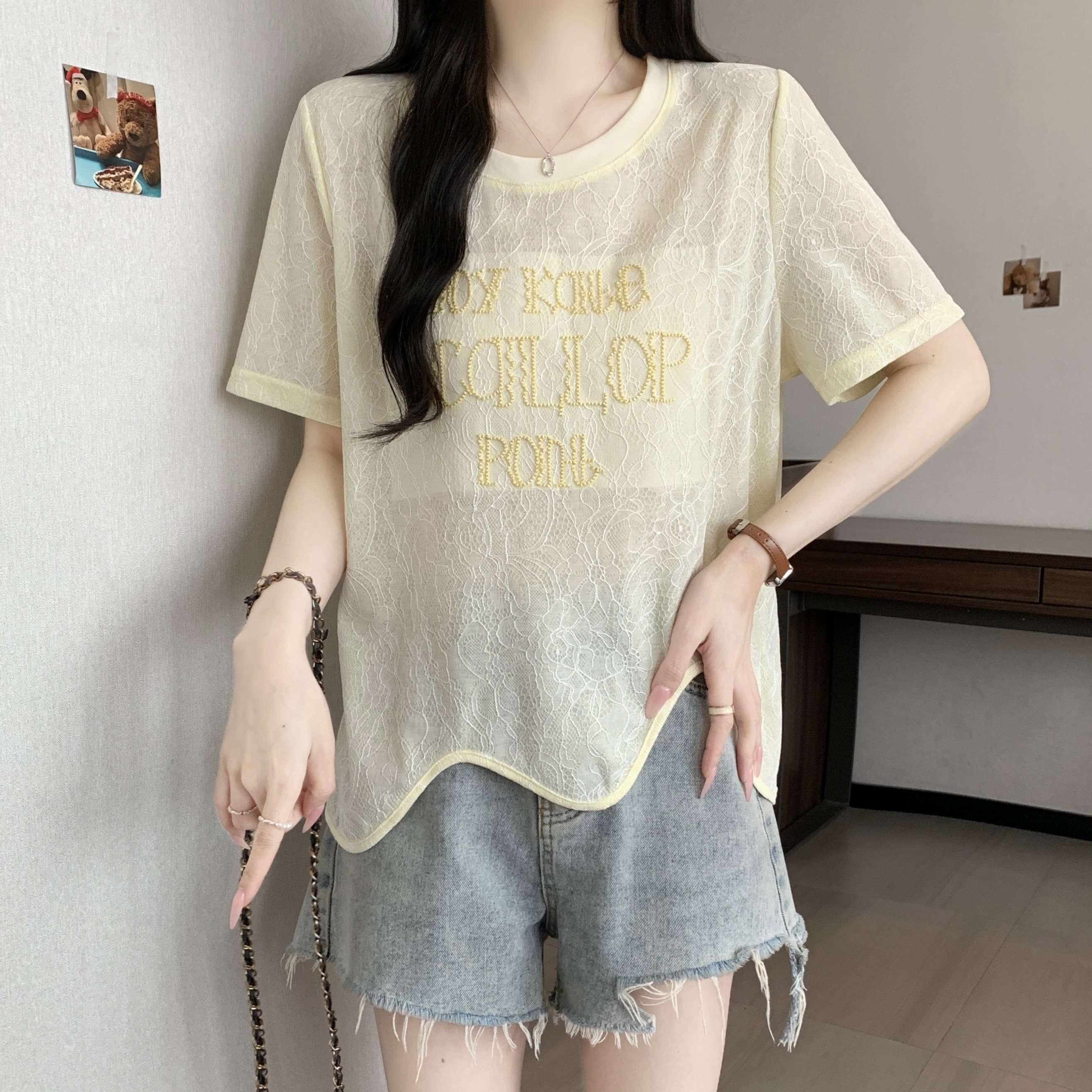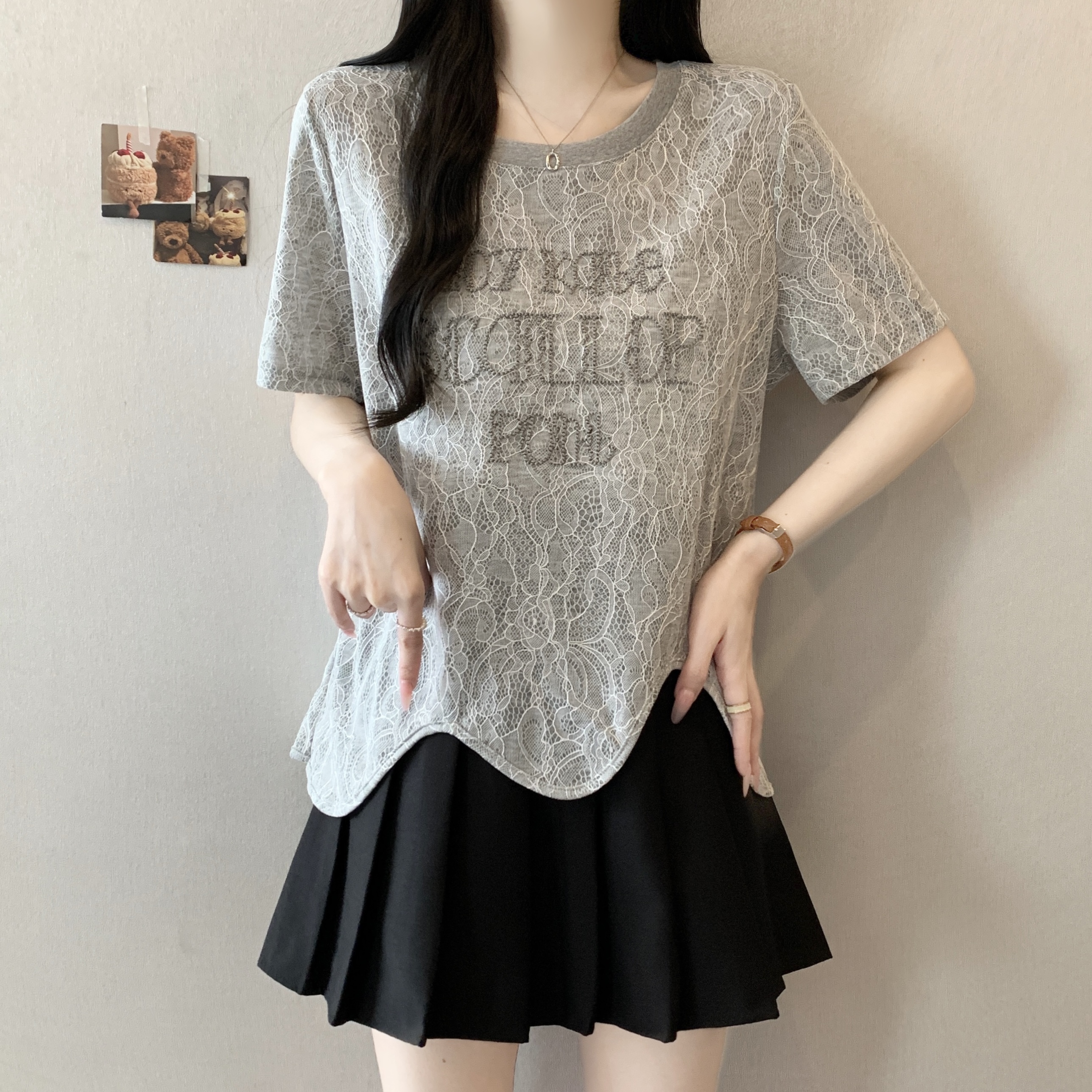 실사 2026 여름 새로운 지방 mm 빅 사이즈 달콤한 매운맛 알파벳 레이스 V넥 반팔 티셔츠 작은 키 몸매 가꾸기 맨위
