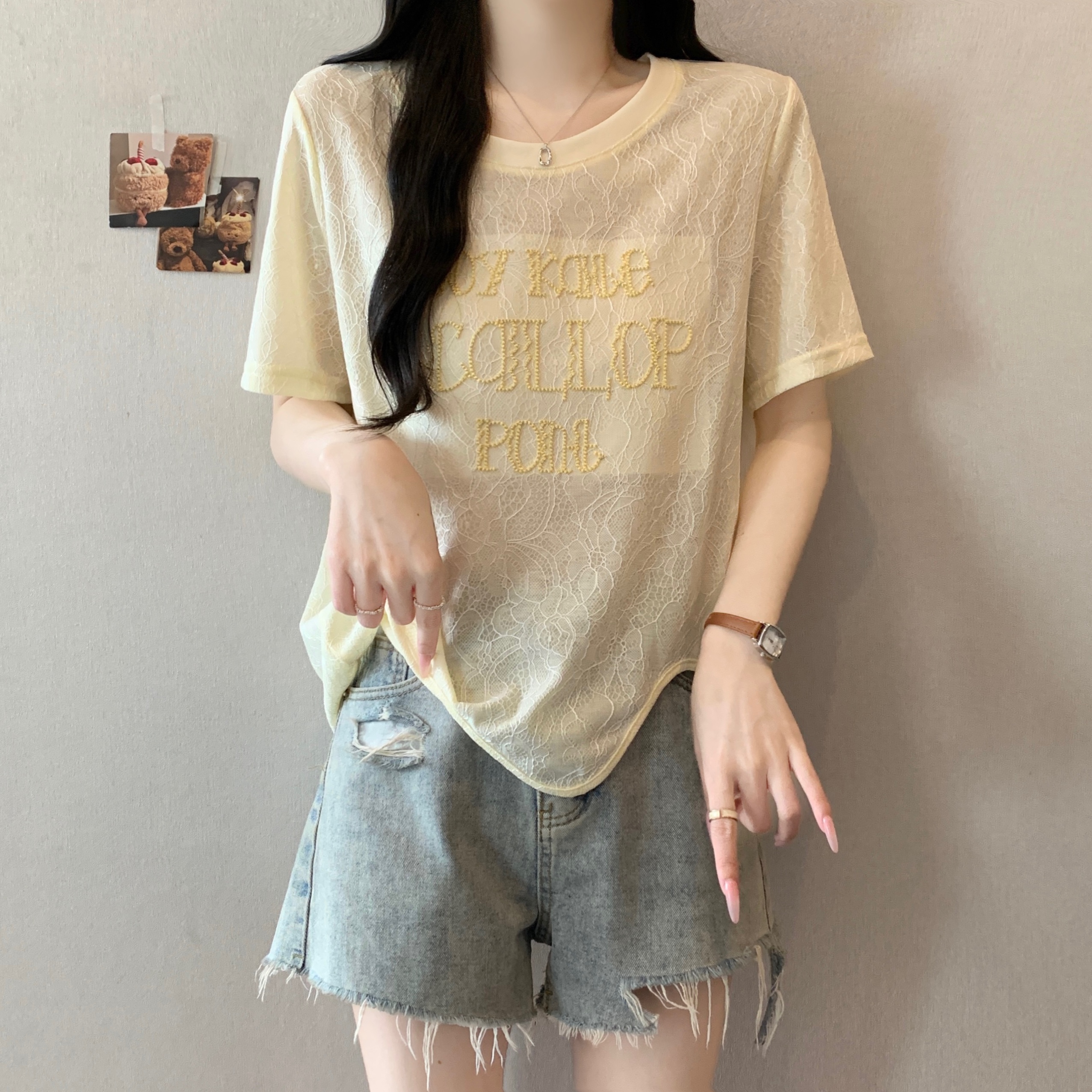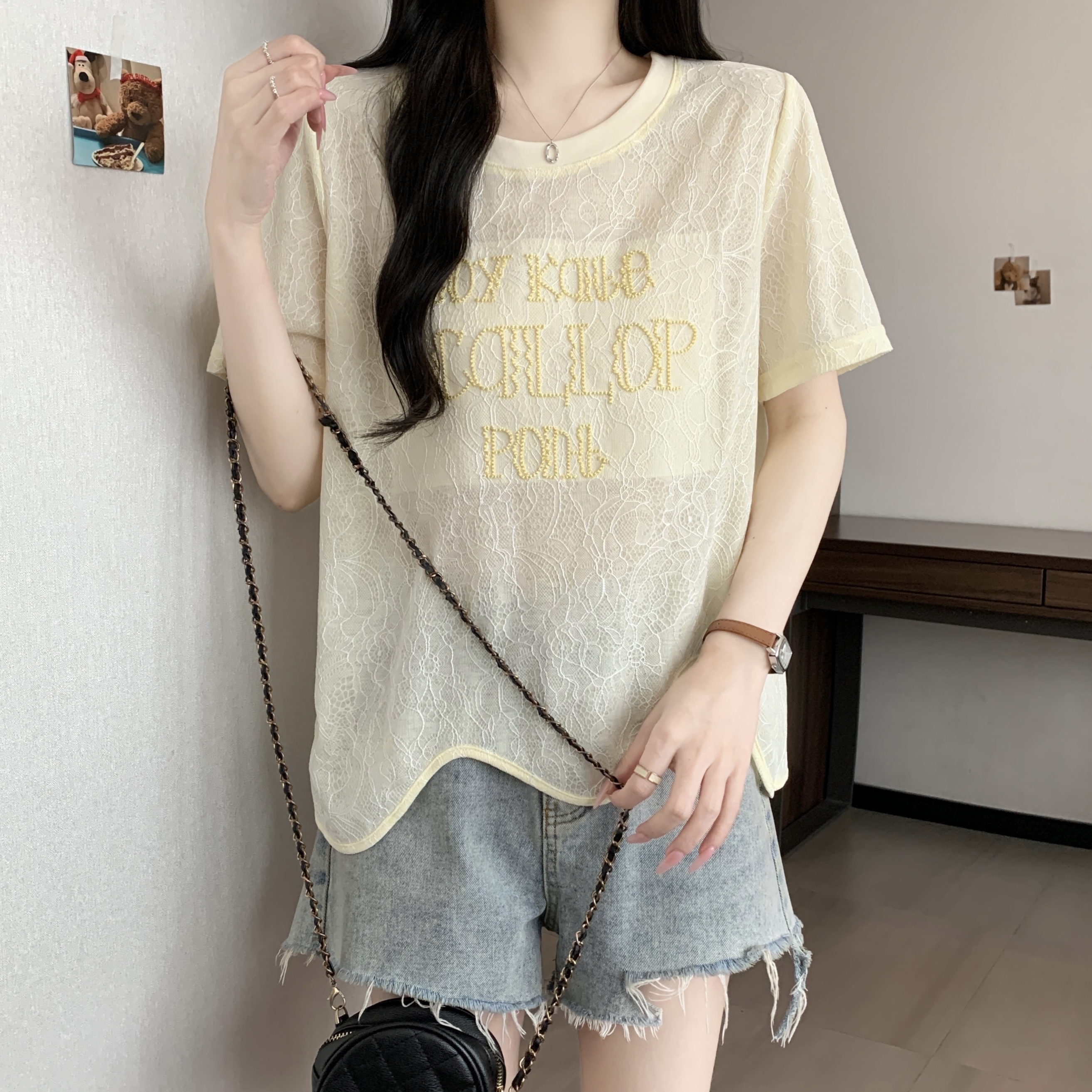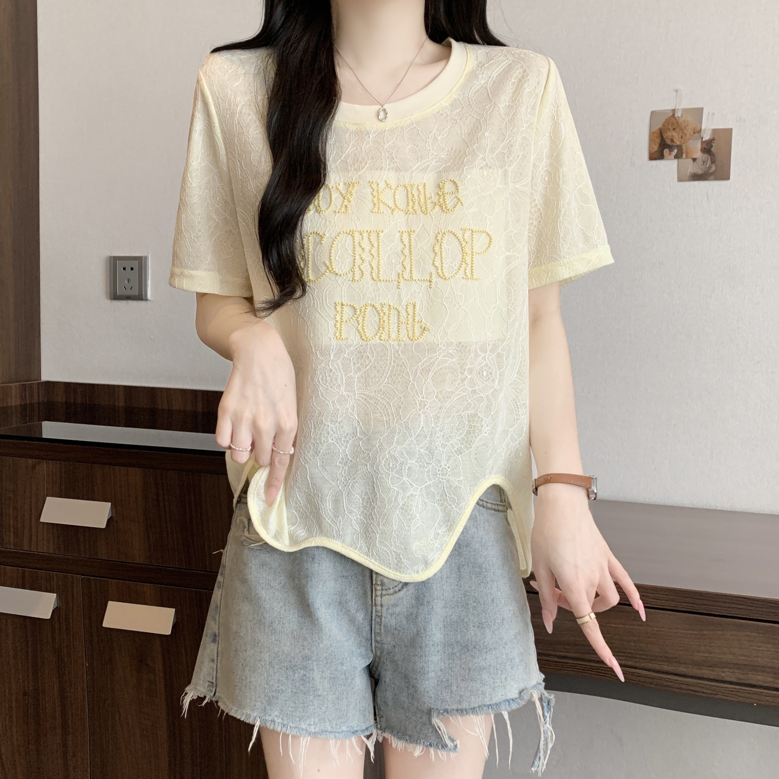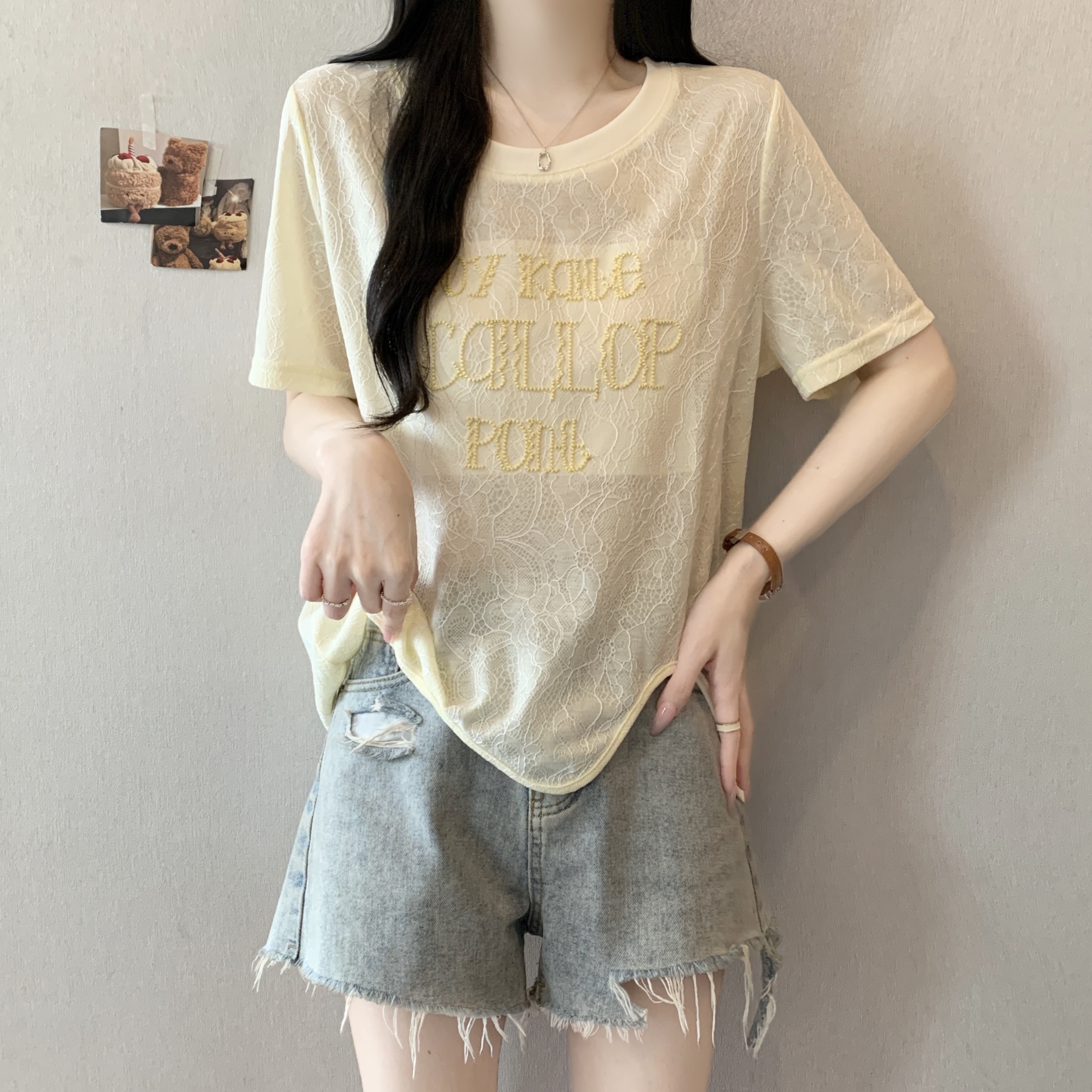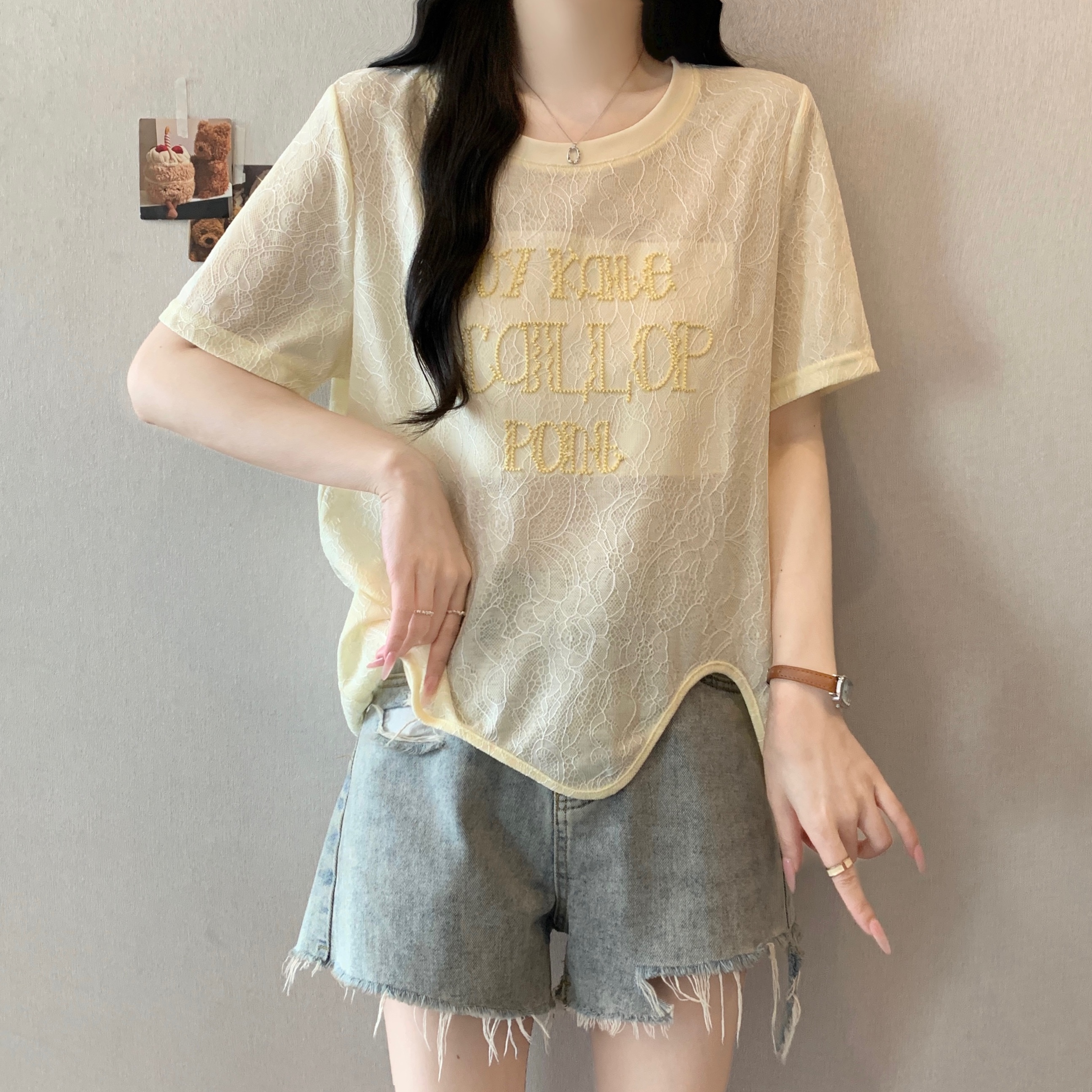 실사 2026 여름 새로운 지방 mm 빅 사이즈 달콤한 매운맛 알파벳 레이스 V넥 반팔 티셔츠 작은 키 몸매 가꾸기 맨위