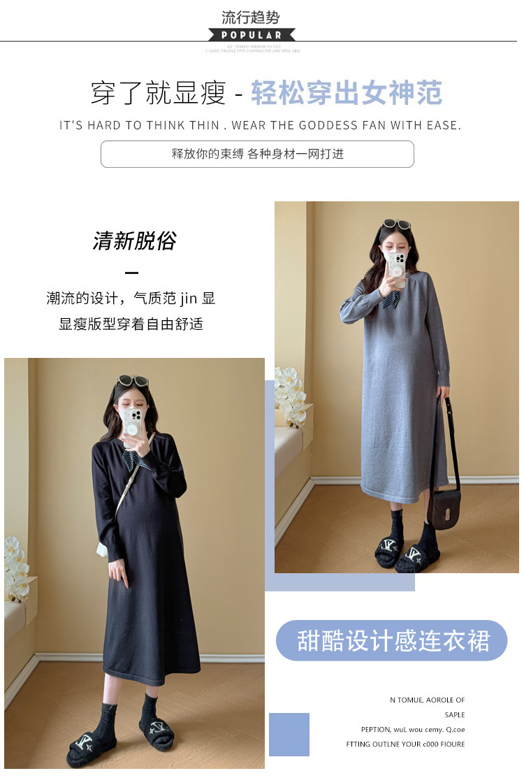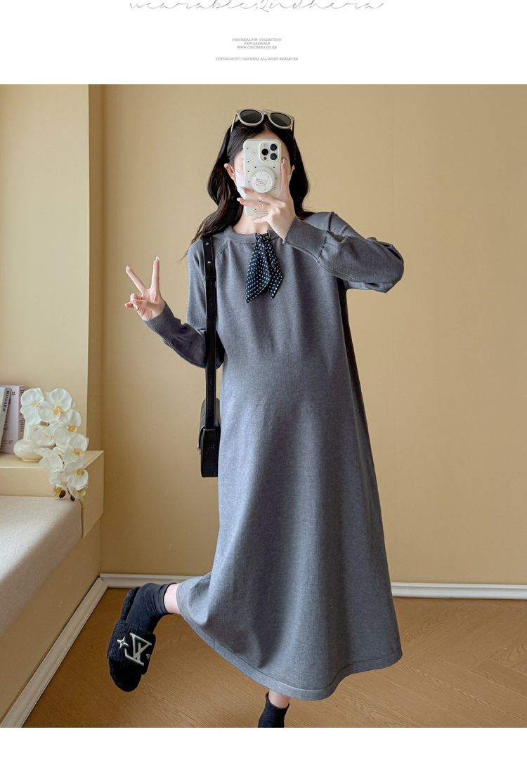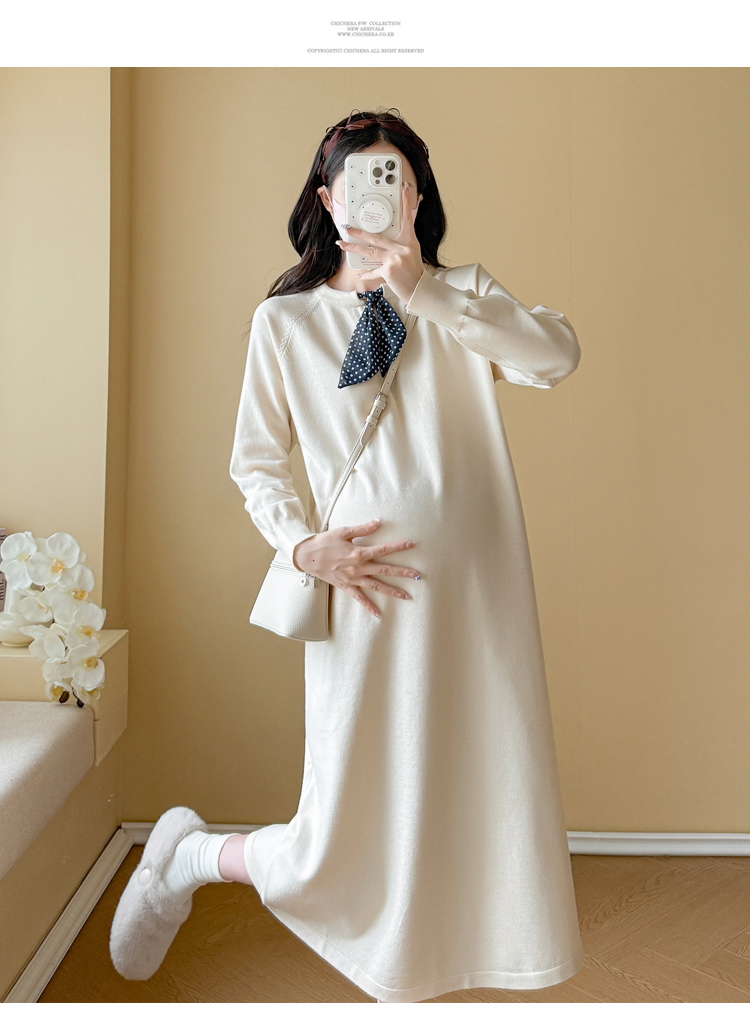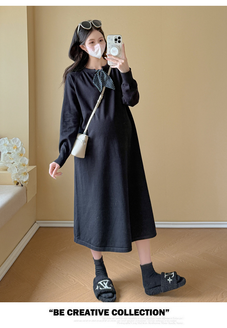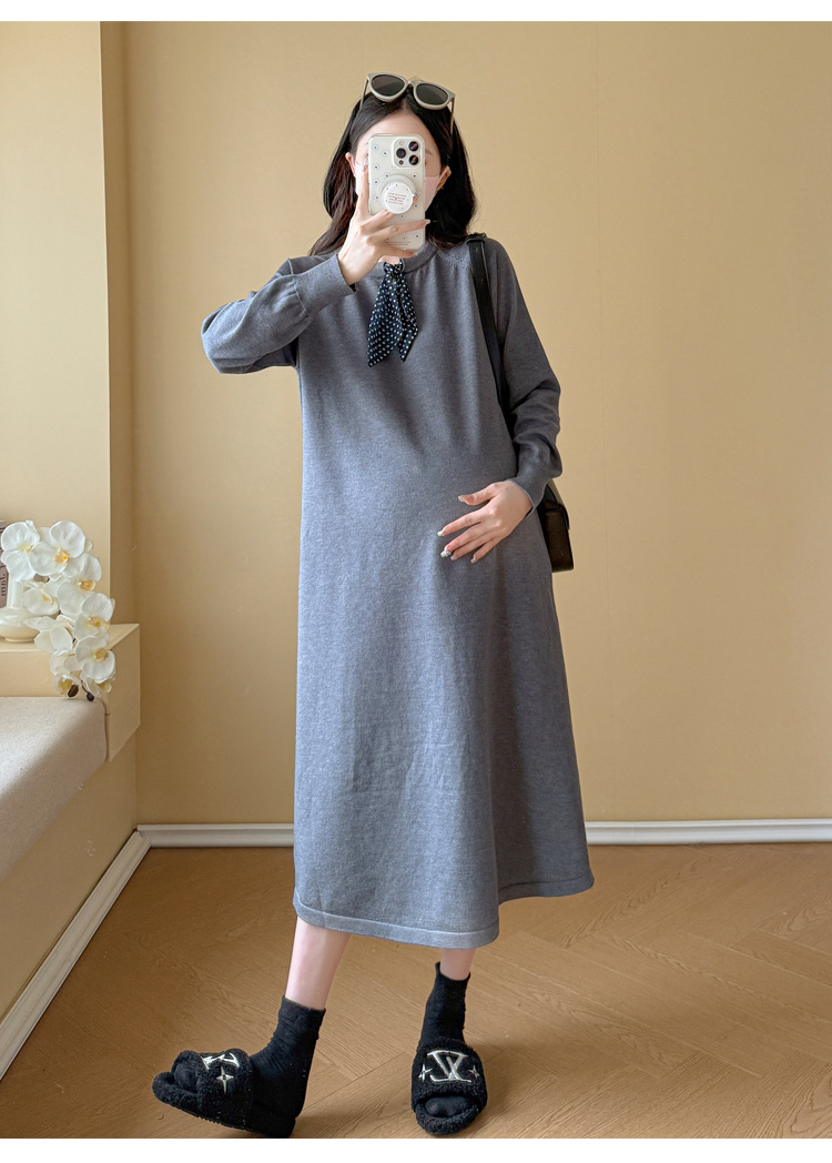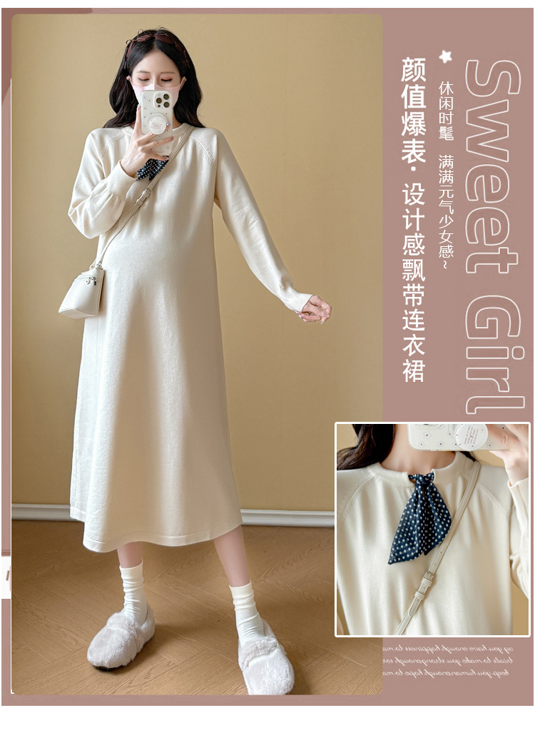 실사 출산 착용 2026 봄 드레스 새로운 루즈핏 슬림해 보이는 연령 감소 품격 스카프 중간 길이 니트 드레스