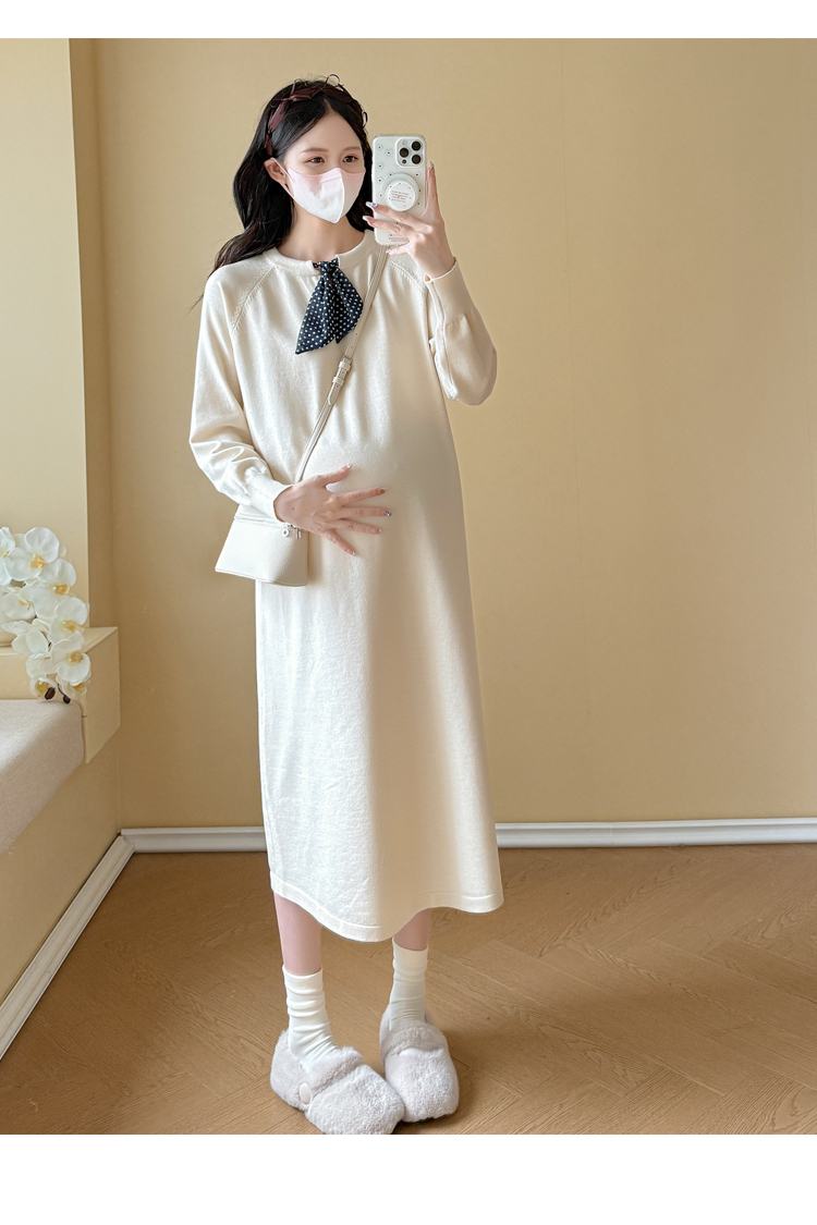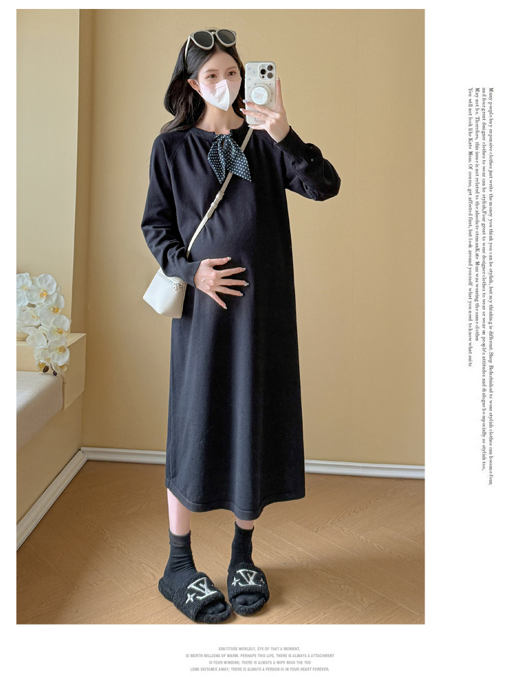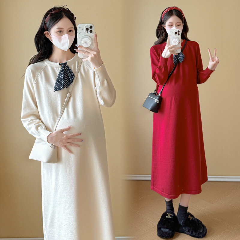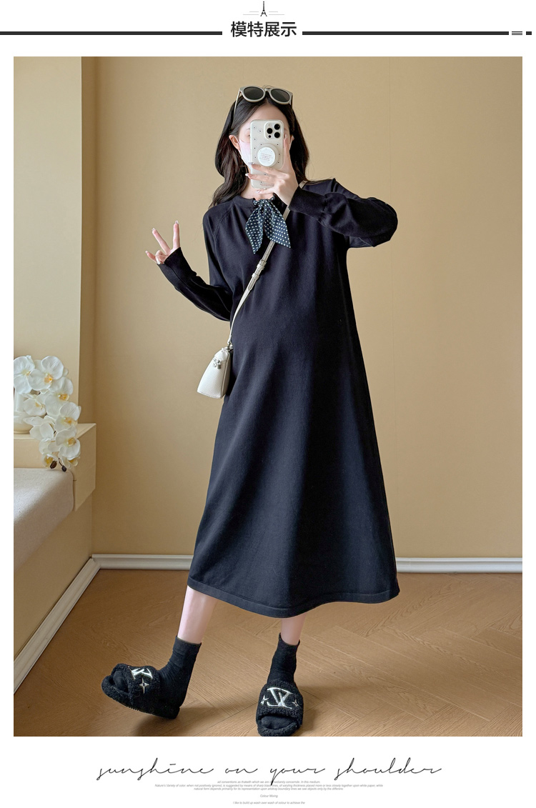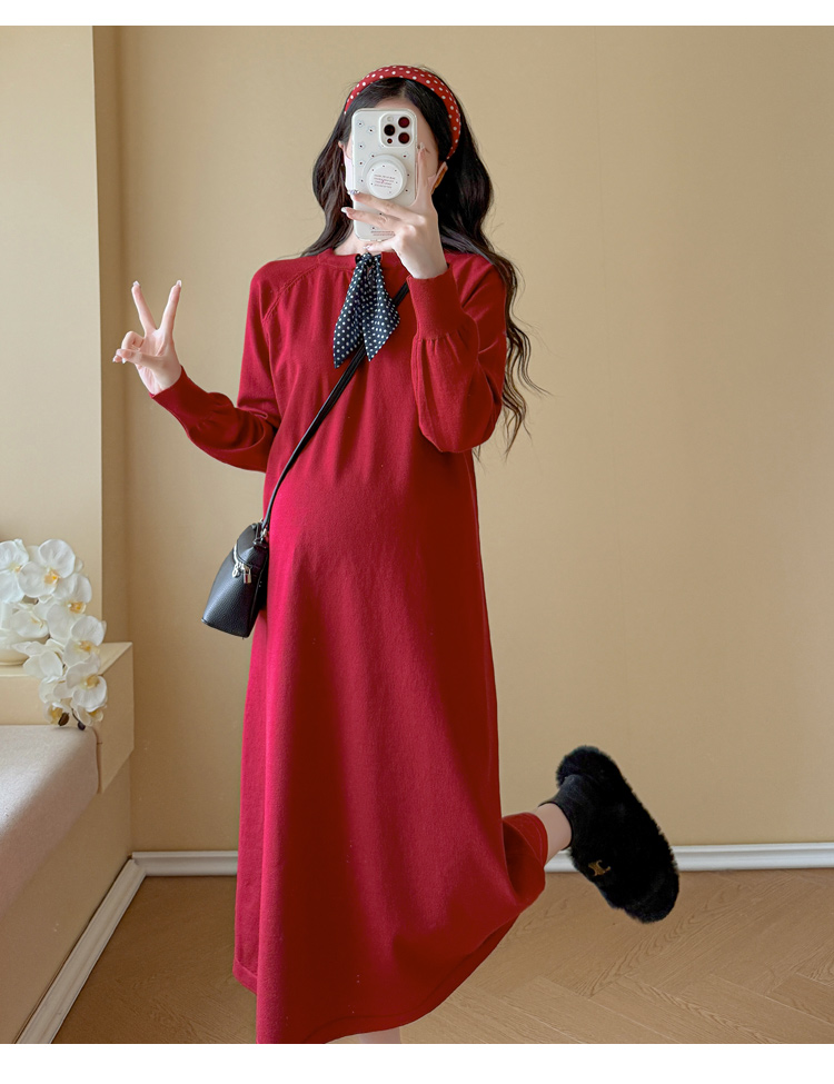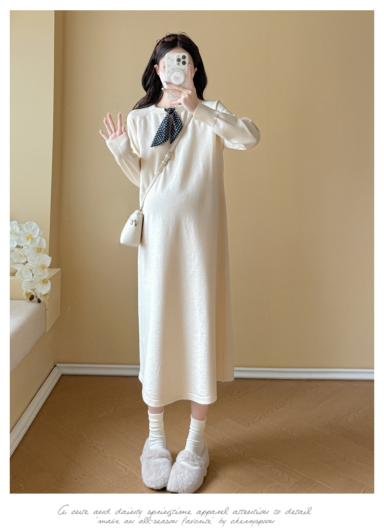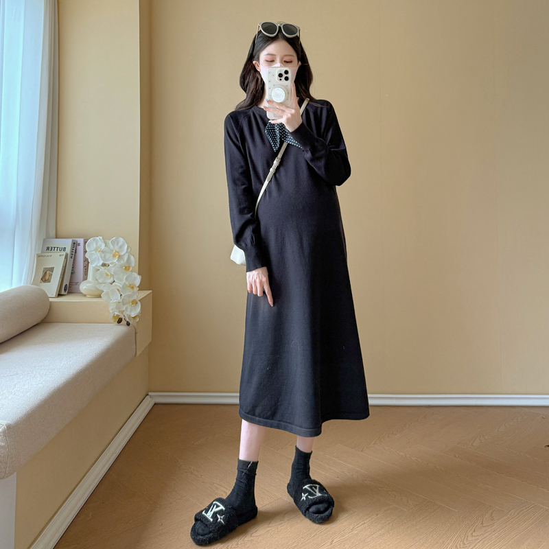 실사 출산 착용 2026 봄 드레스 새로운 루즈핏 슬림해 보이는 연령 감소 품격 스카프 중간 길이 니트 드레스