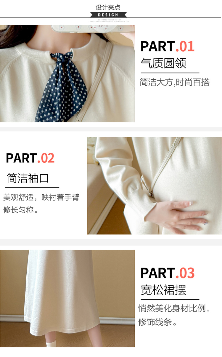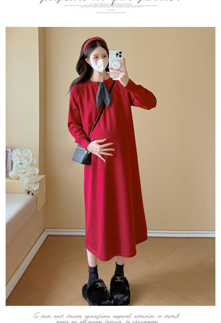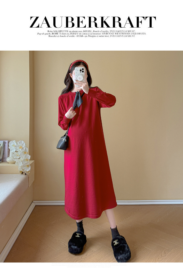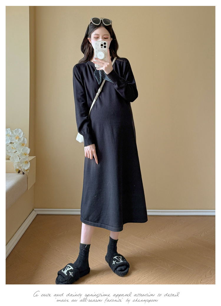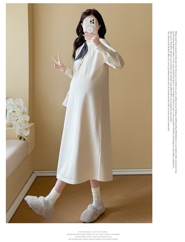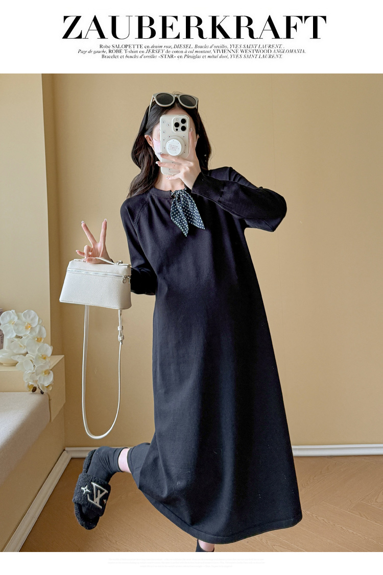 실사 출산 착용 2026 봄 드레스 새로운 루즈핏 슬림해 보이는 연령 감소 품격 스카프 중간 길이 니트 드레스