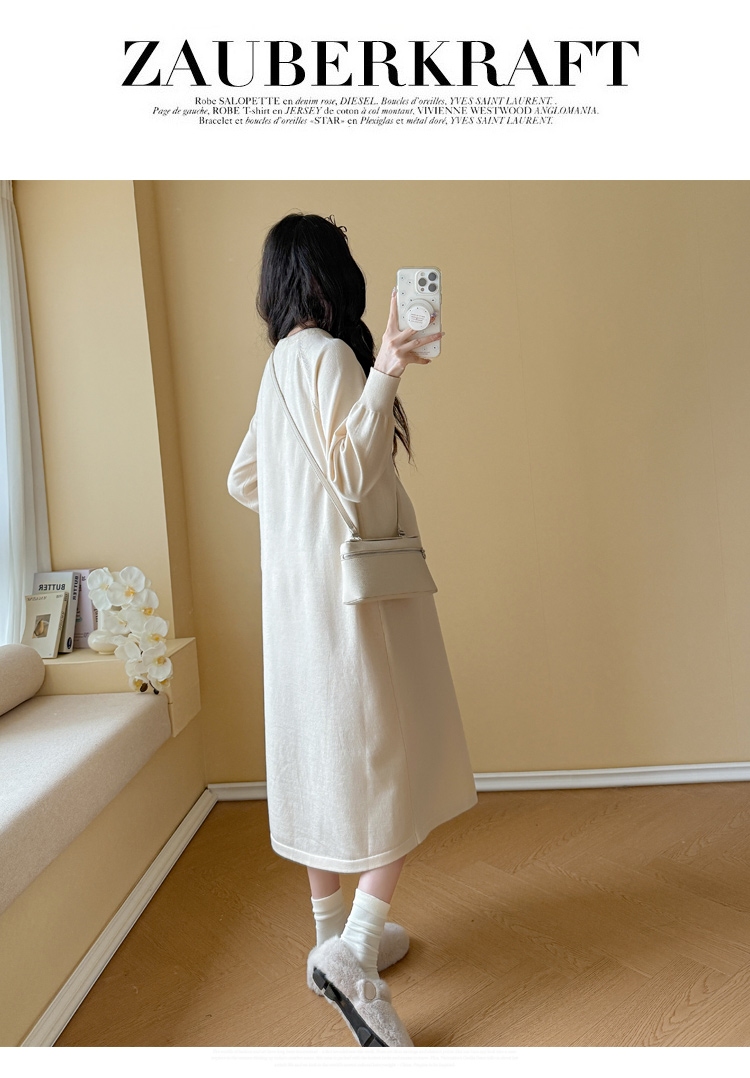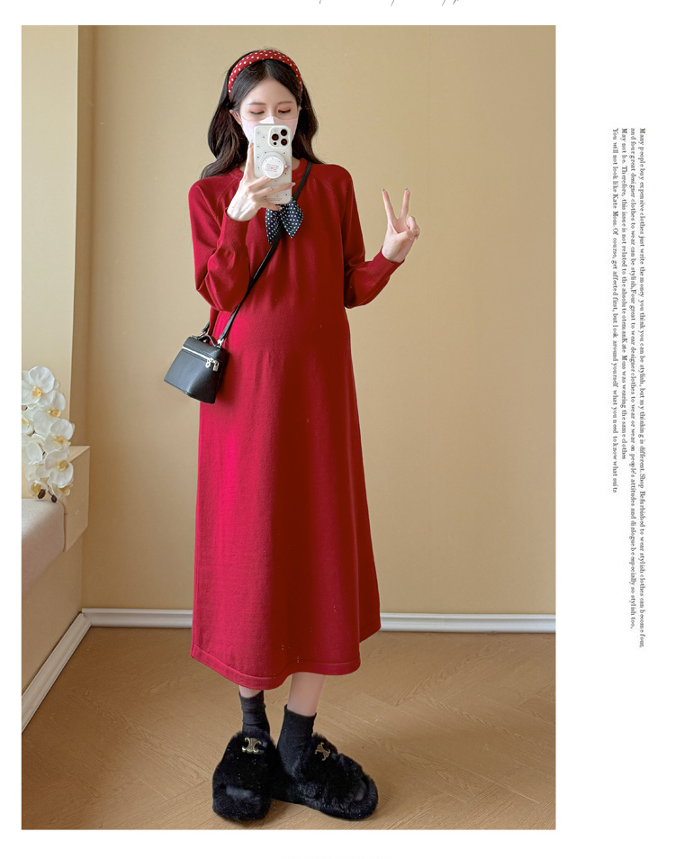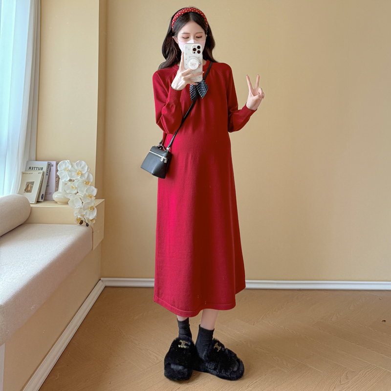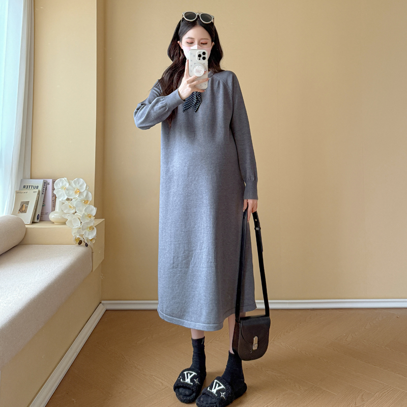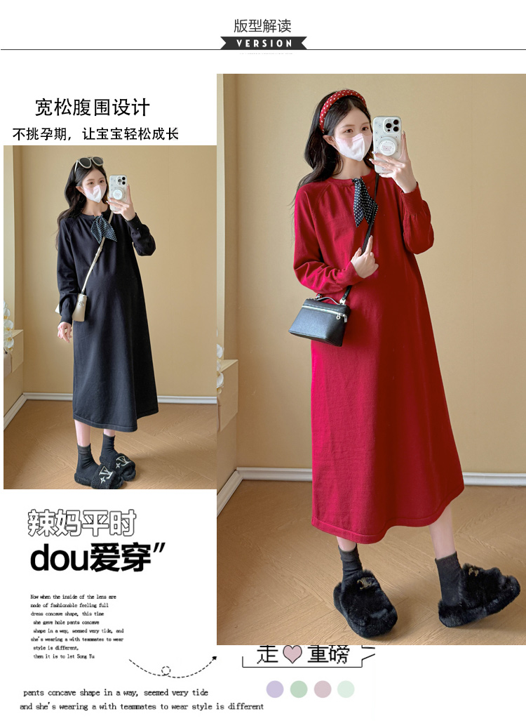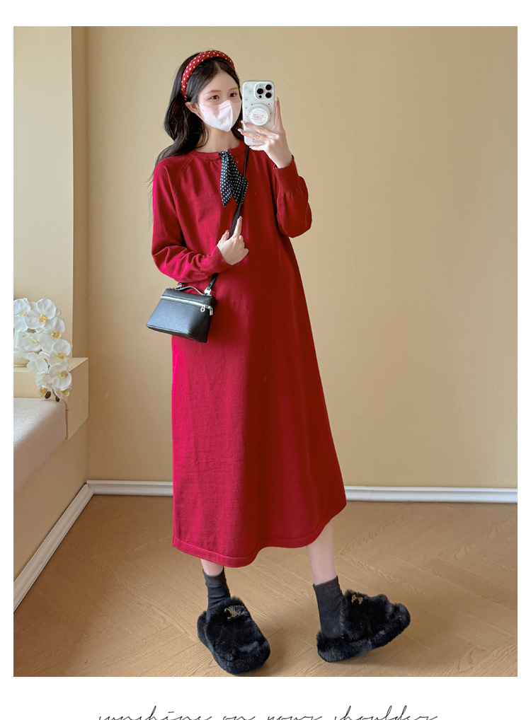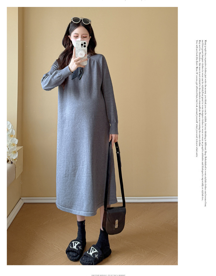 실사 출산 착용 2026 봄 드레스 새로운 루즈핏 슬림해 보이는 연령 감소 품격 스카프 중간 길이 니트 드레스