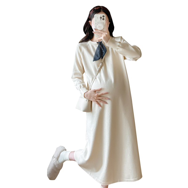 실사 2026 이른 봄 가을 새로운 슬림해 보이는 여성 자수 패키지 과립 버클 중간 길이 임산부 polo 드레스