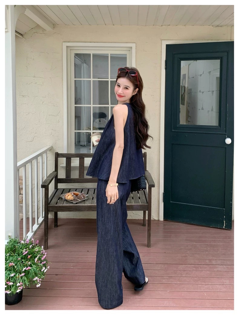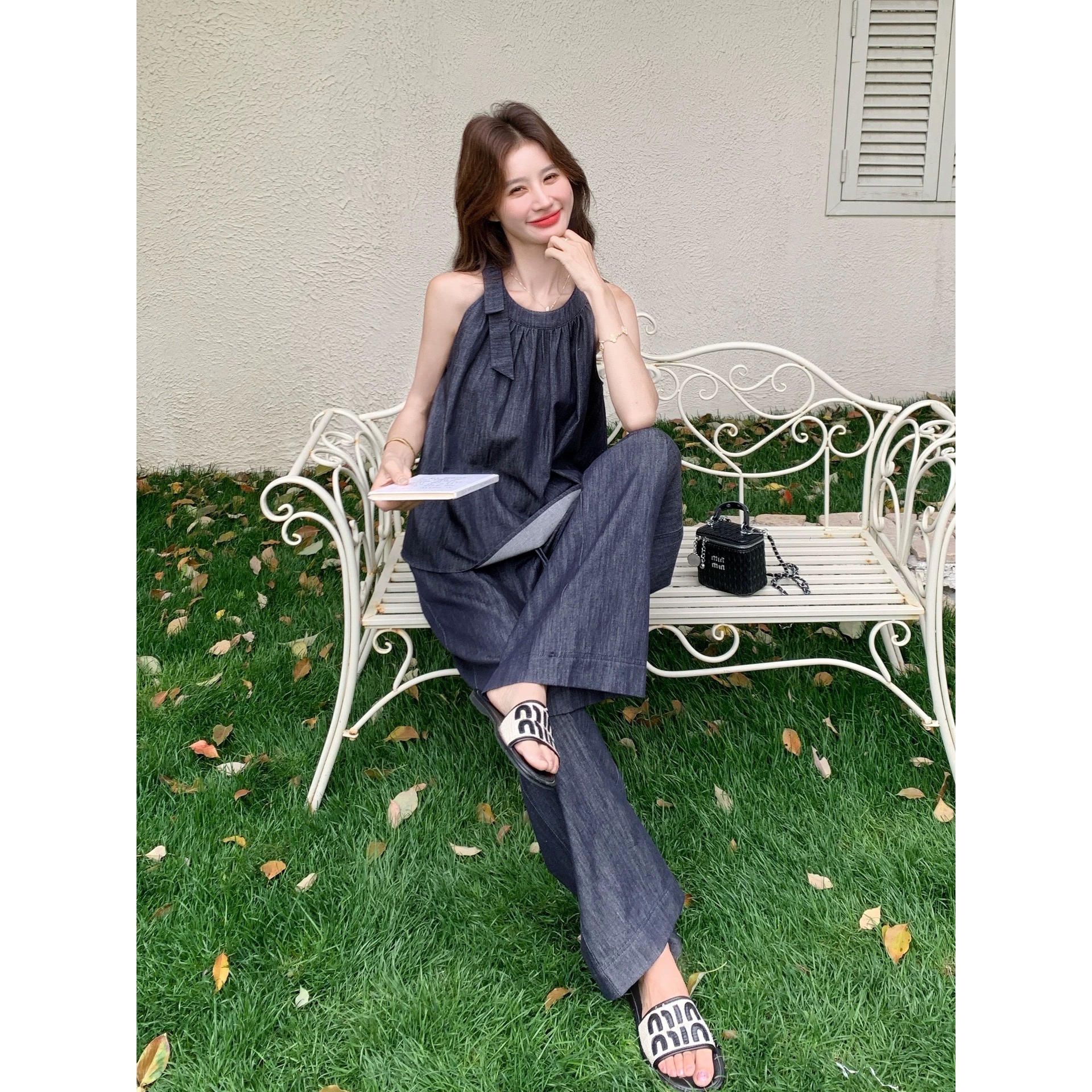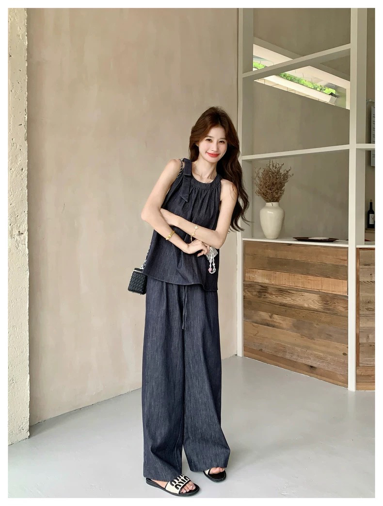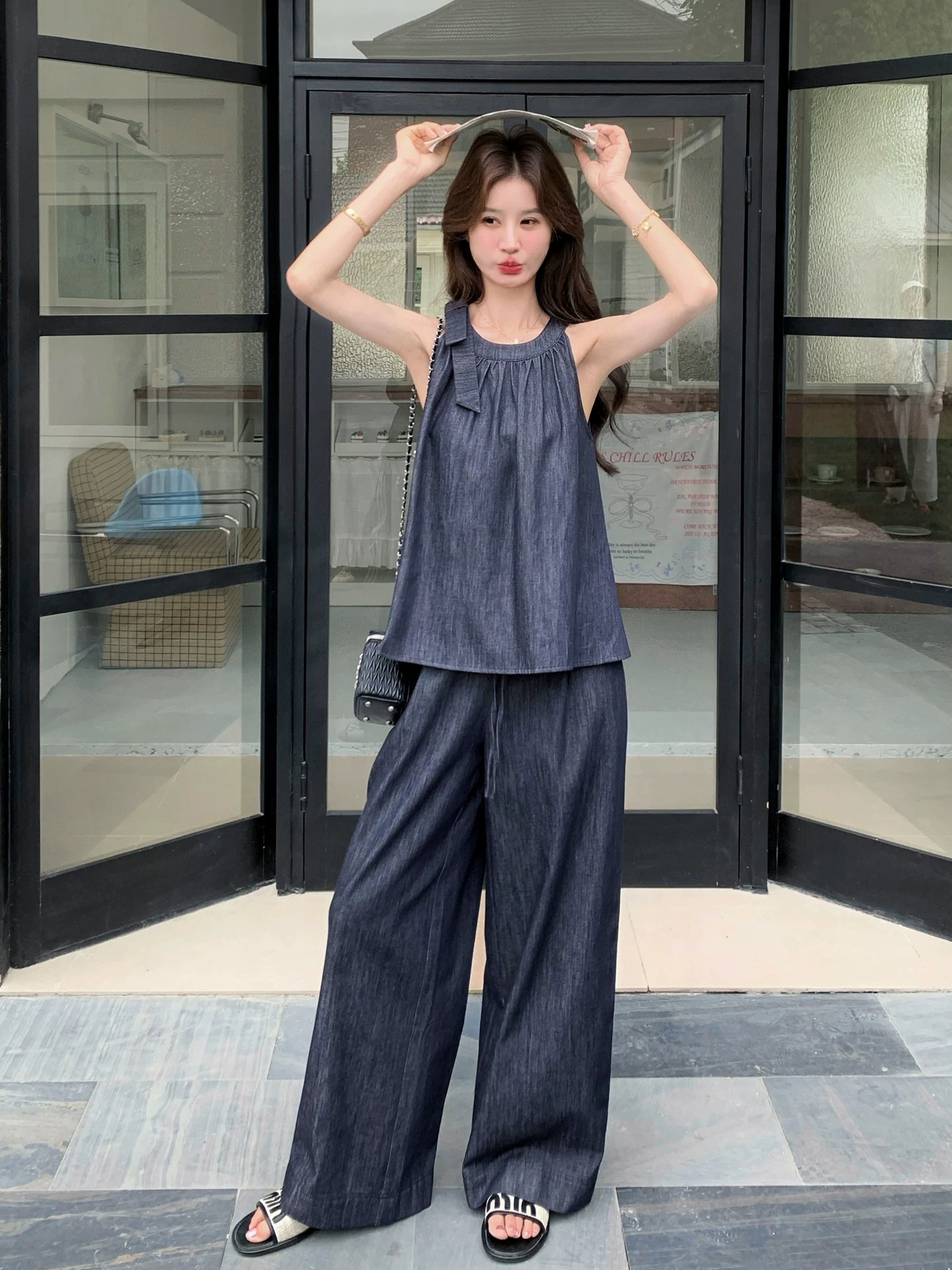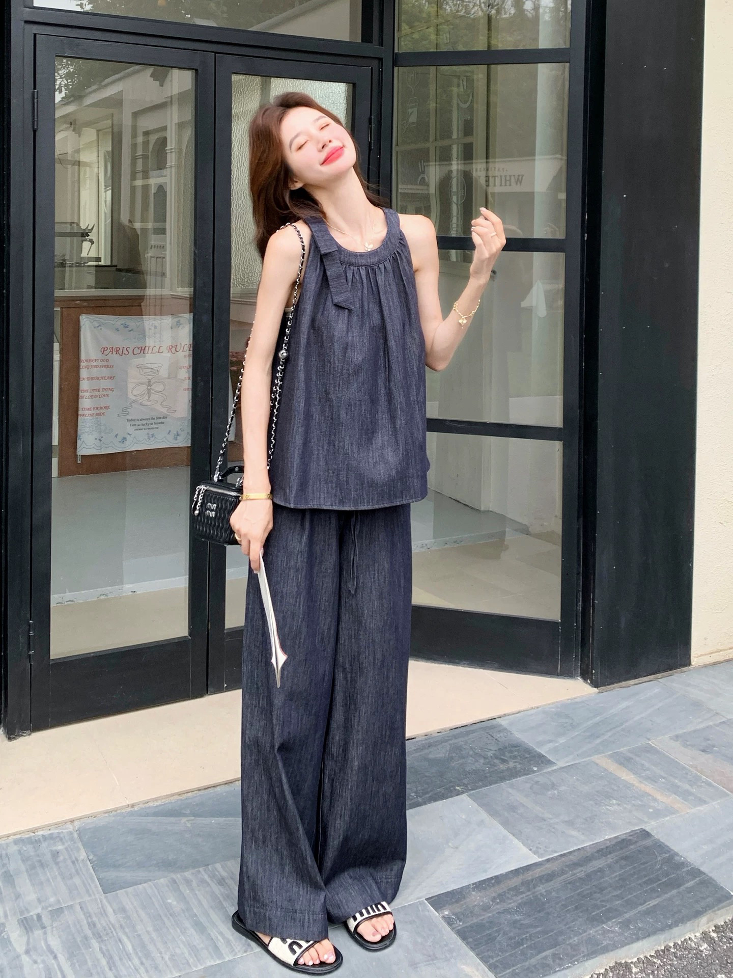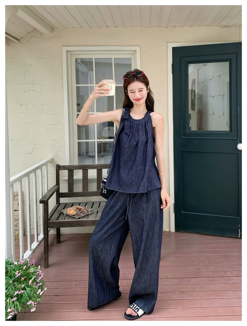 레트로 나비 매듭 행침 목 데님 조끼 캐주얼 와이드 레그 팬츠 두 조각 여성 세트 2026 여름 ootd 착용 가져 가라. 세트