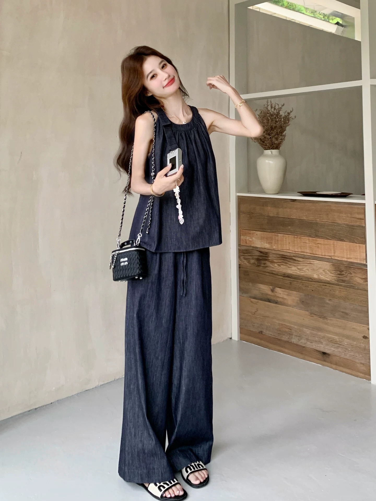 파란색 와이드 팬츠 데님 세트 여성 여름 2026 새로운 고유 한 아름다운 자이언트 잘 생긴 한 부서 착용 가져 가라. 전체 집합
