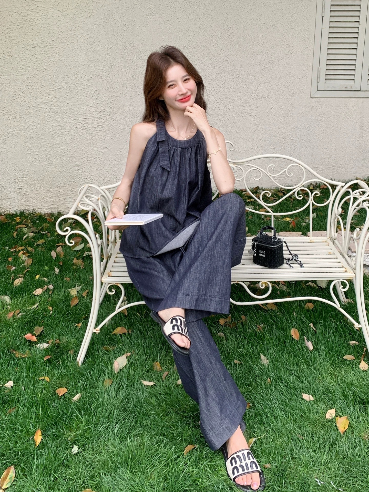 다시 차가운 다시 바람의 소리 데님 올인원 바지 세트 여성 여름 얇은 스타일 슈퍼 화재 잘 생긴 루즈핏 슬림해 보이는 캐주얼 넓은 다리 원피스 의류
