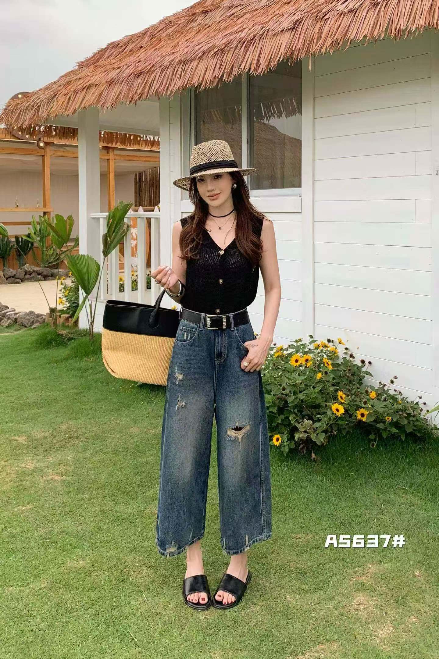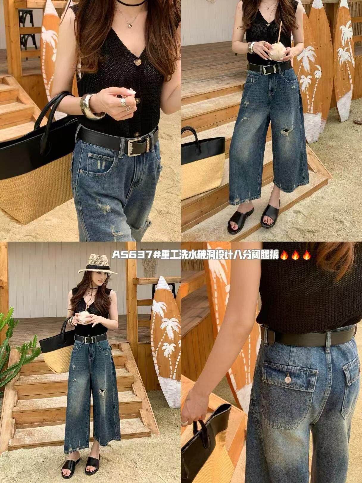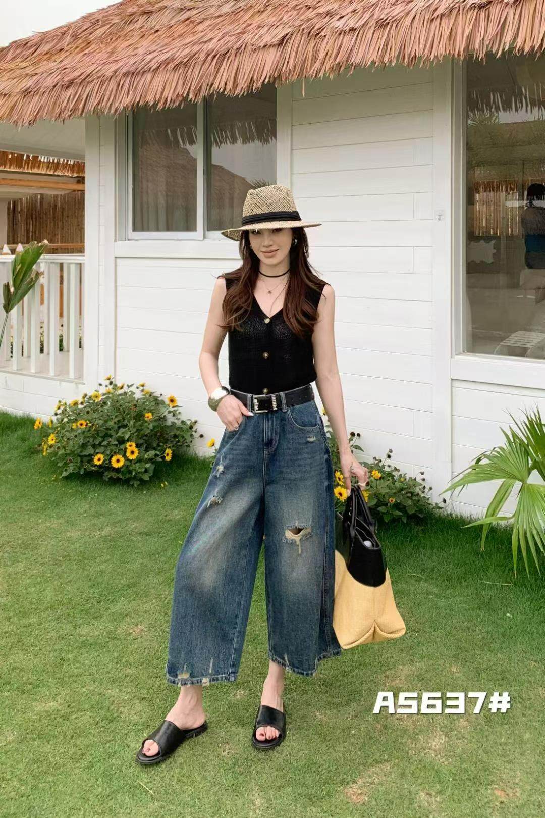 트렌디 공주 66085 찢어진 부분 7 점 와이드 레그 팬츠 2026 여름 새로운 패션 트렌디 다용도 루즈핏 슬림해 보이는 청바지