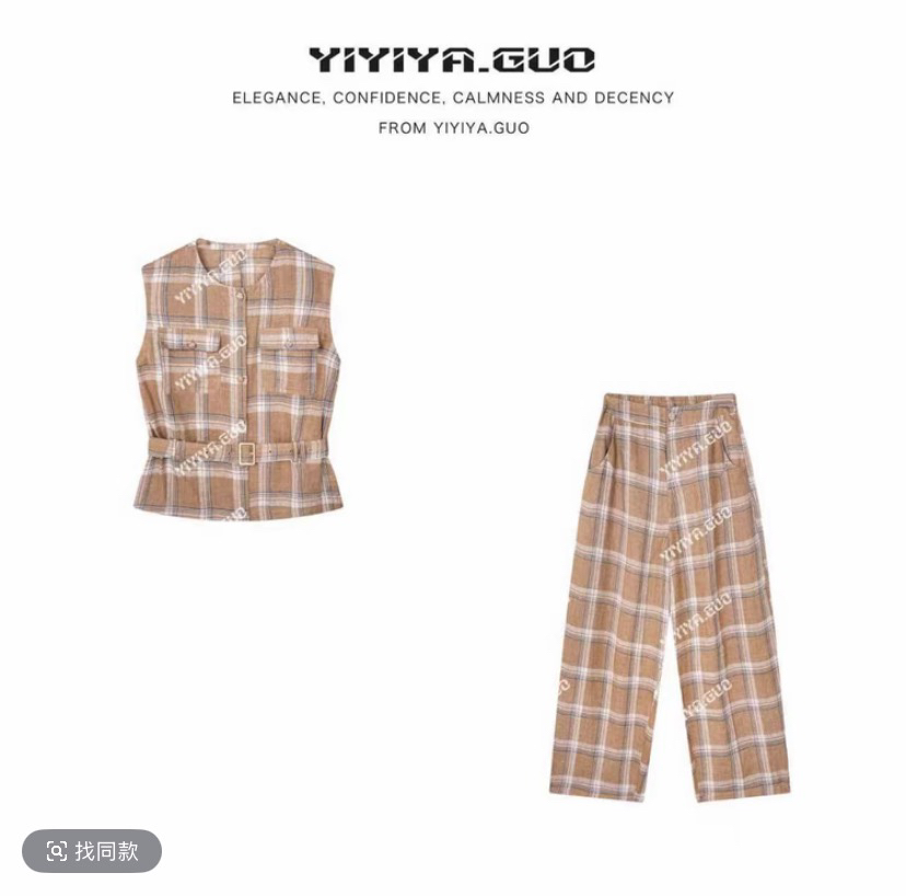 yiyiya.guo 예술 예술 아 크리 딘 오래된 돈 체크무늬 패션 레트로 주머니 베스트 바지 세트 16431ss5
