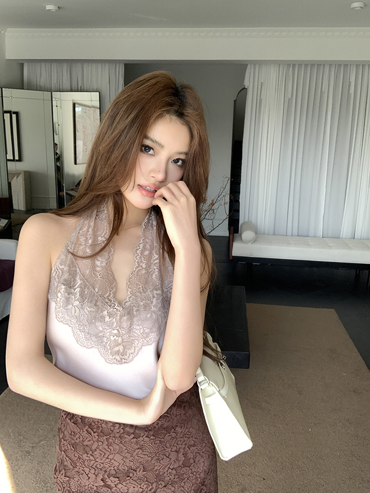 실사 2026 봄 여름 새로운 디자인 레이스 조각 행침 목 조끼 슬립 여성 섹시함 순수한 욕망 품격 맨위