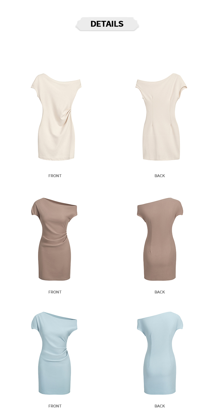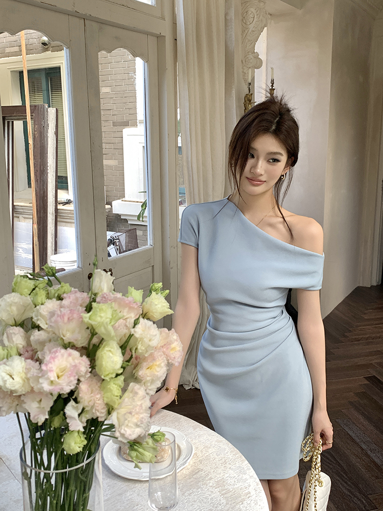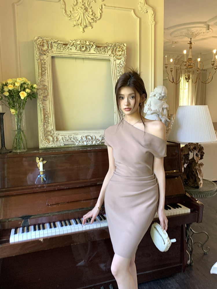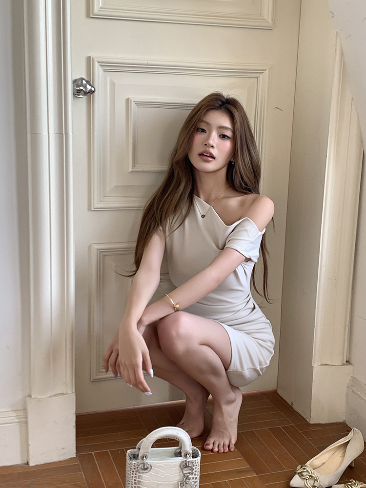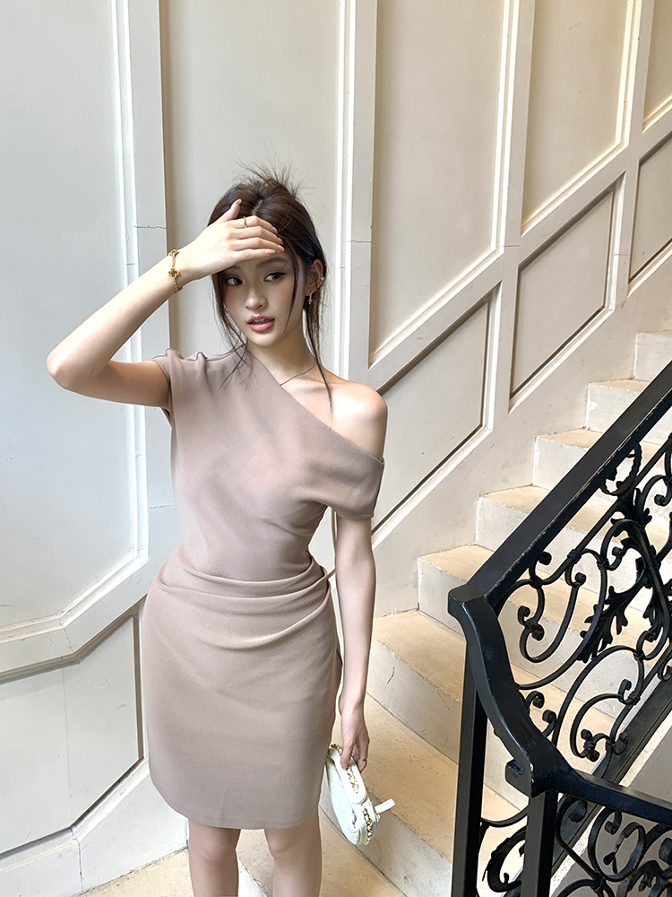 실사 2026 봄 여름 새로운 품격 비스듬한 어깨 백리스 여성 드레스 신축성 주름 몸매 가꾸기 섹시함 타이트 스커트 미니 스커트