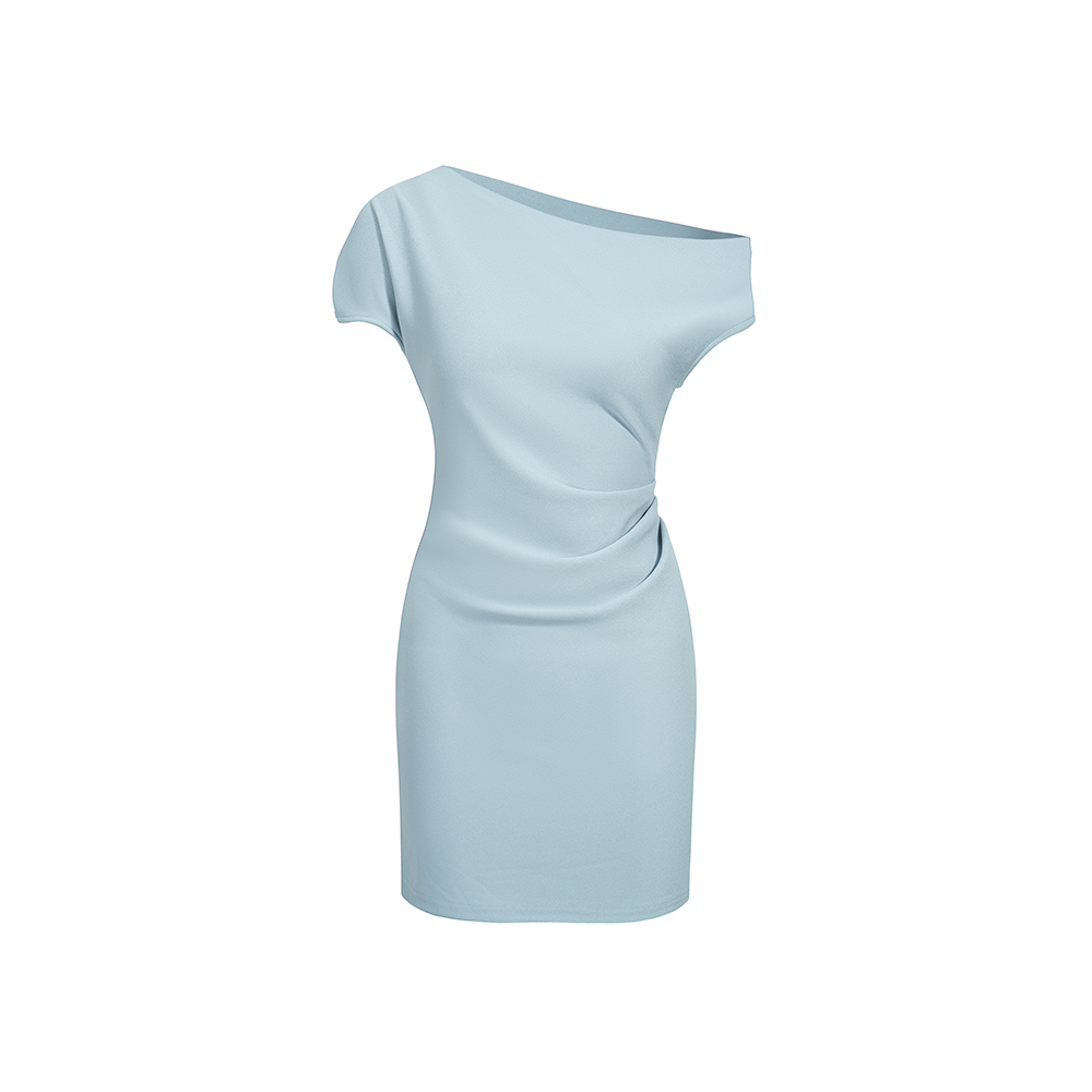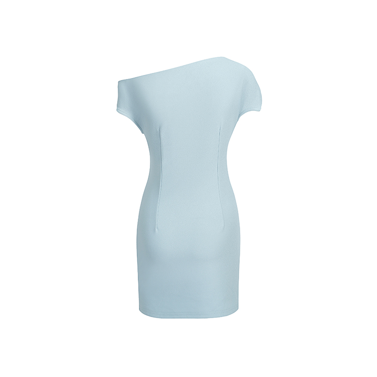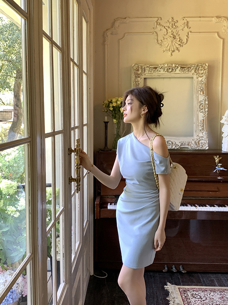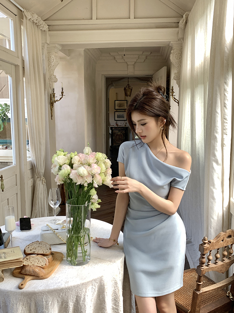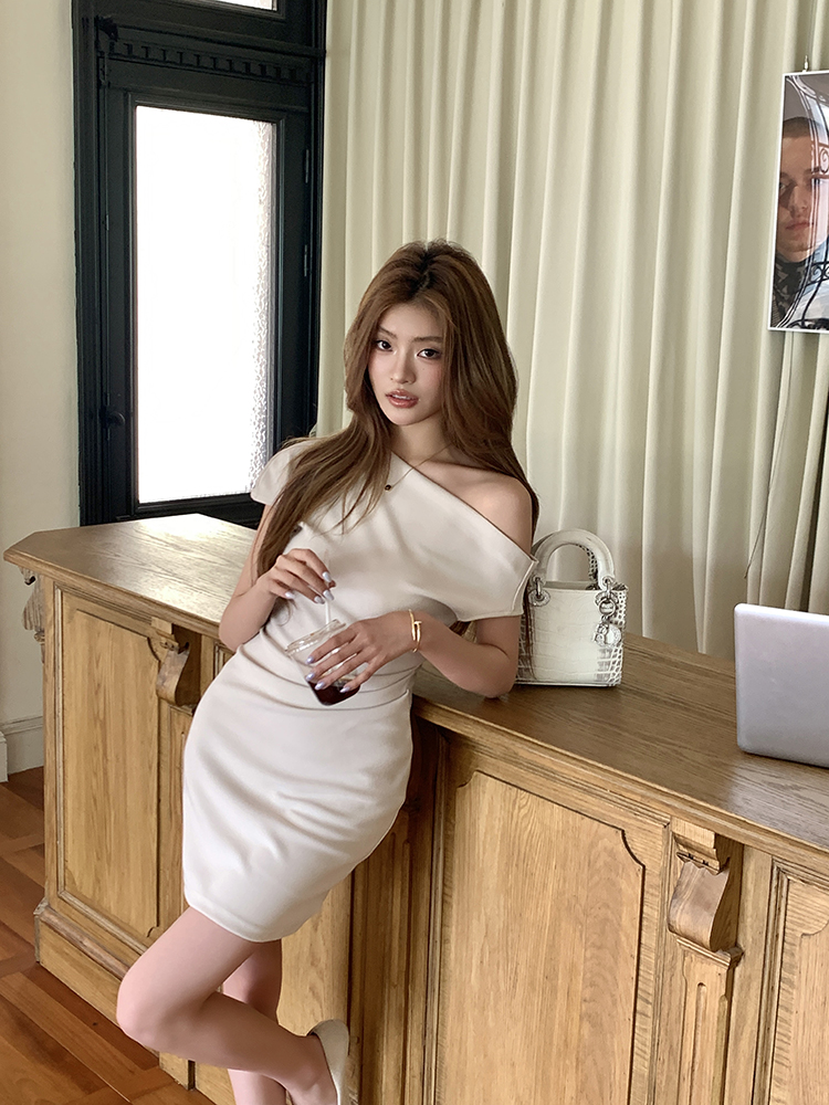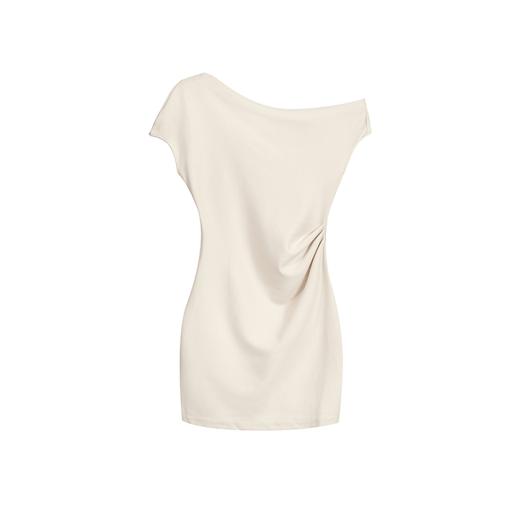 실사 2026 봄 여름 새로운 품격 비스듬한 어깨 백리스 여성 드레스 신축성 주름 몸매 가꾸기 섹시함 타이트 스커트 미니 스커트