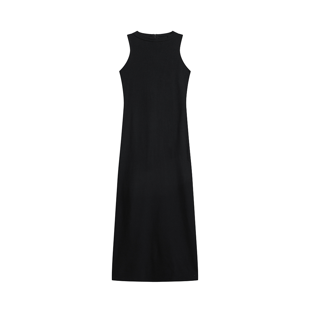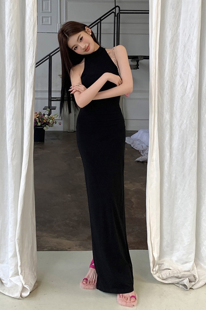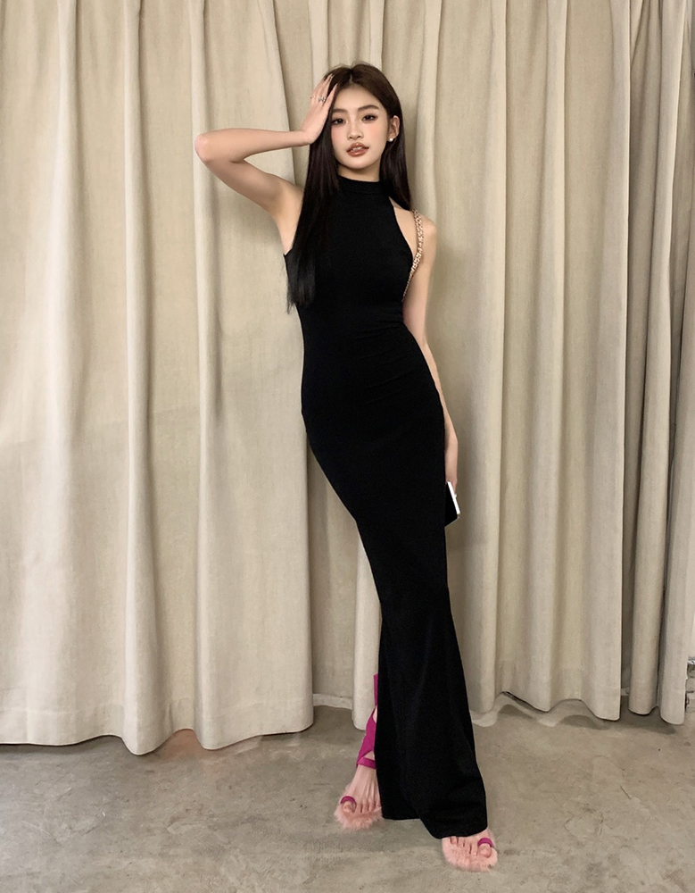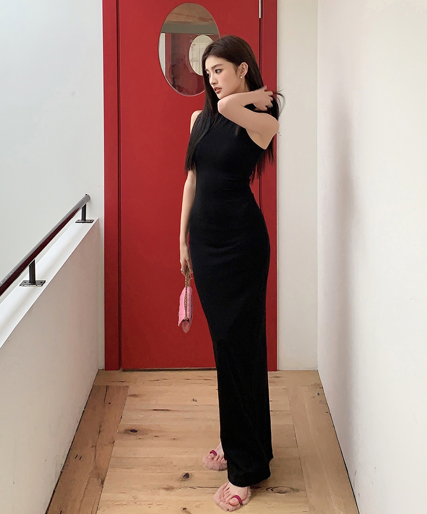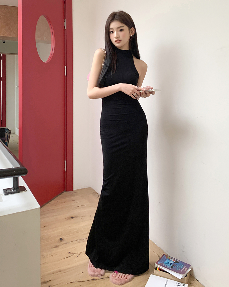 실사 2026 봄 여름 새로운 디자인 민소매 품격 터틀넥 수리 뒤에 트임 고급 센스 여성 드레스 롱 스커트