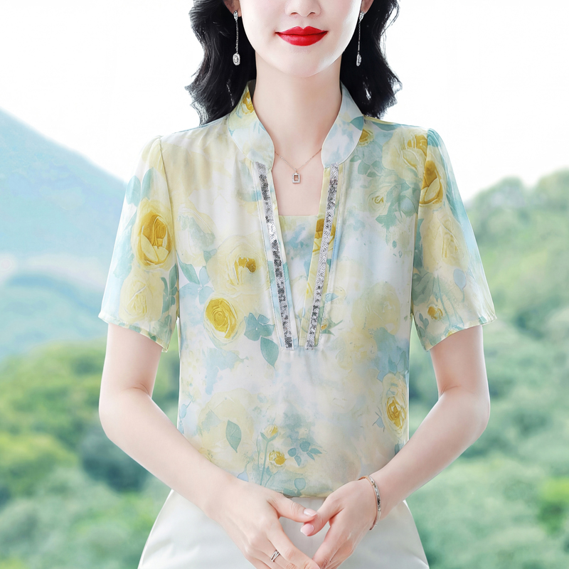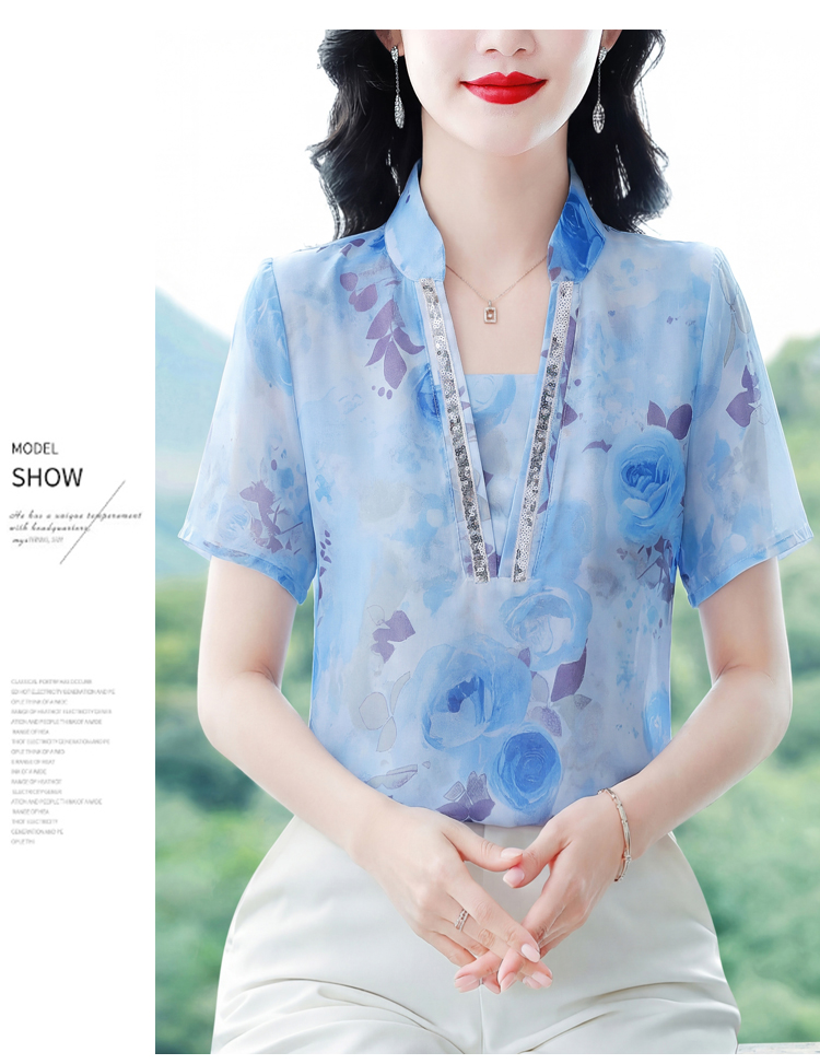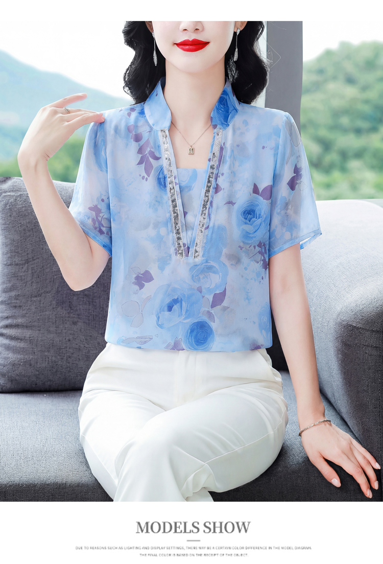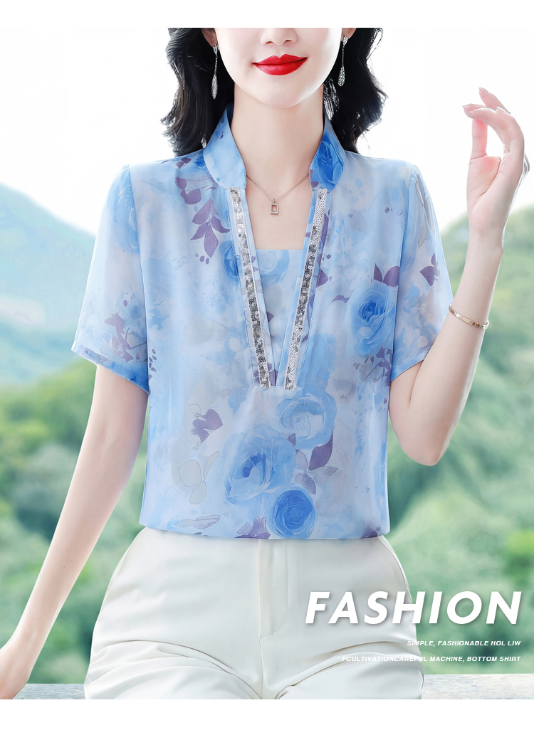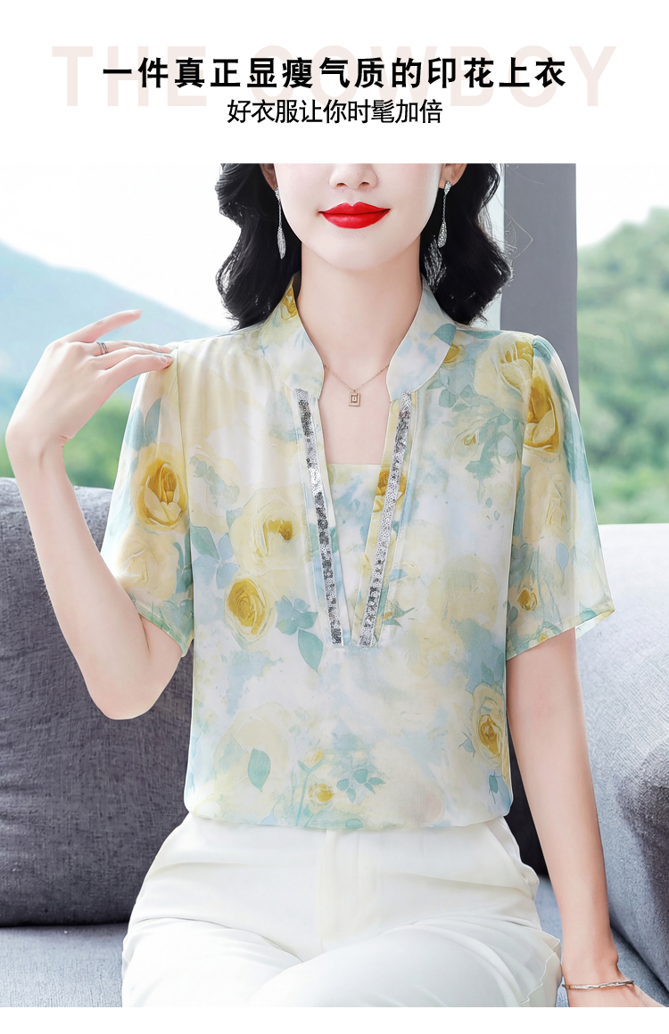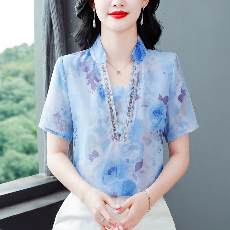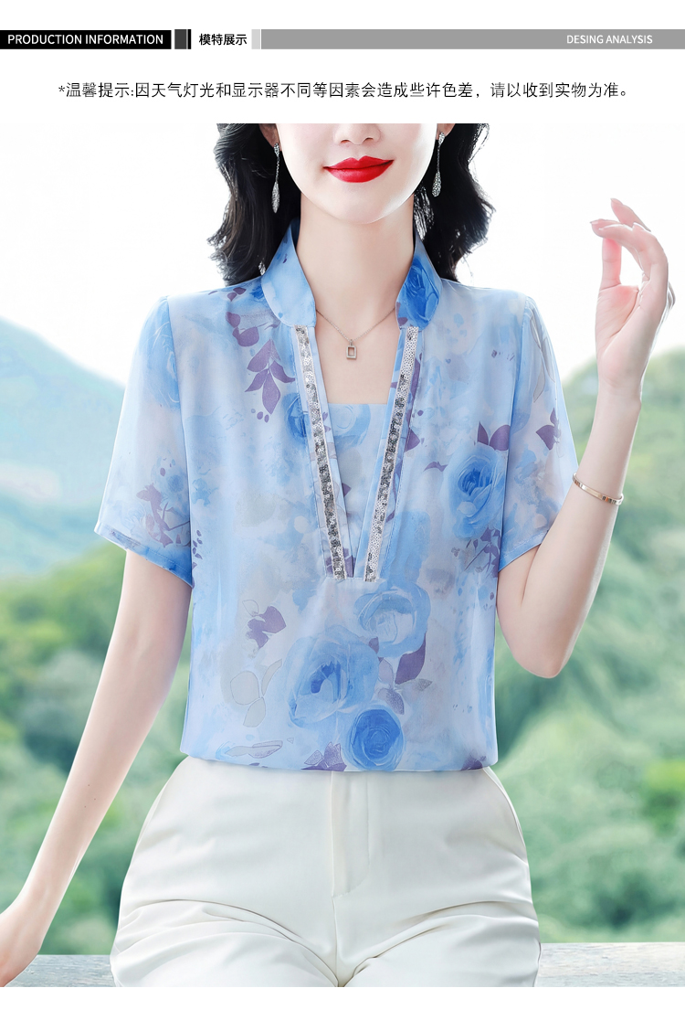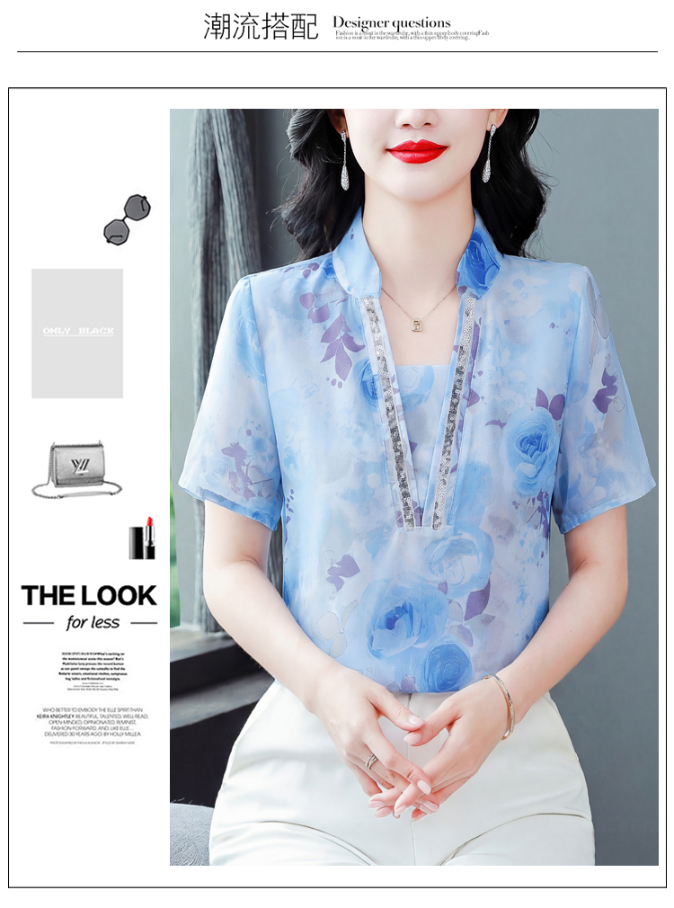 실사 2026 여름 여성 의류 새로운 V넥 프린트 쉬폰 블라우스 반팔 루즈핏 슬림해 보이는 다용도 외국 가스 기본 셔츠