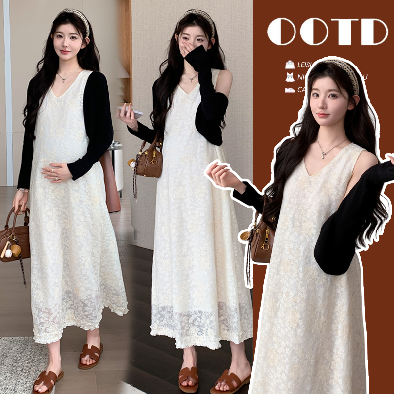 실사 인터넷 유명인 출산 착용 자외선 차단 패션 슬림해 보이는 슬립 드레스 품격 임산부 투피스 세트 임산부 세트