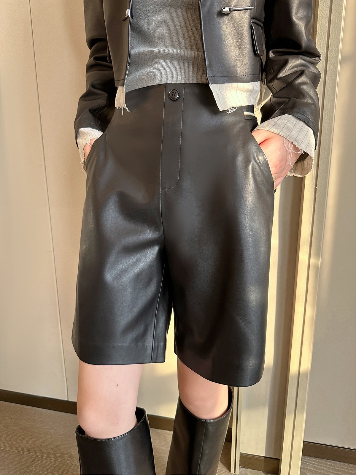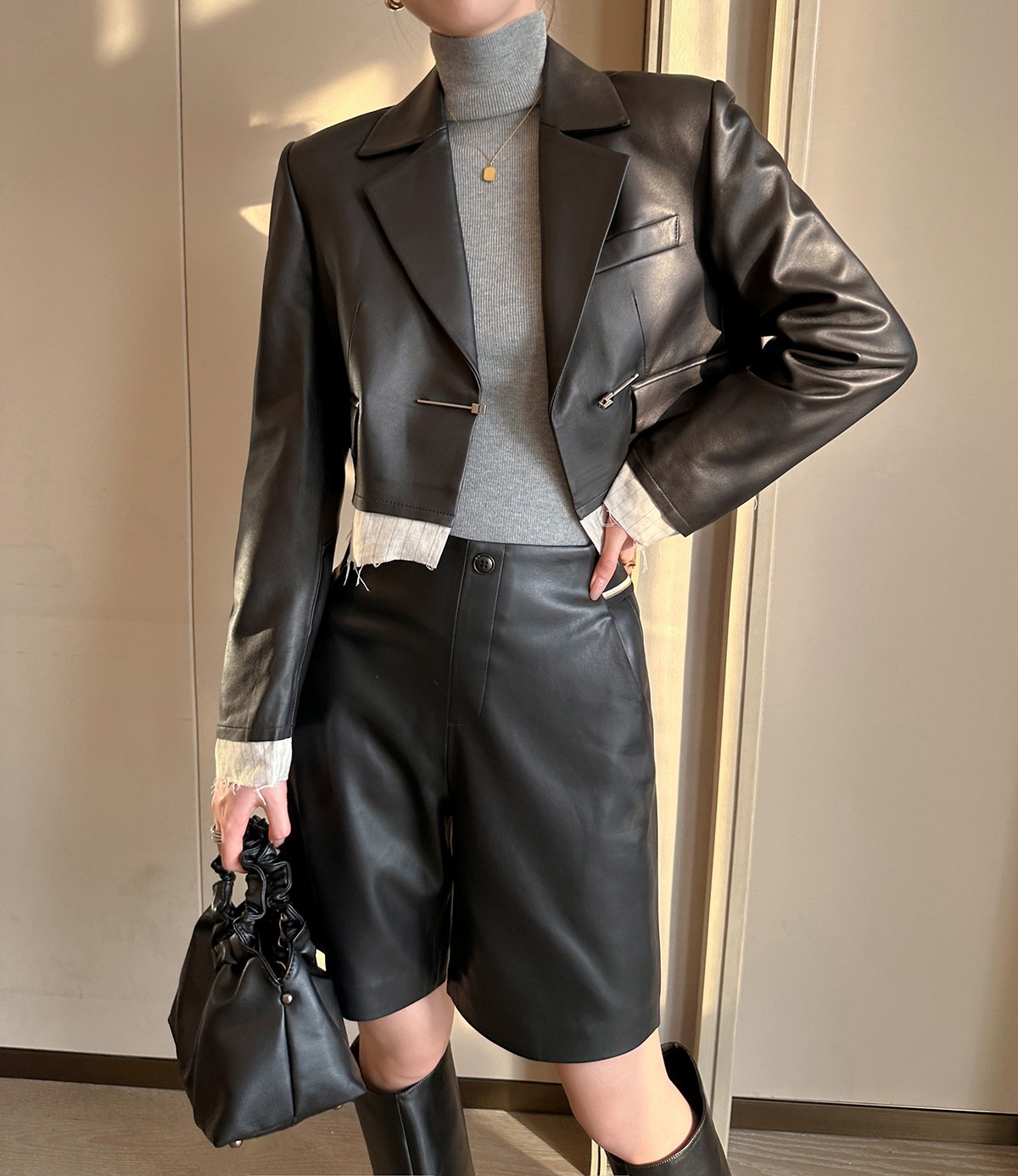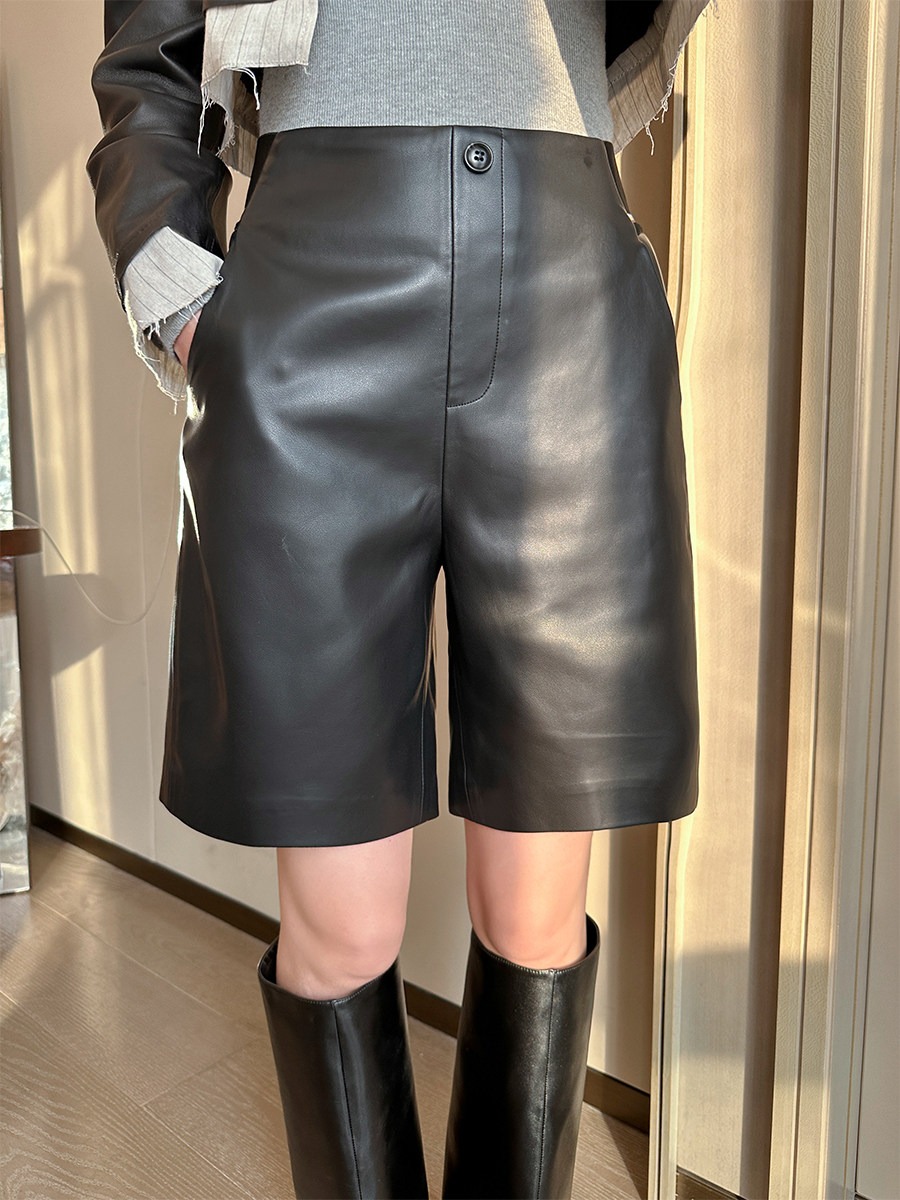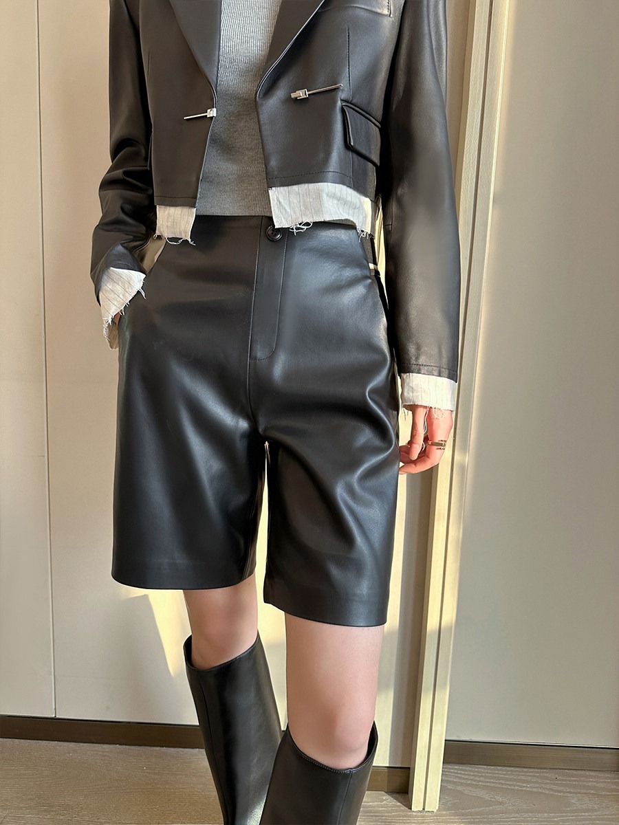 검정색 PU 가죽 5 점 캐주얼 바지 여성 가을 2025 새로운 품격 다용도 넓은 다리 슬림해 보이는 반바지