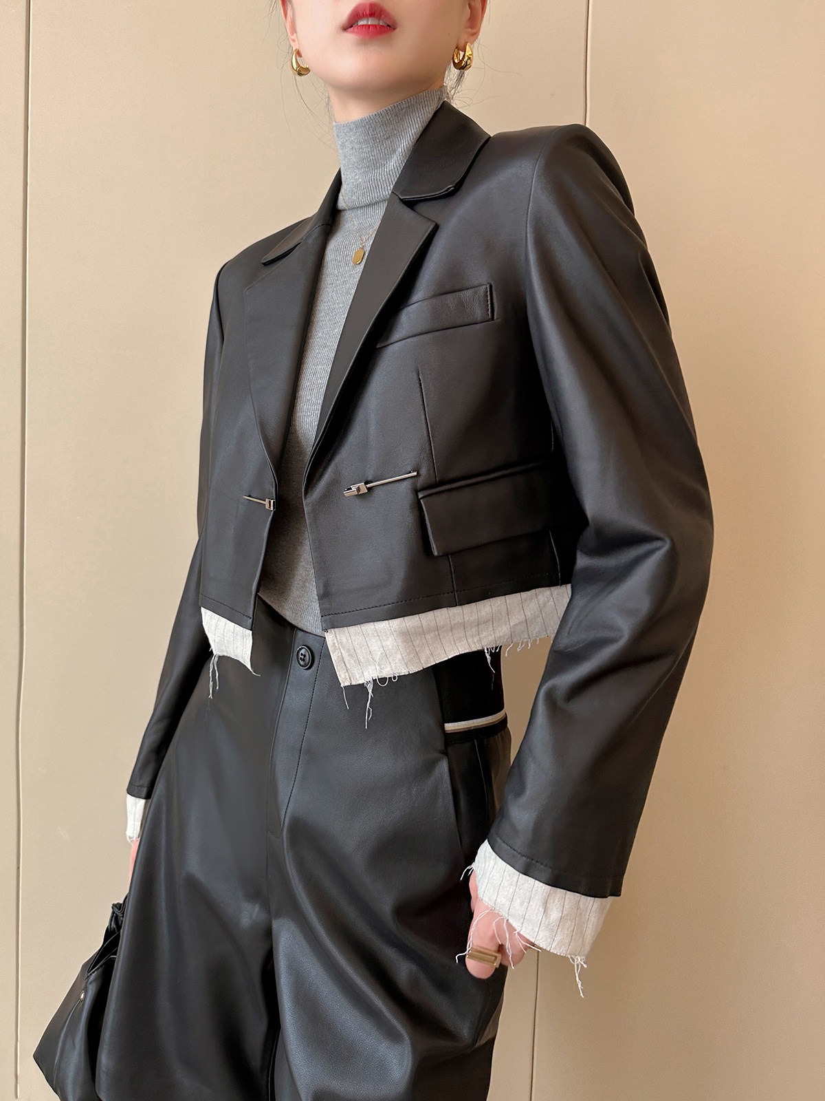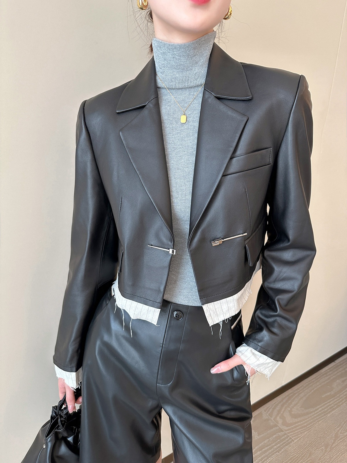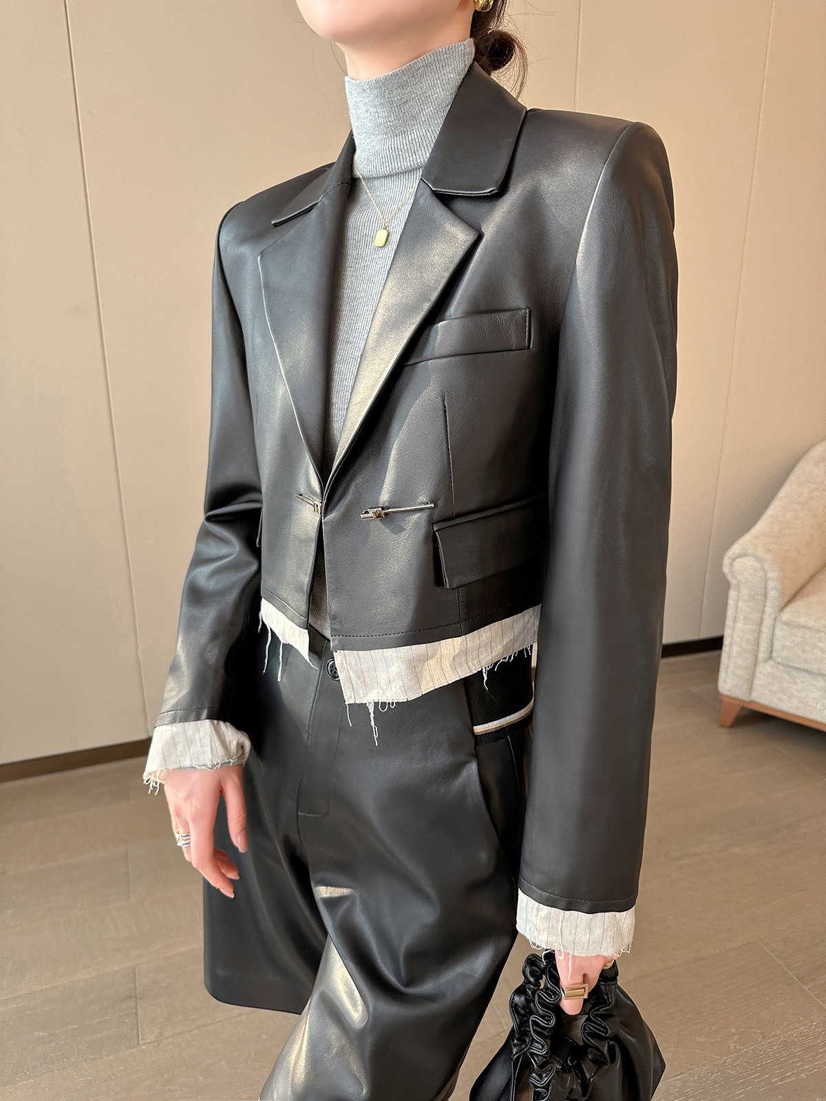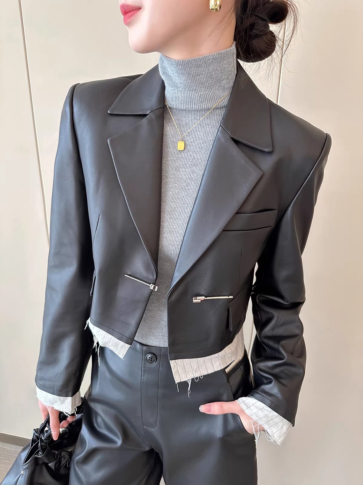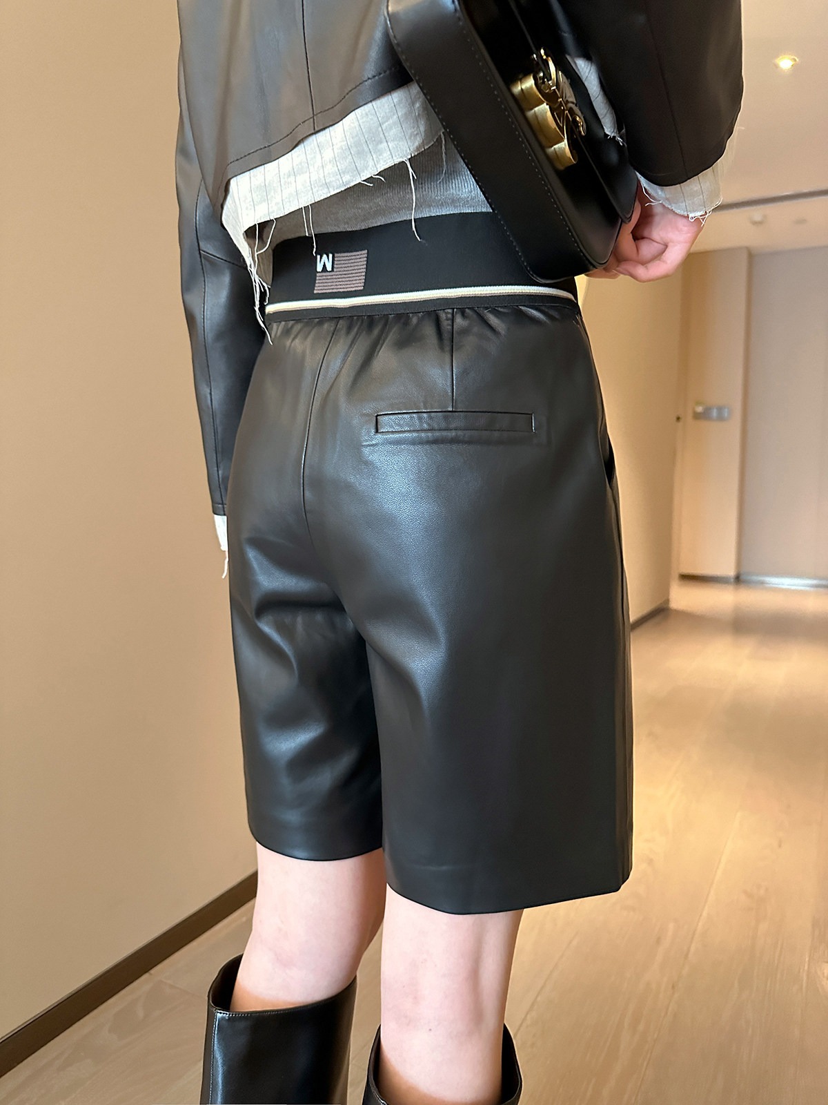검정색 PU 가죽 5 점 캐주얼 바지 여성 가을 2025 새로운 품격 다용도 넓은 다리 슬림해 보이는 반바지