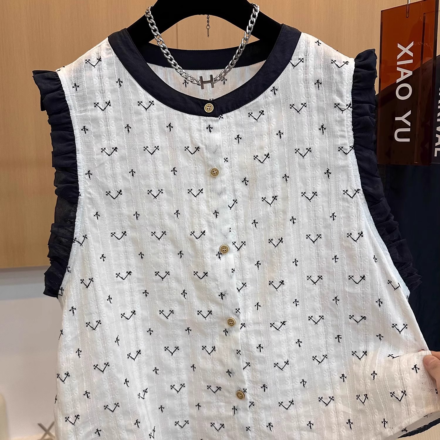 3784 면 린넨 라운드 넥 자수 네클라인 장식 외출용 베스트 조끼 여성 여름 민소매 작은 셔츠 슈퍼 잘 생긴 맨위