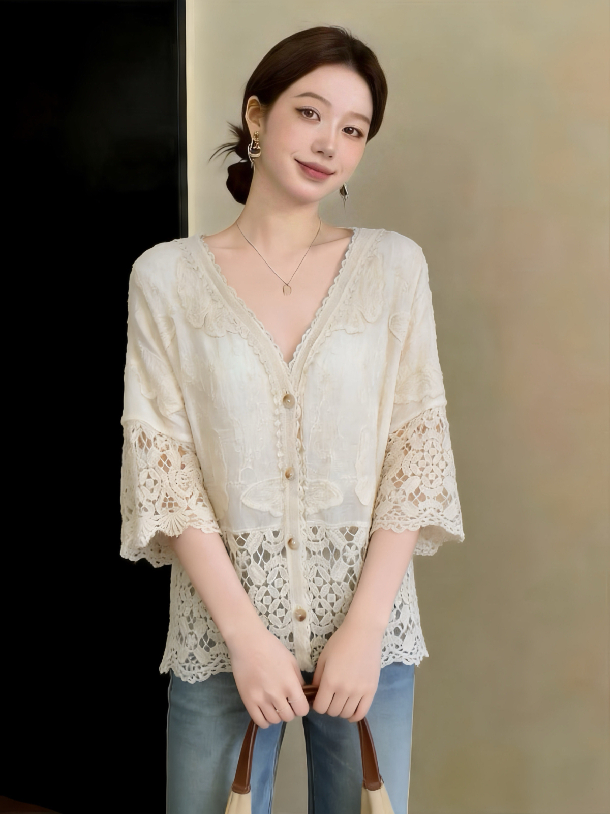 실사 빅 사이즈 프랑스식 홀로우 아웃 V넥 레이스 셔츠 오픈 가디건 여름 디자인 센스 얇은 스타일 홀로우 아웃 루즈핏 다용도 맨위
