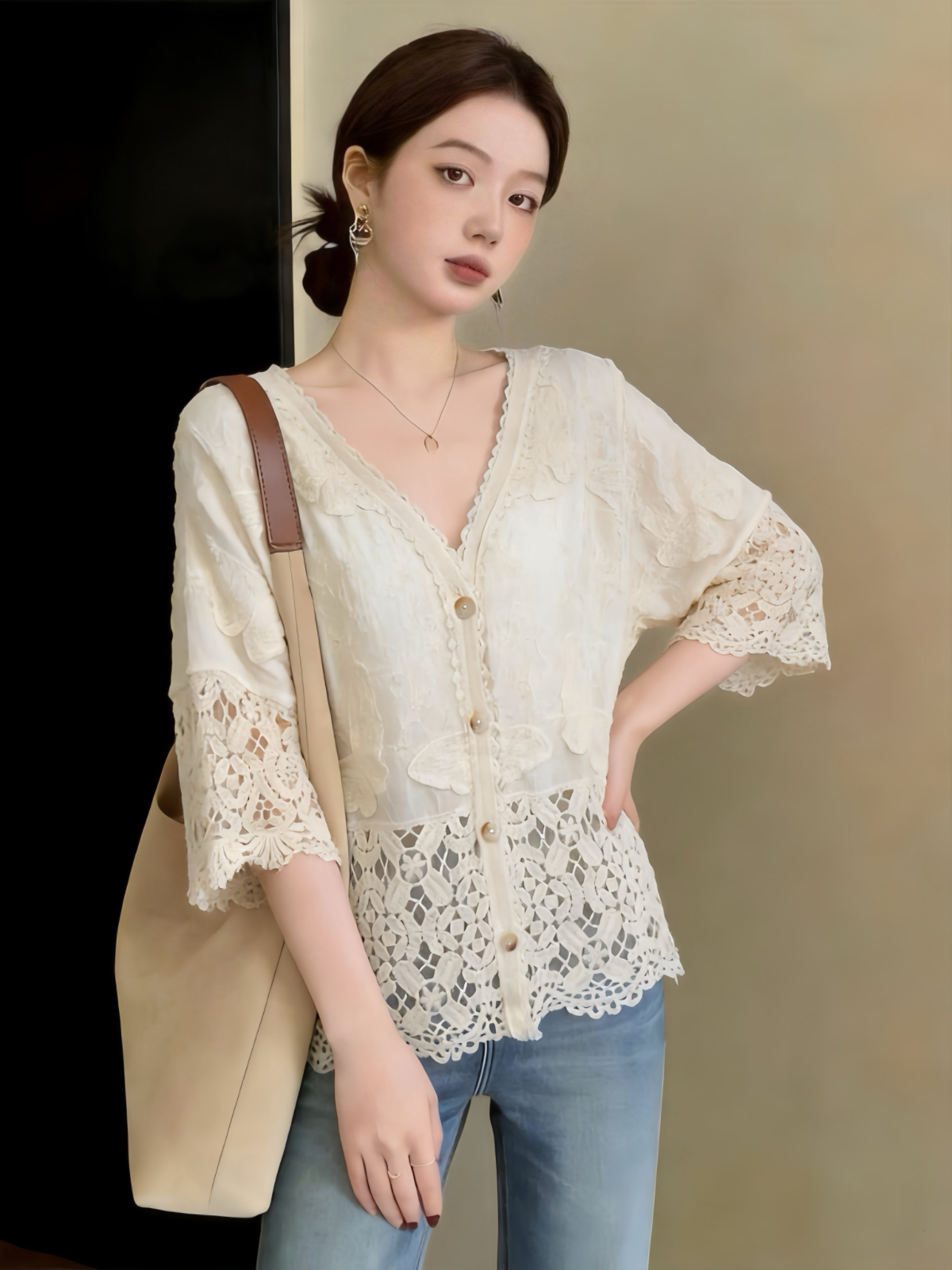 실사 빅 사이즈 프랑스식 홀로우 아웃 자수 V 넥 셔츠 레이스 자외선 차단 블라우스 여름 루즈핏 얇은 스타일 중간 소매 맨위