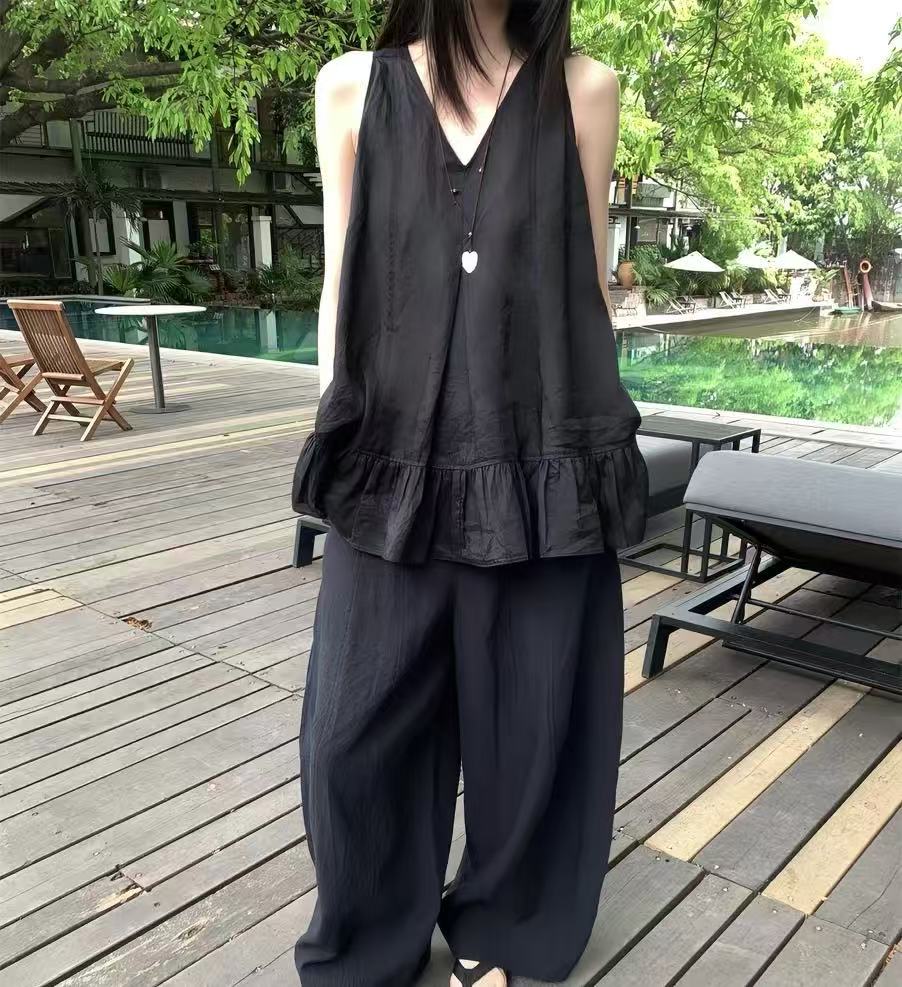 품격 V넥 레이스업 싱글 줄 버튼 캐미솔 작은 셔츠 하이웨이스트 루즈핏 스트레이트 와이드 레그 팬츠 세트 투피스 세트