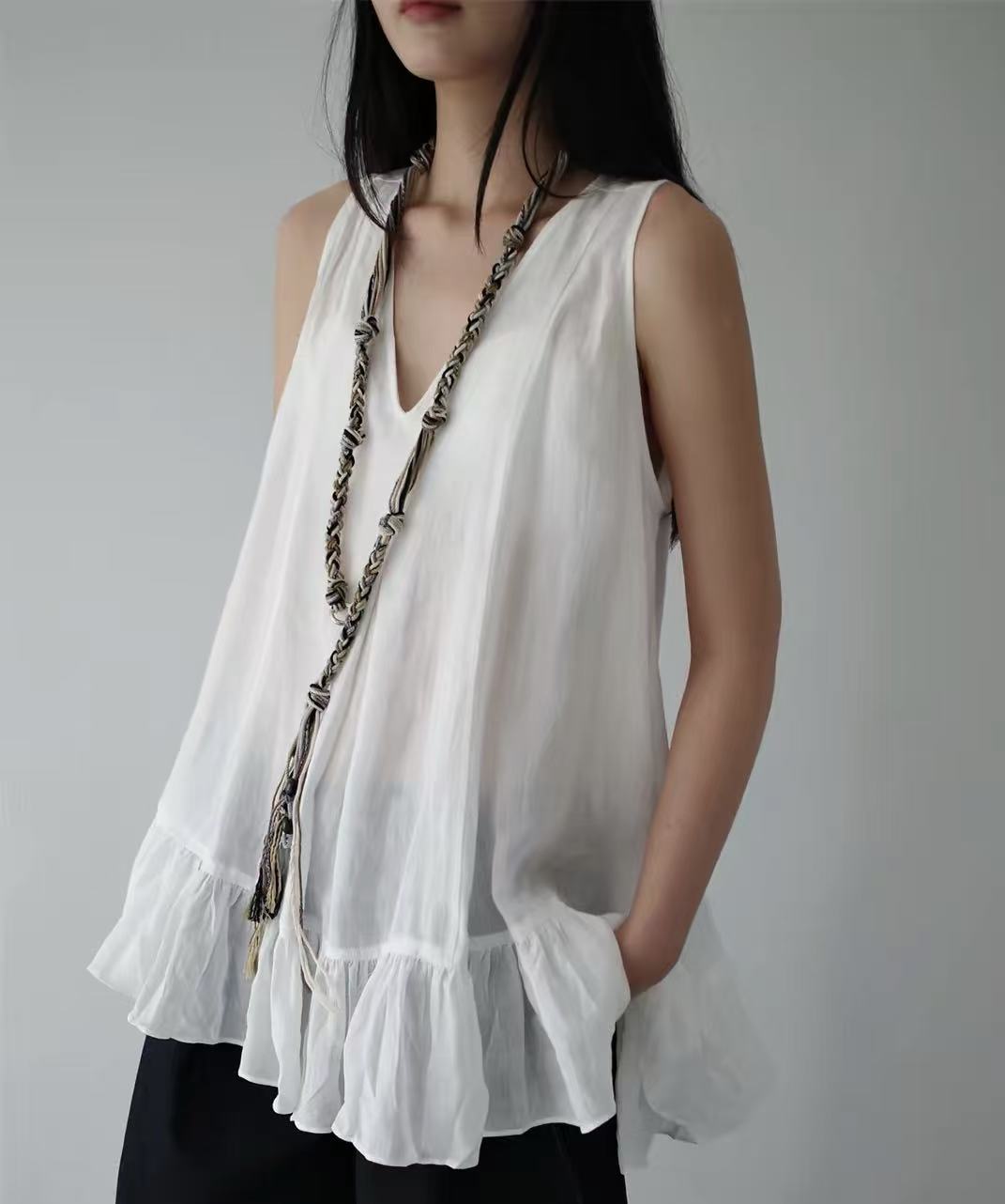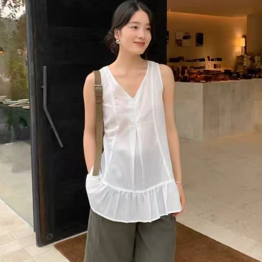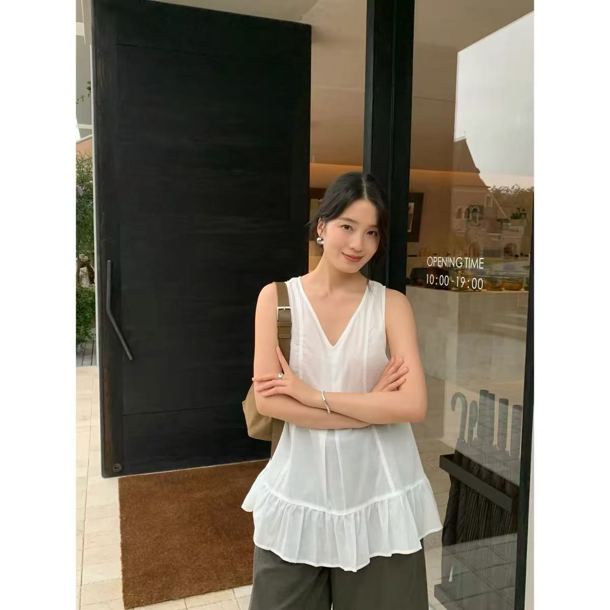 V넥 프릴 뒤로 스트랩 민소매 작은 셔츠 루즈핏 슬림해 보이는 조끼 스택 착용 맨위 여름 백리스 작은 셔츠