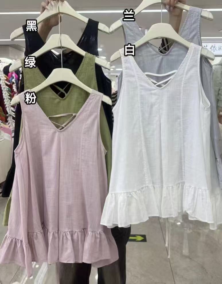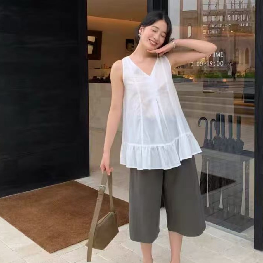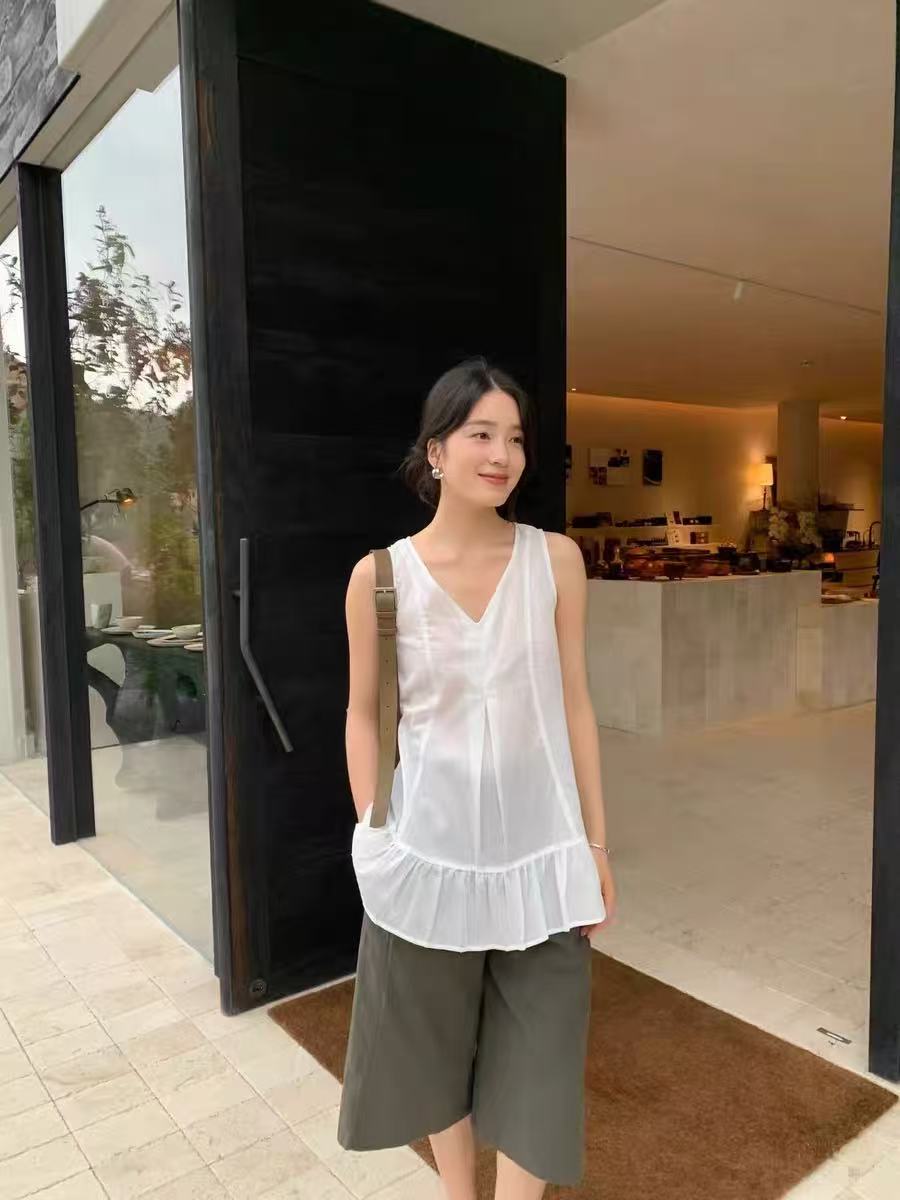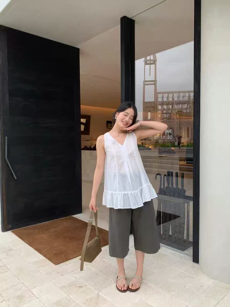 V넥 프릴 뒤로 스트랩 민소매 작은 셔츠 루즈핏 슬림해 보이는 조끼 스택 착용 맨위 여름 백리스 작은 셔츠