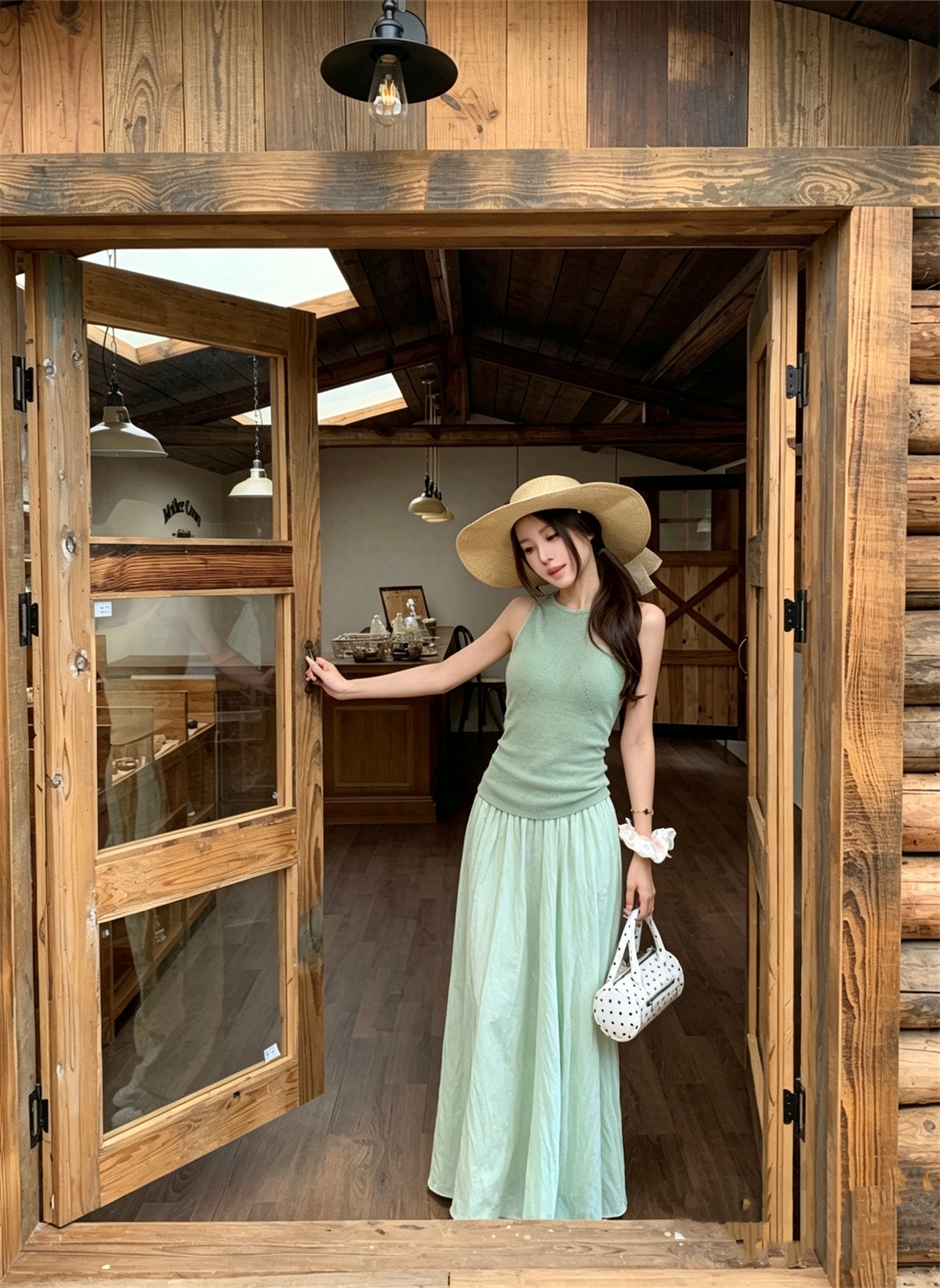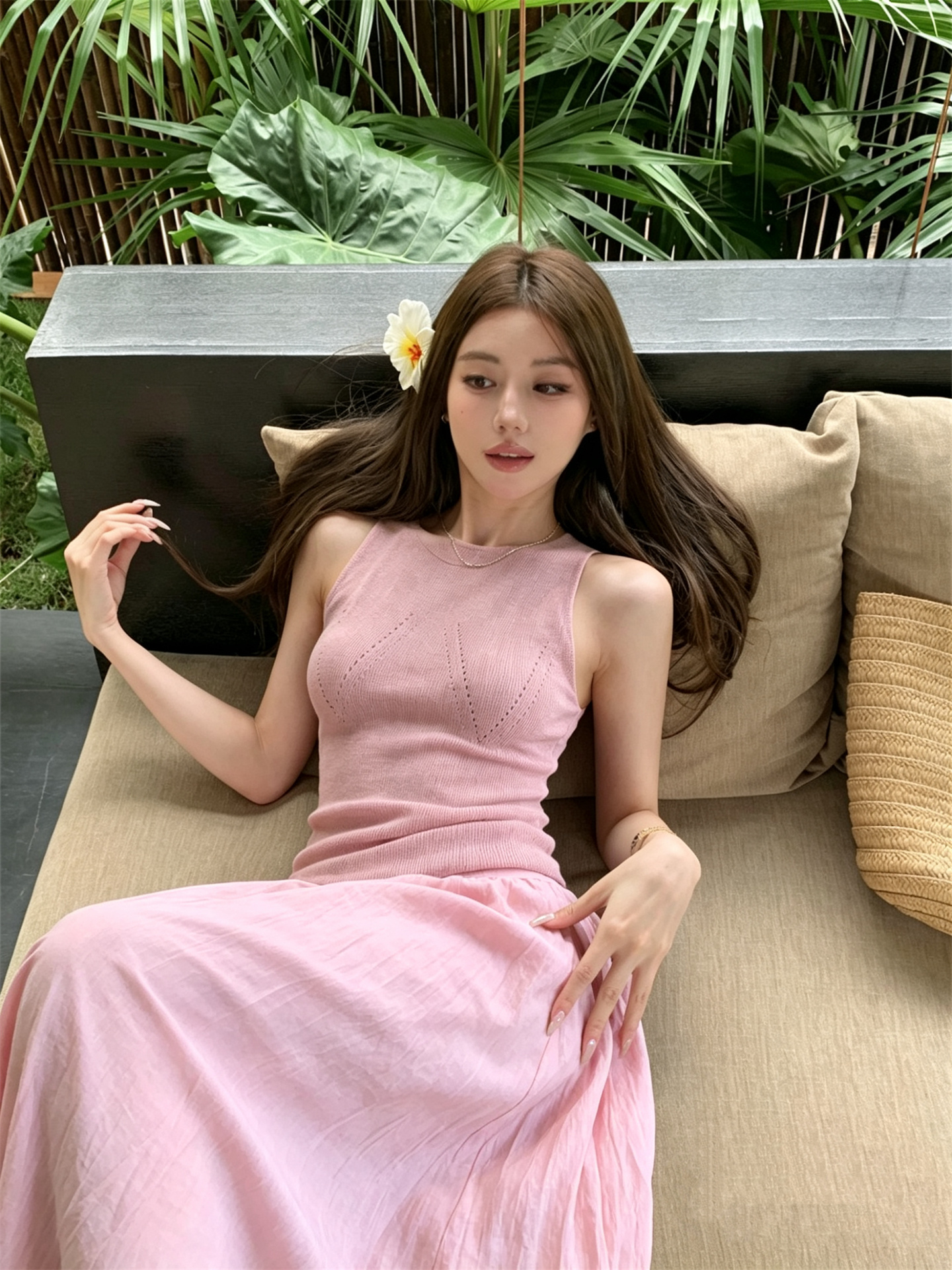 실사 정가 민소매 물결무늬 곡물 니트 행침 목 타이트 허리 수축 드레스