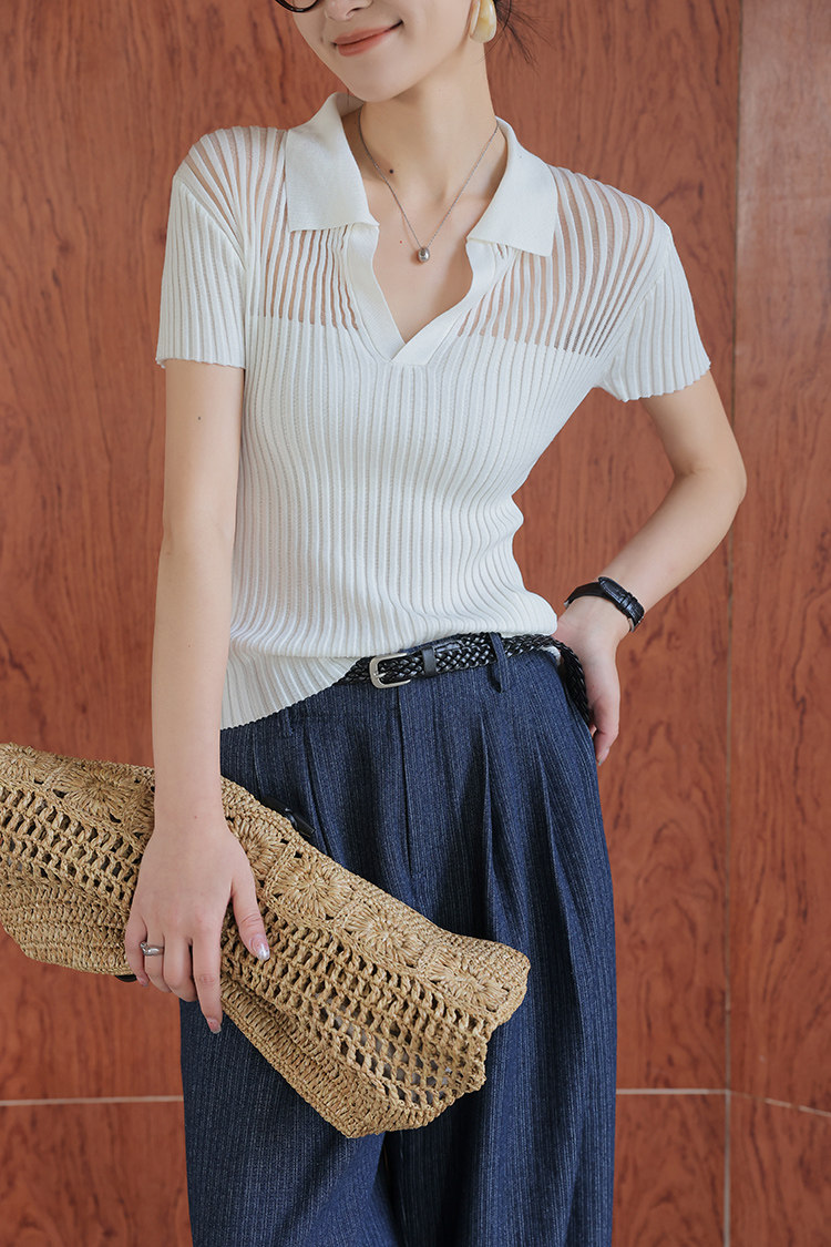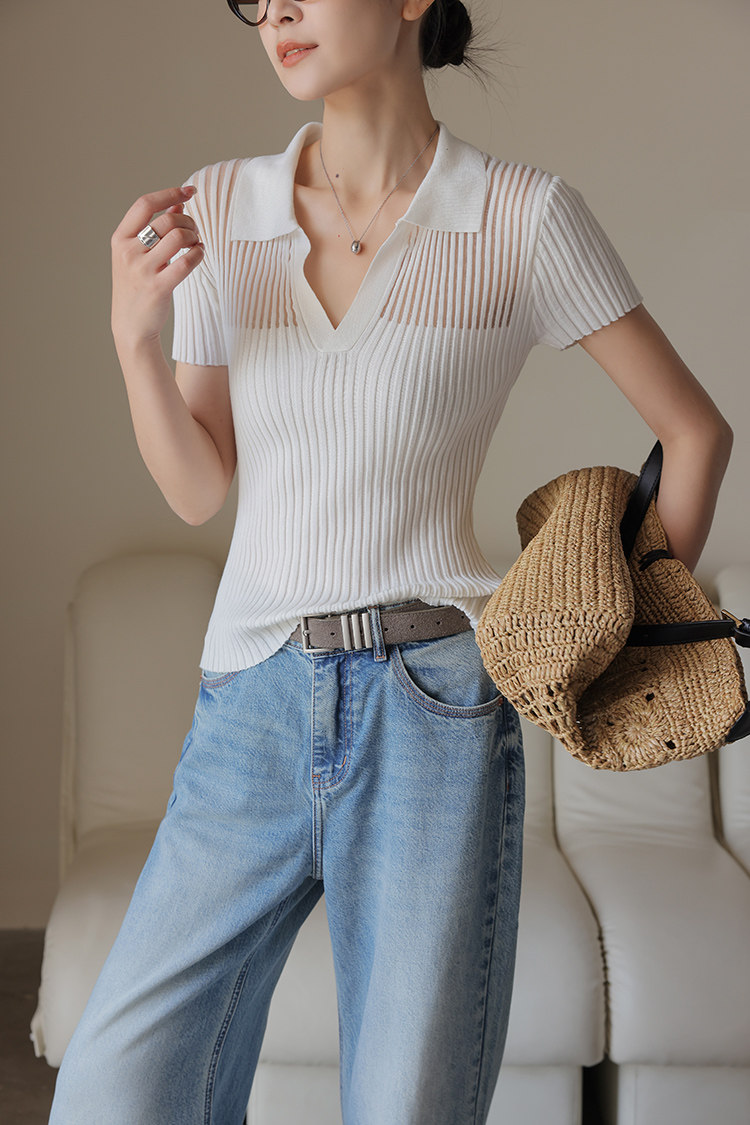 오래된 돈 바람 얼음 실크 POLO 칼라 니트 스웨터 여성 여름 차가운 센스 티셔츠 고급 센스 캐주얼 품격 슬림해 보이는 맨위