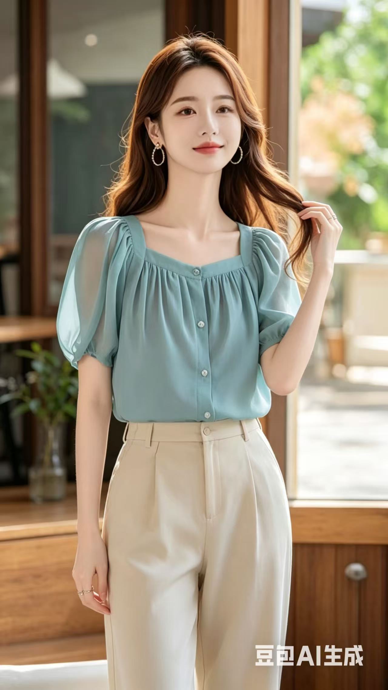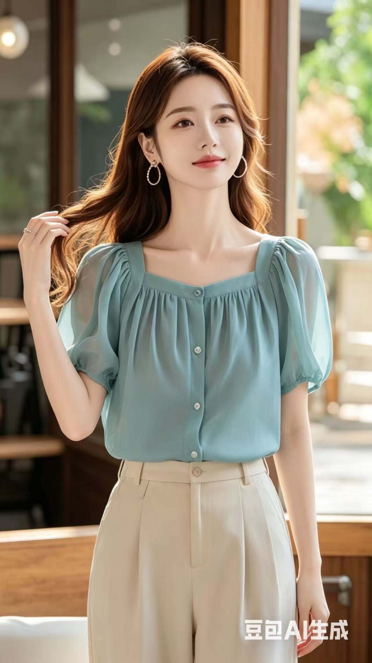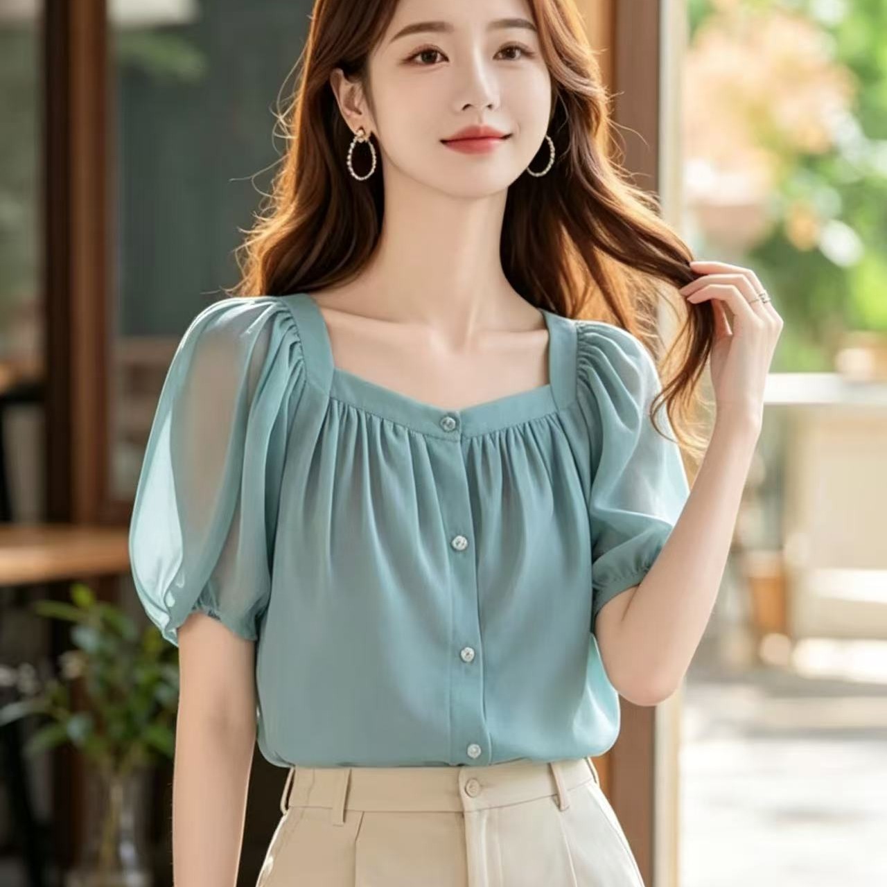 고유 한 Chic 아름다운 작은 셔츠 연령 감소 잘 생긴 ~ 중 파란색 반팔 여성 셔츠 여름 섹션 올해 인기 쉬폰 톱