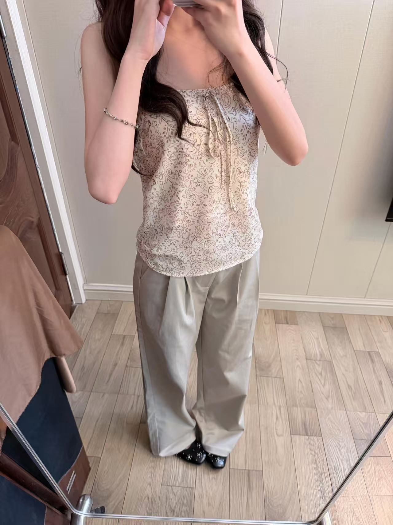 레트로 브라운 꽃무늬 밴딩 와이드 레깅스 바지 여름 느긋한 느슨함 센스 루즈핏 슬림해 보이는 스트레이트 팬츠